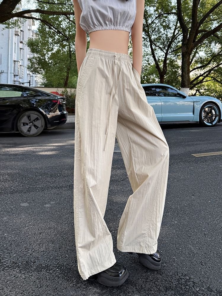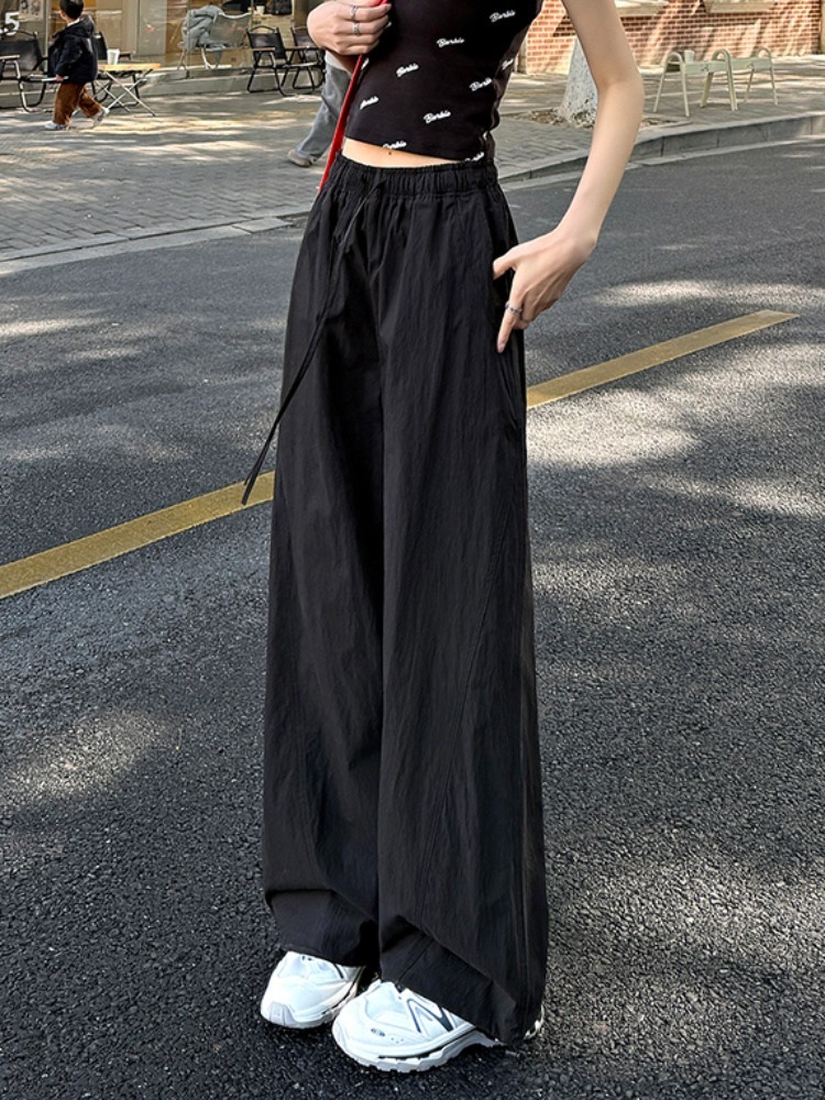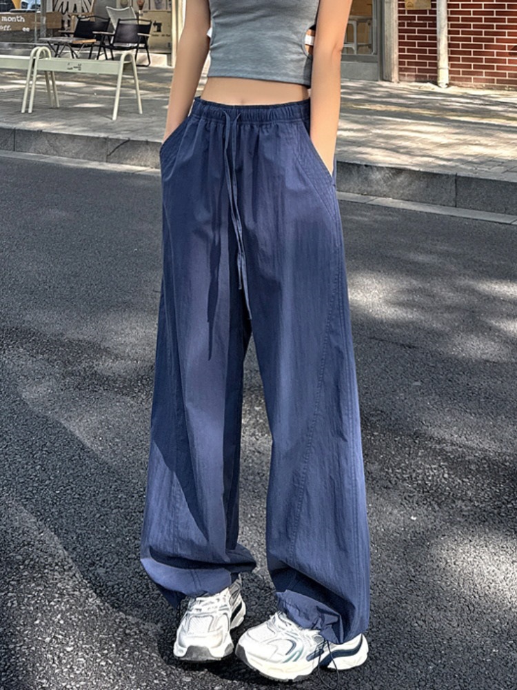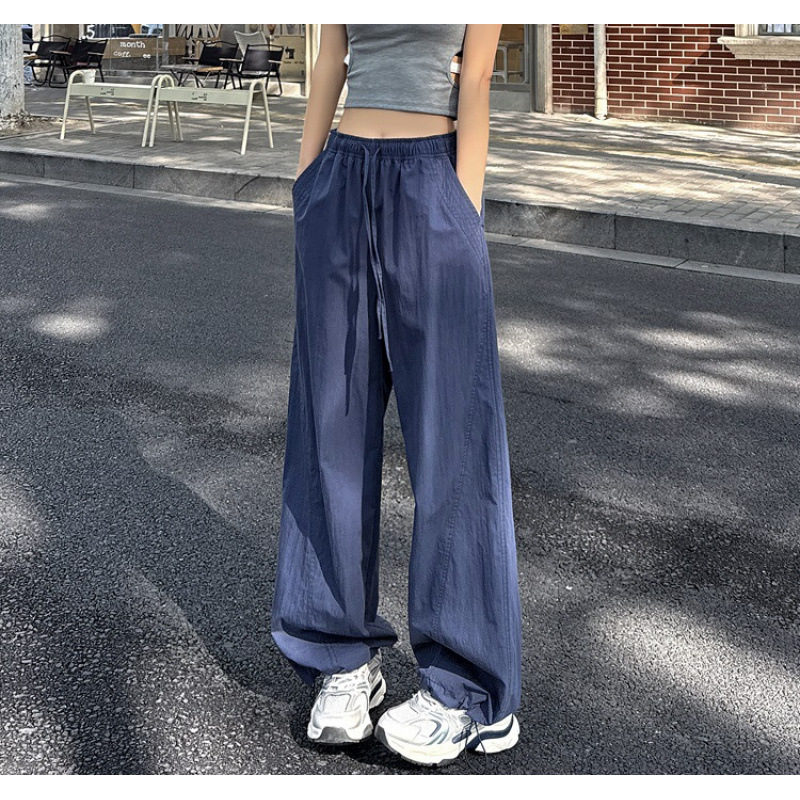 여성용 네이비 블루 속건성 작업복 봄 여름 하이 웨이스트 드레이프 루즈 캐주얼 와이드 레그 팬츠 드로스트링 레깅스 스웨트 팬츠스토어 가기