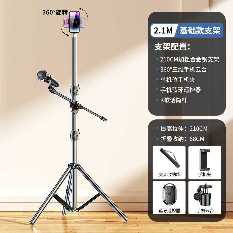 • 2.1m [업그레이드된 합금 스탠드] 마이크 스탠드 + 싱글 카메라 + 셀카 + 수납가방
