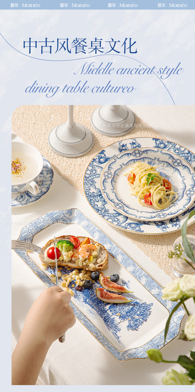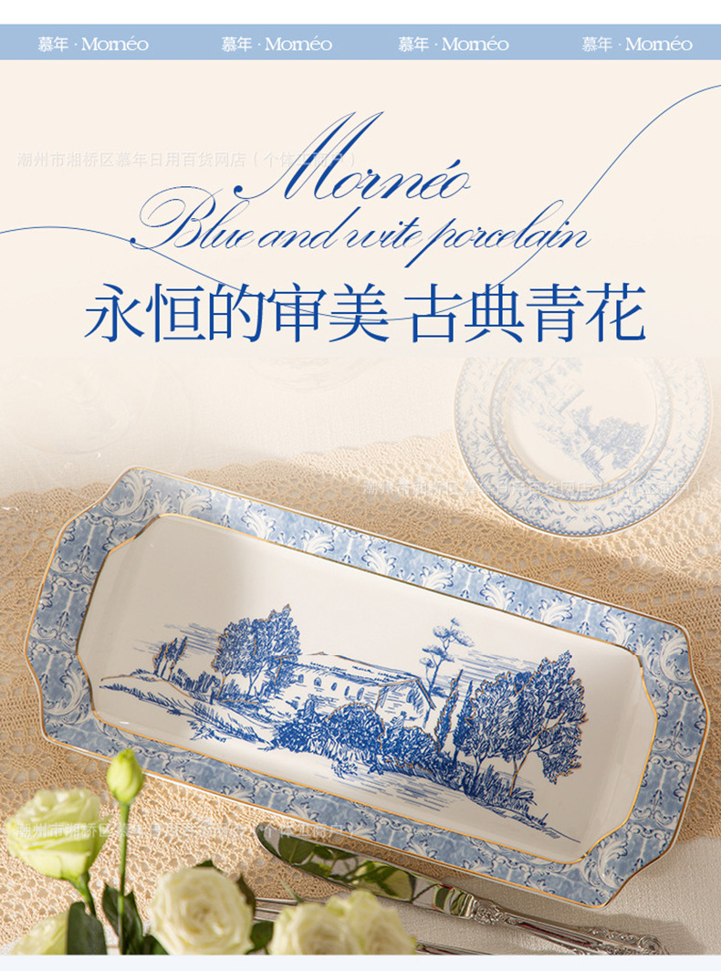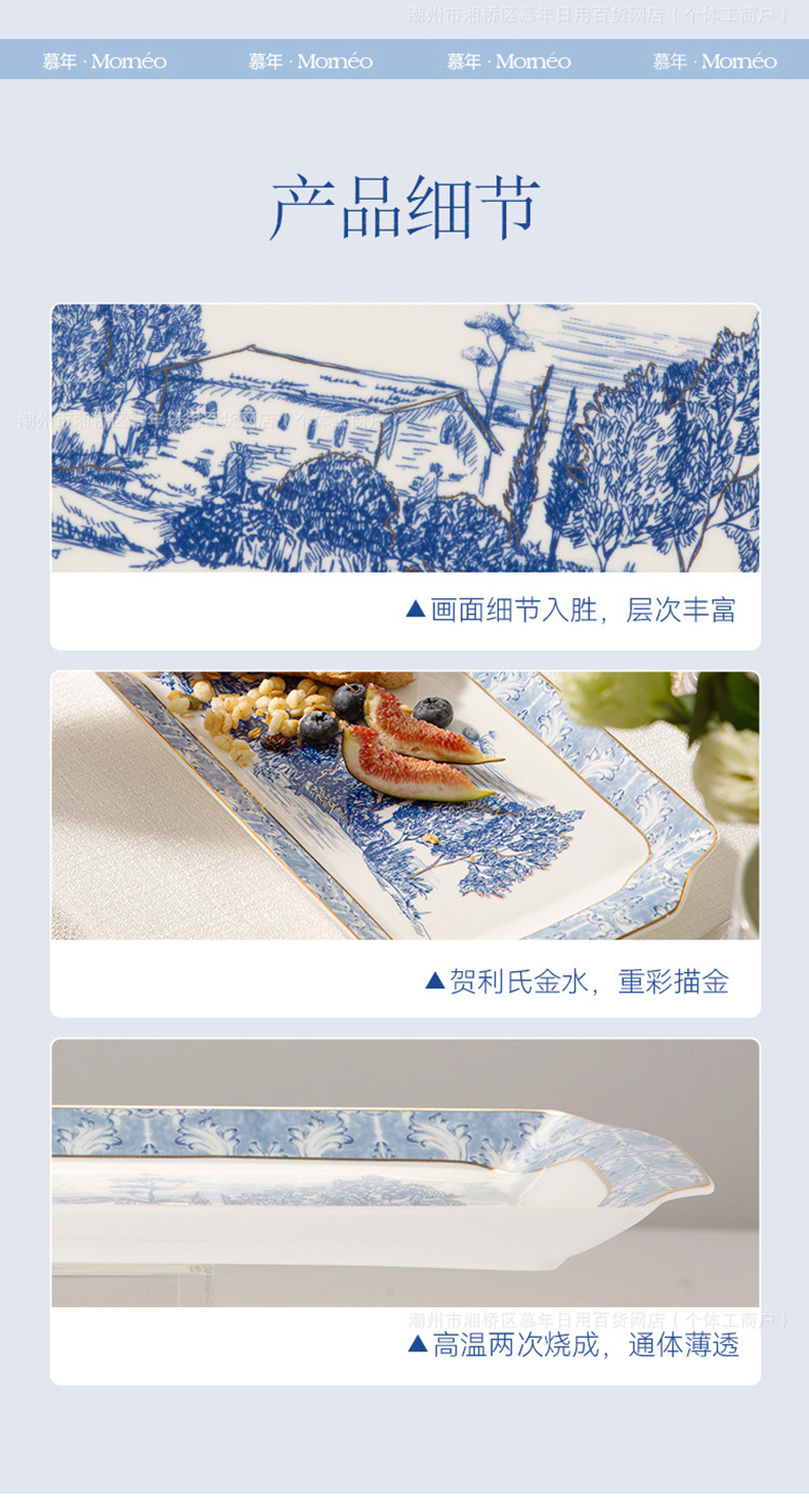 유럽식 터키 스타일의 고전적인 파란색과 흰색 금색 직사각형 케이크 접시 호텔 레스토랑 과일 접시 커피 숍 디저트 접시스토어 가기