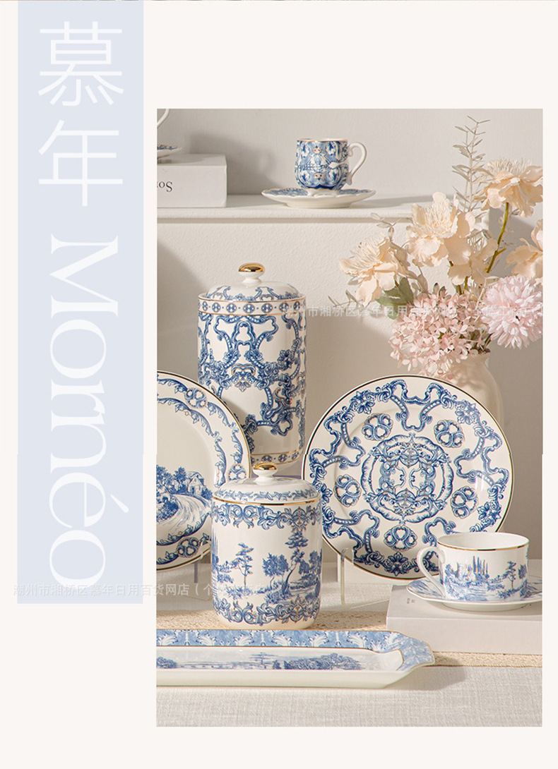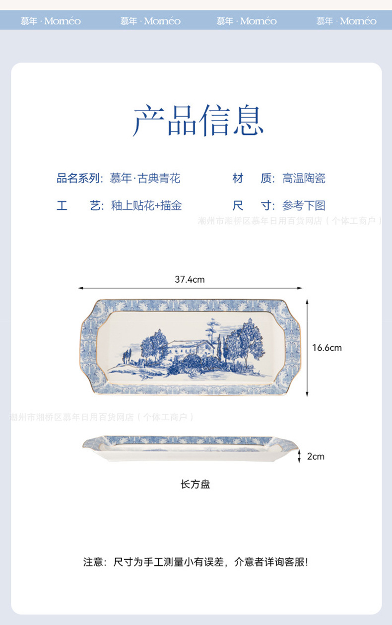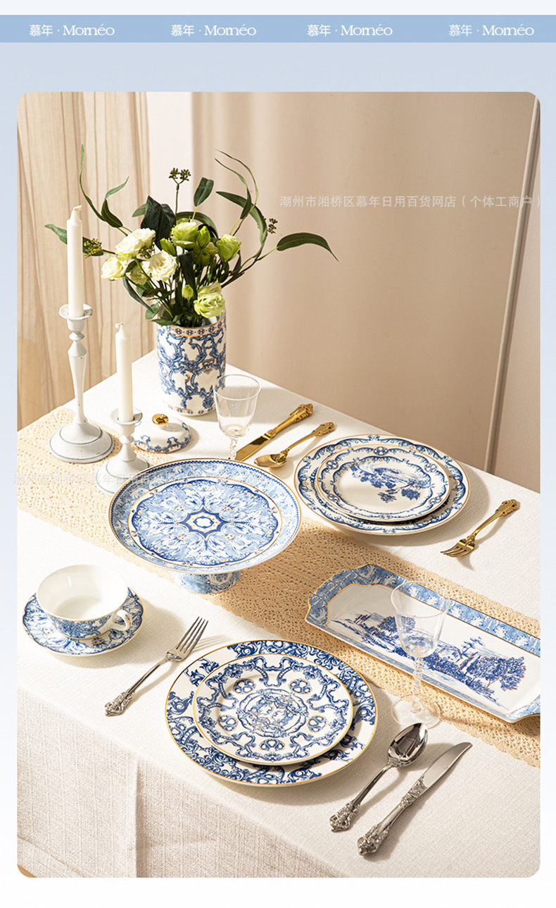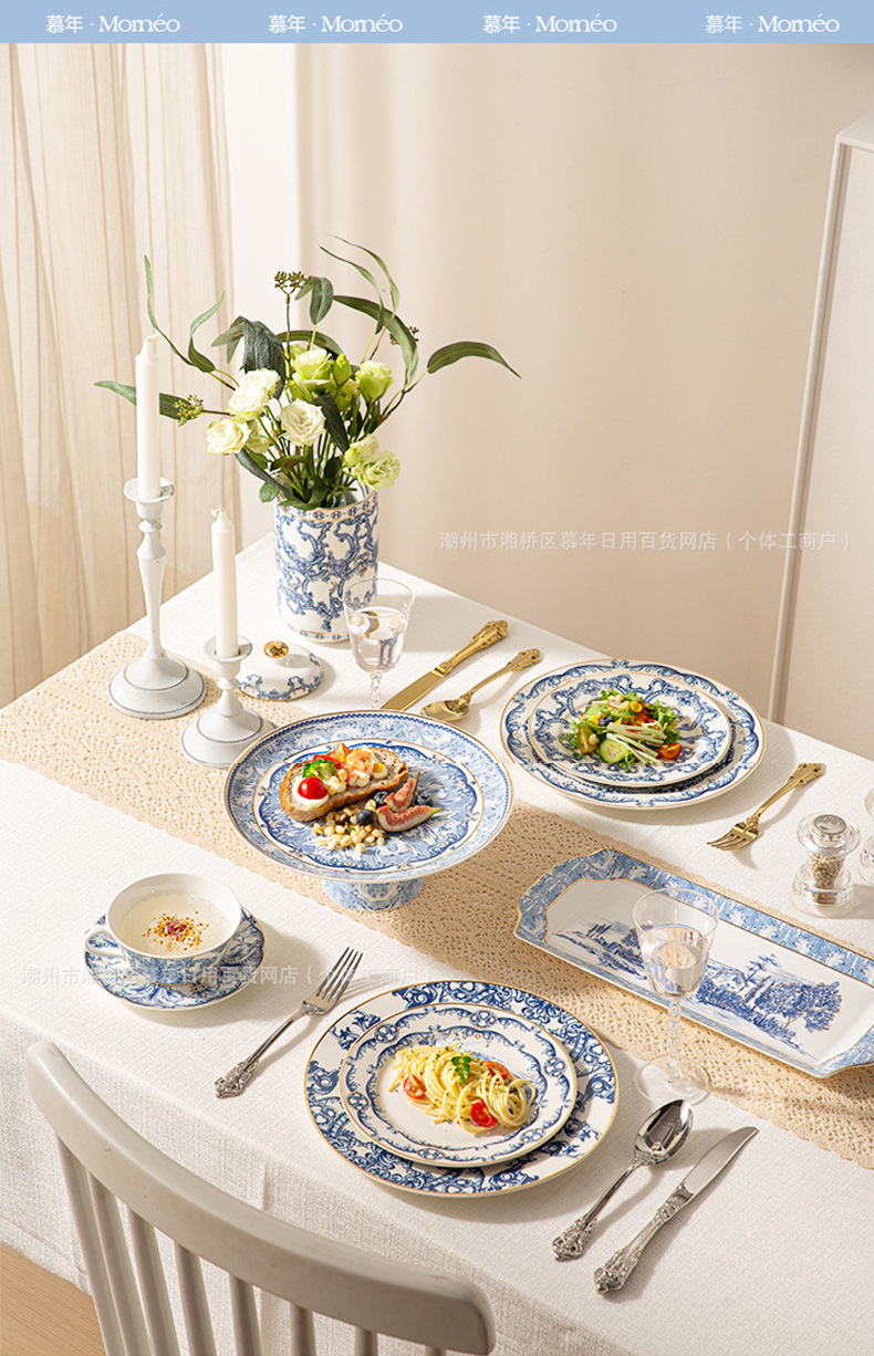 유럽식 터키 스타일의 고전적인 파란색과 흰색 금색 직사각형 케이크 접시 호텔 레스토랑 과일 접시 커피 숍 디저트 접시스토어 가기