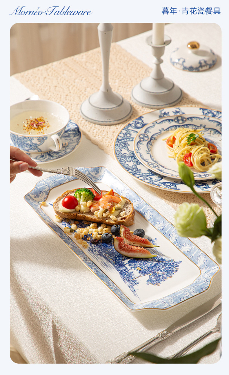 유럽식 터키 스타일의 고전적인 파란색과 흰색 금색 직사각형 케이크 접시 호텔 레스토랑 과일 접시 커피 숍 디저트 접시
