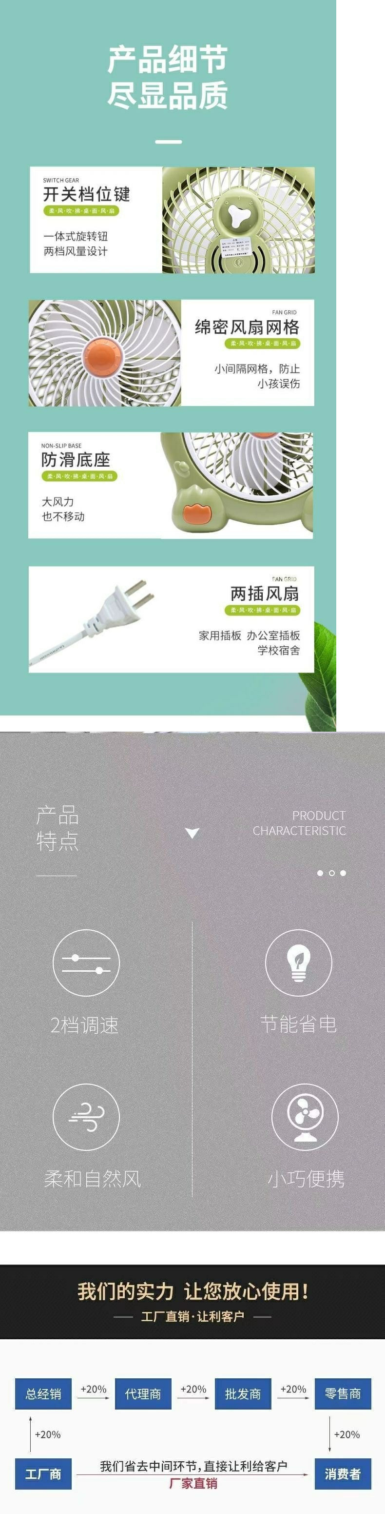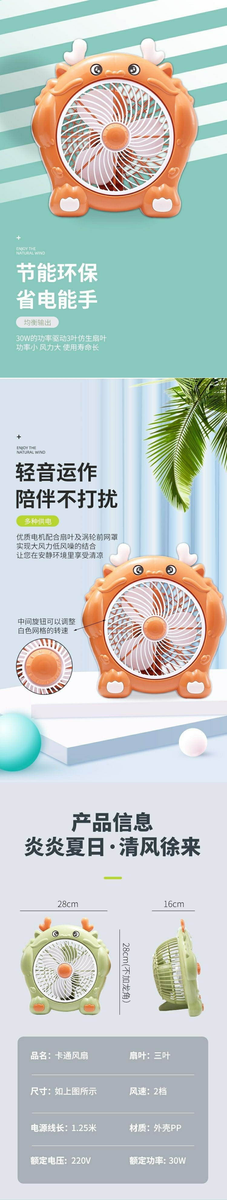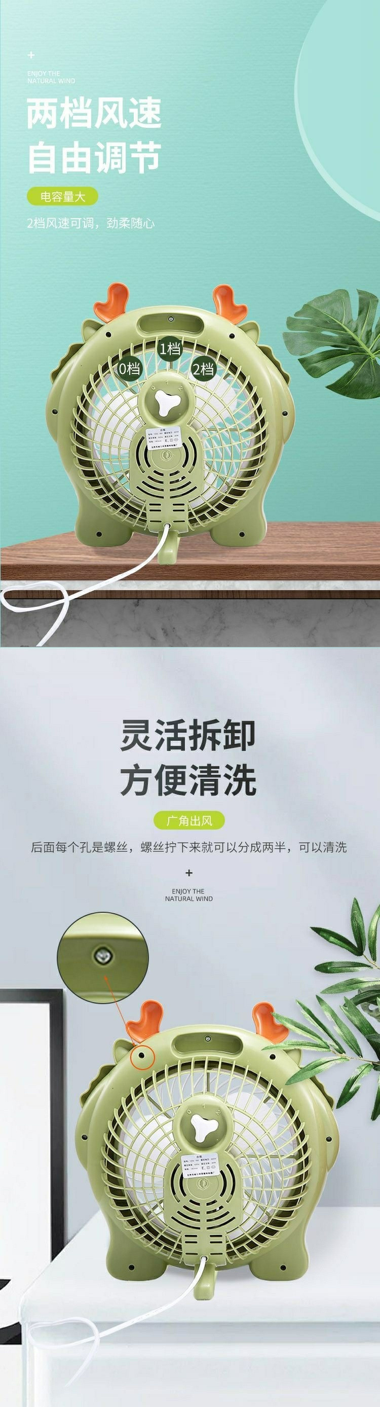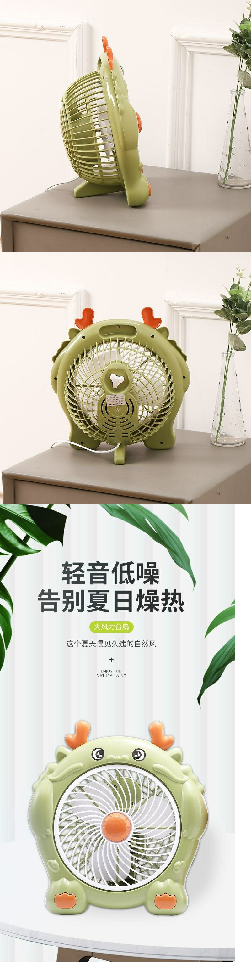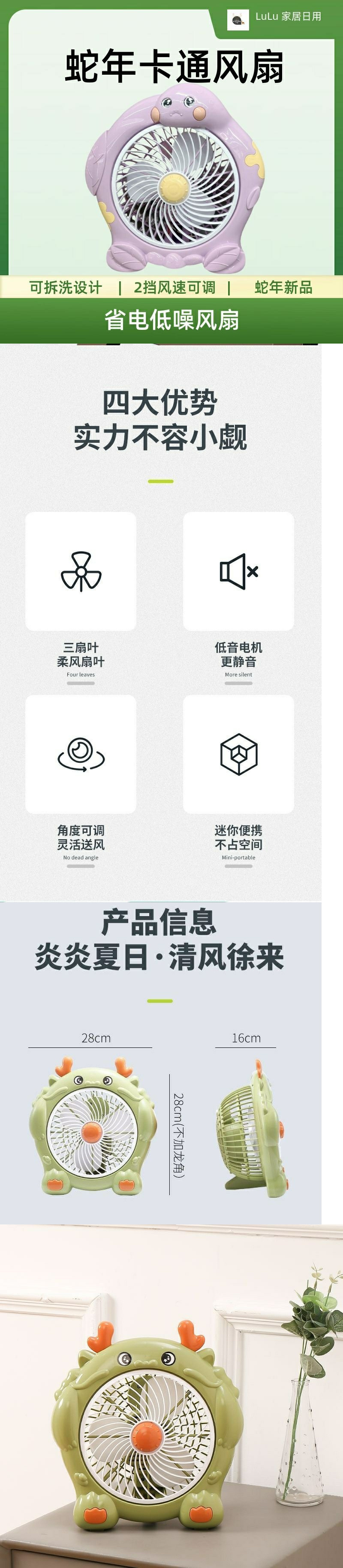 可爱小台扇,吹走夏日沉闷! 在燥热的午后,你是否渴望有一抹清凉温柔拂过?这款卡通小型台式电风扇,就是你寻找的夏日救星! 虽然身形小巧,却有着大大的能量。两档风力自由切换,一档风力适中,快速带走闷热,让工作学习不再被暑气干扰;二档强劲风力,瞬间带来满满凉意,让你在炎热夏日也能清爽自在。 直流静音电机,运行平稳,噪音低至25分贝,安静守护你的时光,不打扰你的思绪。台面上随意摆放,不占空间,电源线足够长,使用场景不受限。有了它,炎炎夏日也能活力满满,快带它回家,开启清凉一夏!