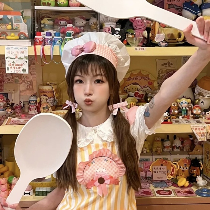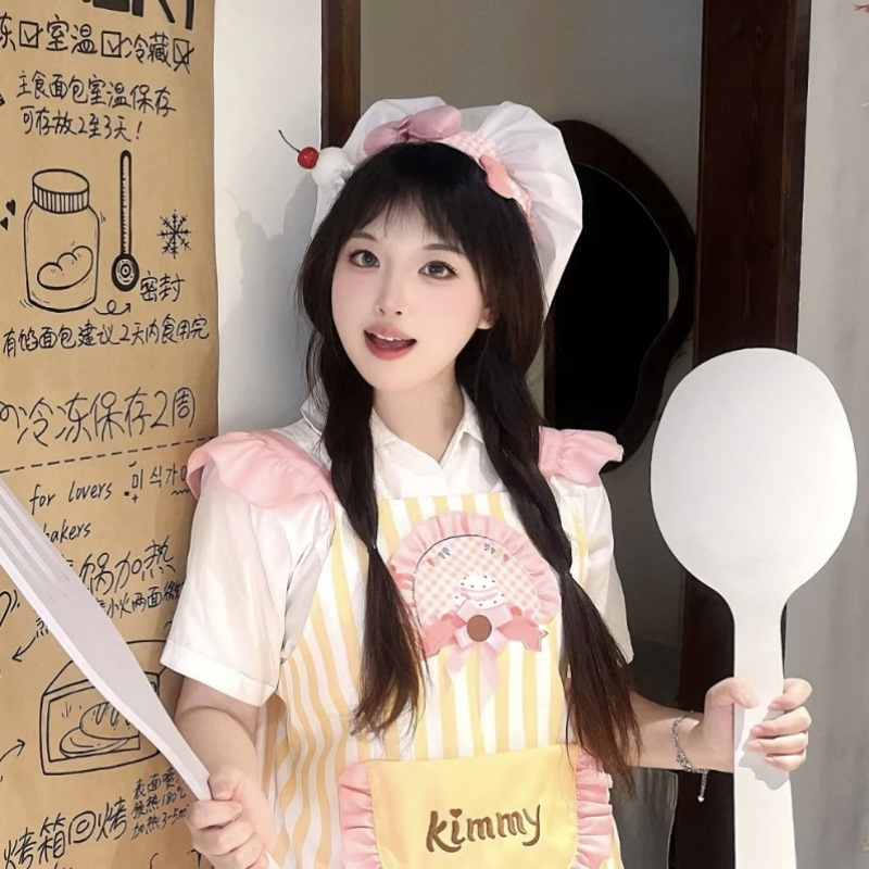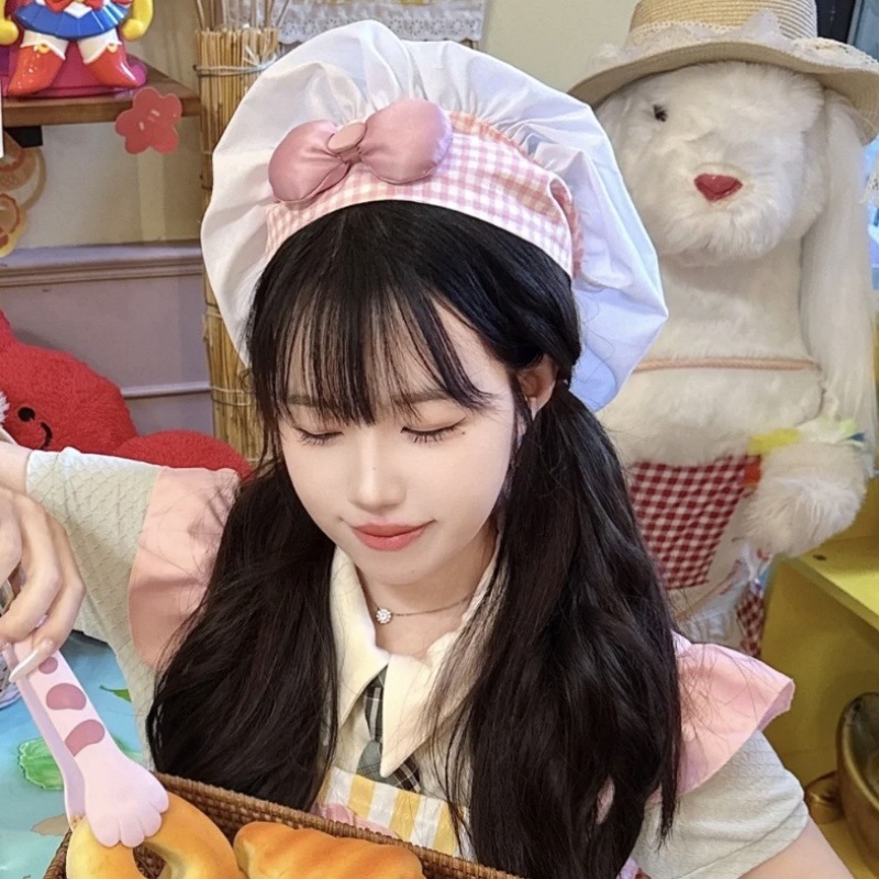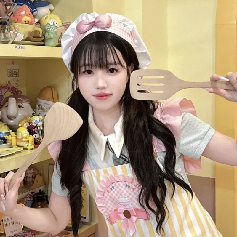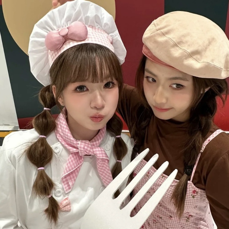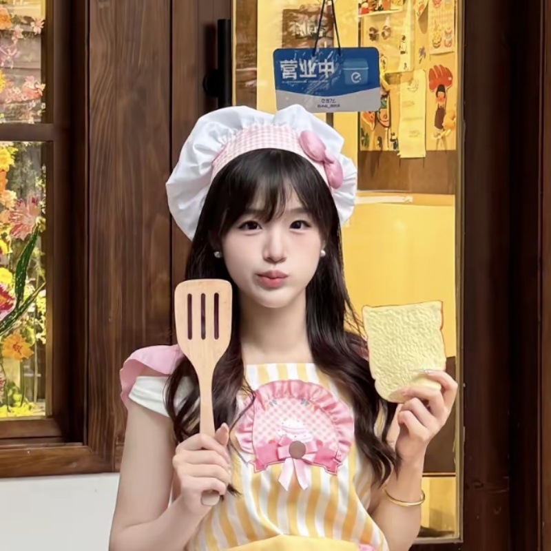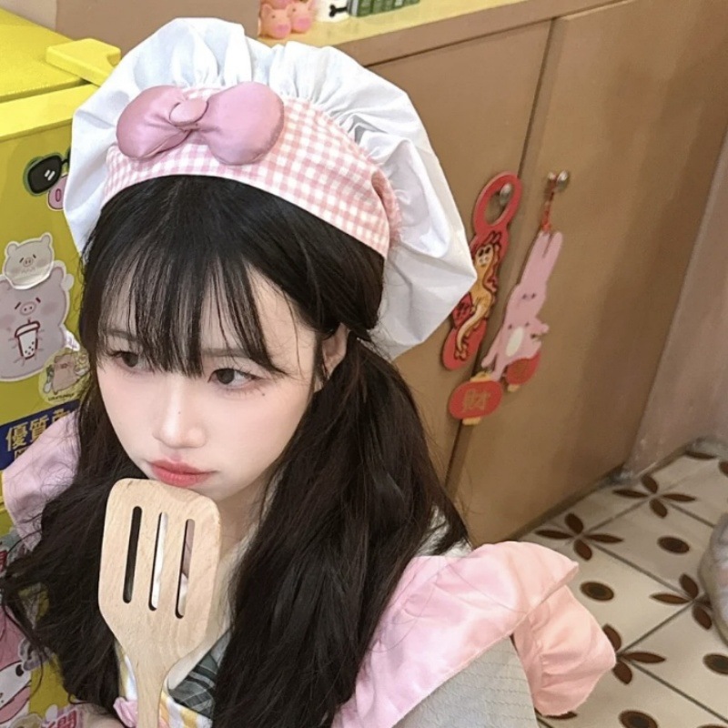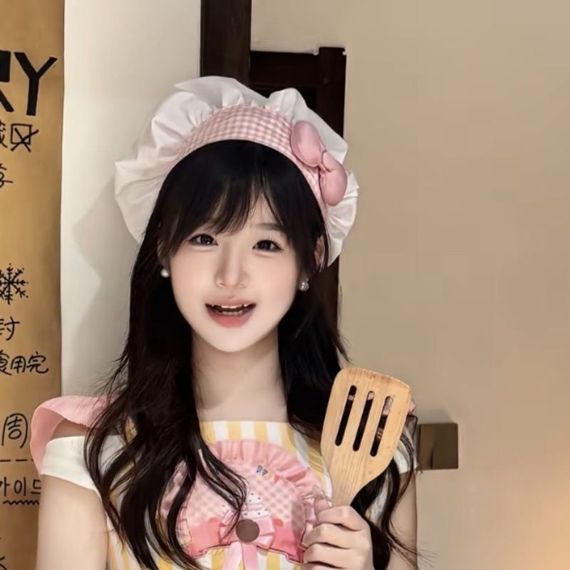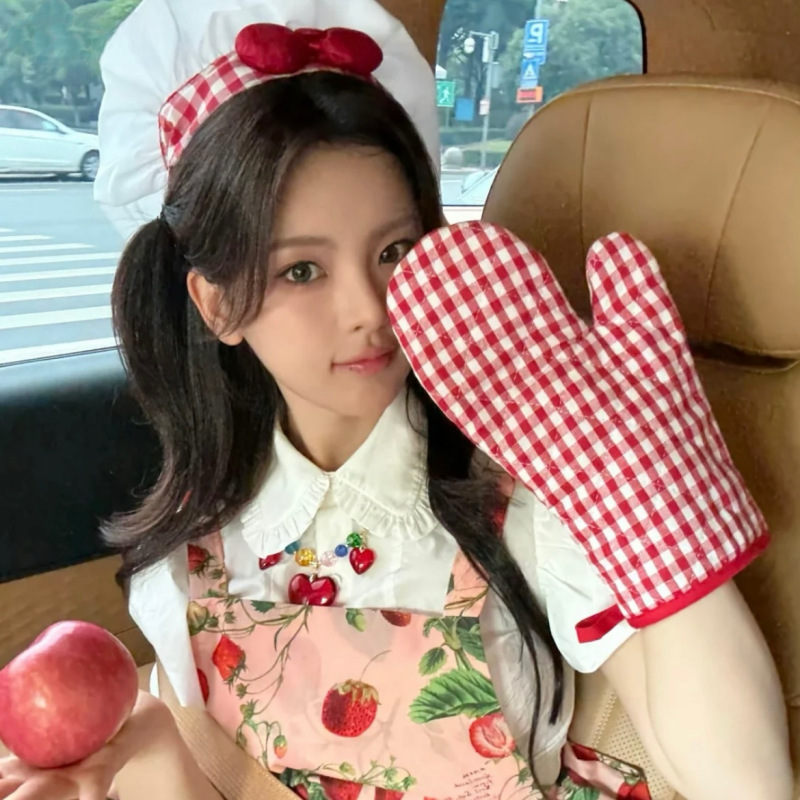 • 붉은 격자 무늬 리본 요리사 모자 + 격자 무늬 장갑