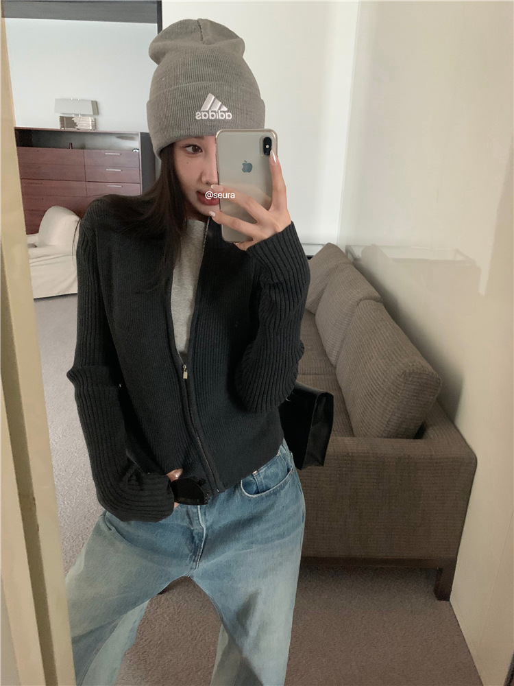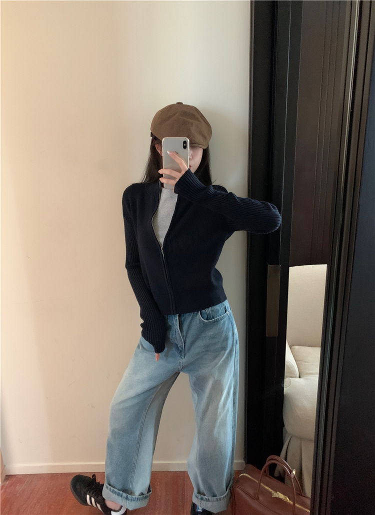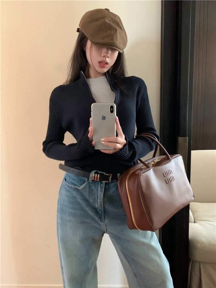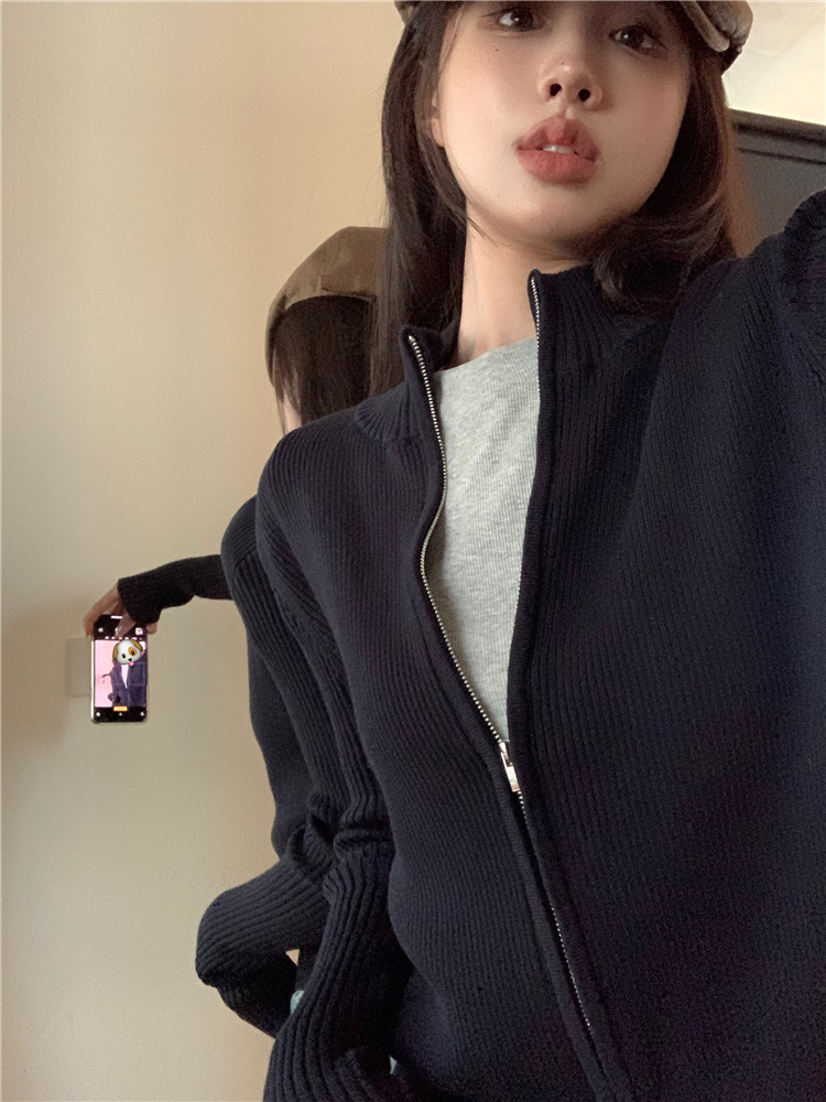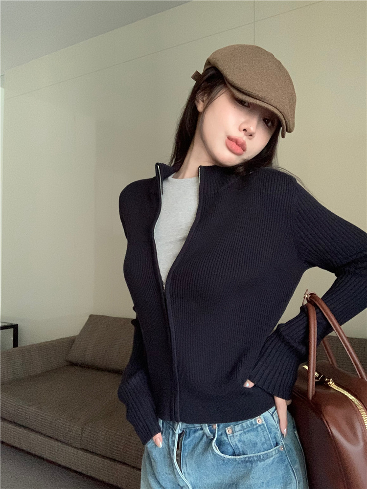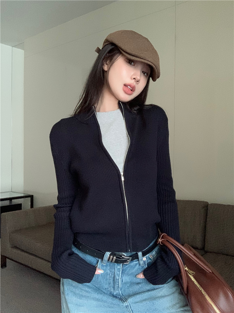 가을 여성용 네이비 블루 카디건 재킷, 슬림핏 이너웨어, 긴팔 소프트 왁시 지퍼 니트 스웨터, 니치 탑스토어 가기