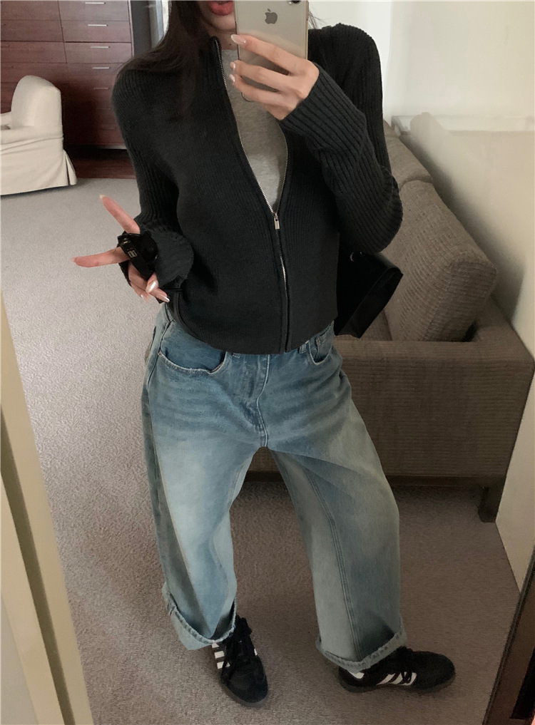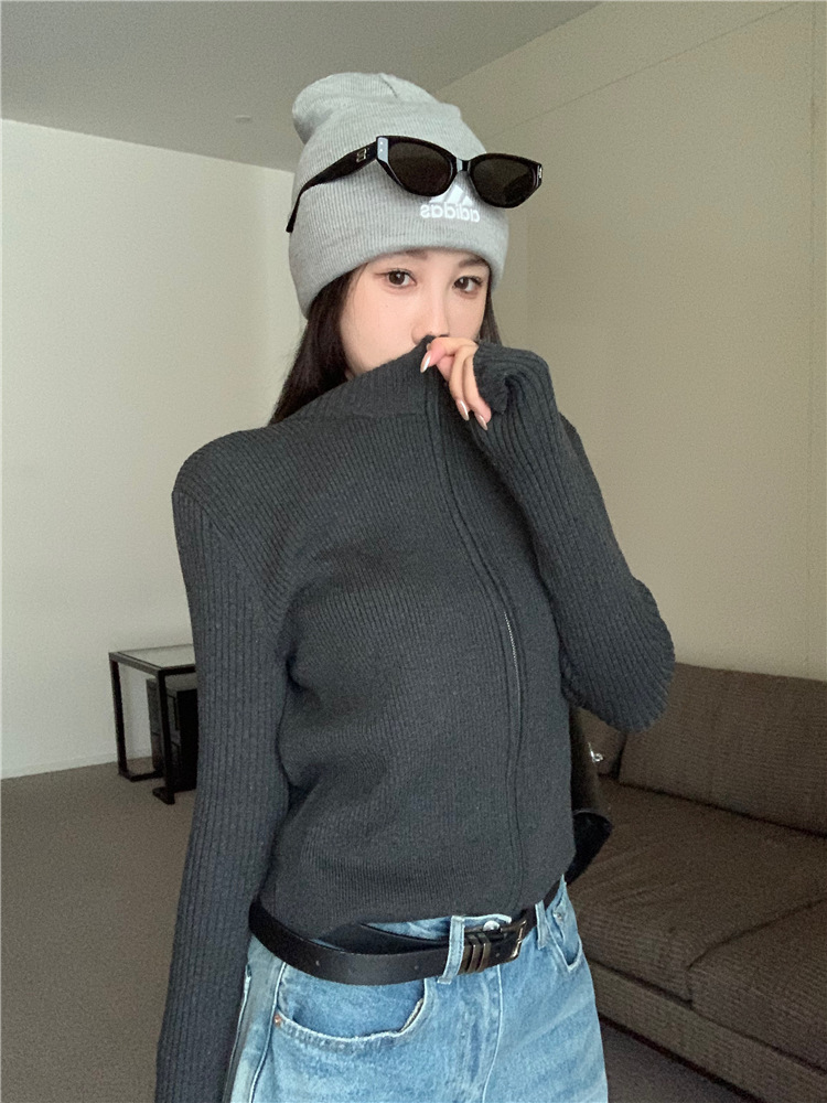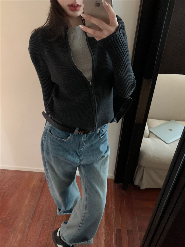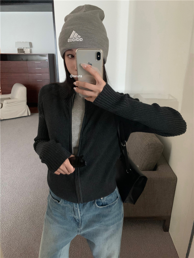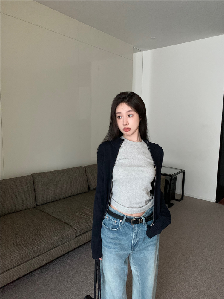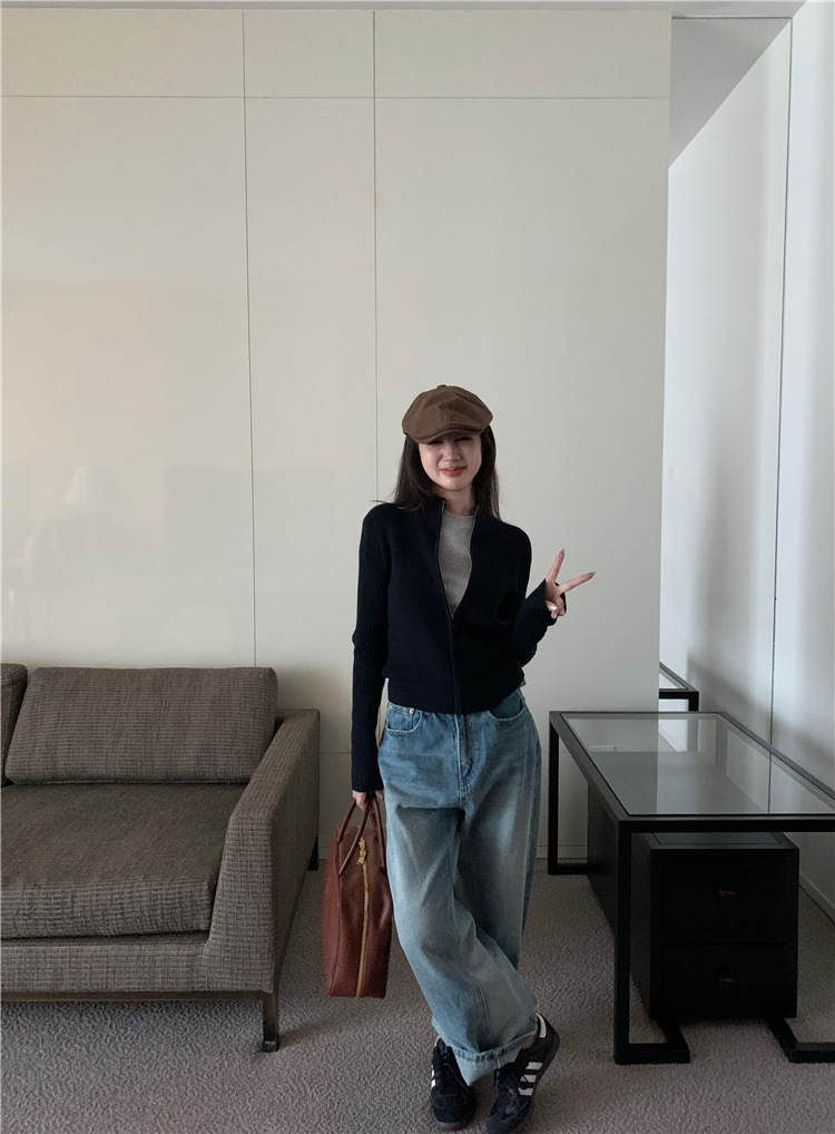 가을 여성용 네이비 블루 카디건 재킷, 슬림핏 이너웨어, 긴팔 소프트 왁시 지퍼 니트 스웨터, 니치 탑스토어 가기