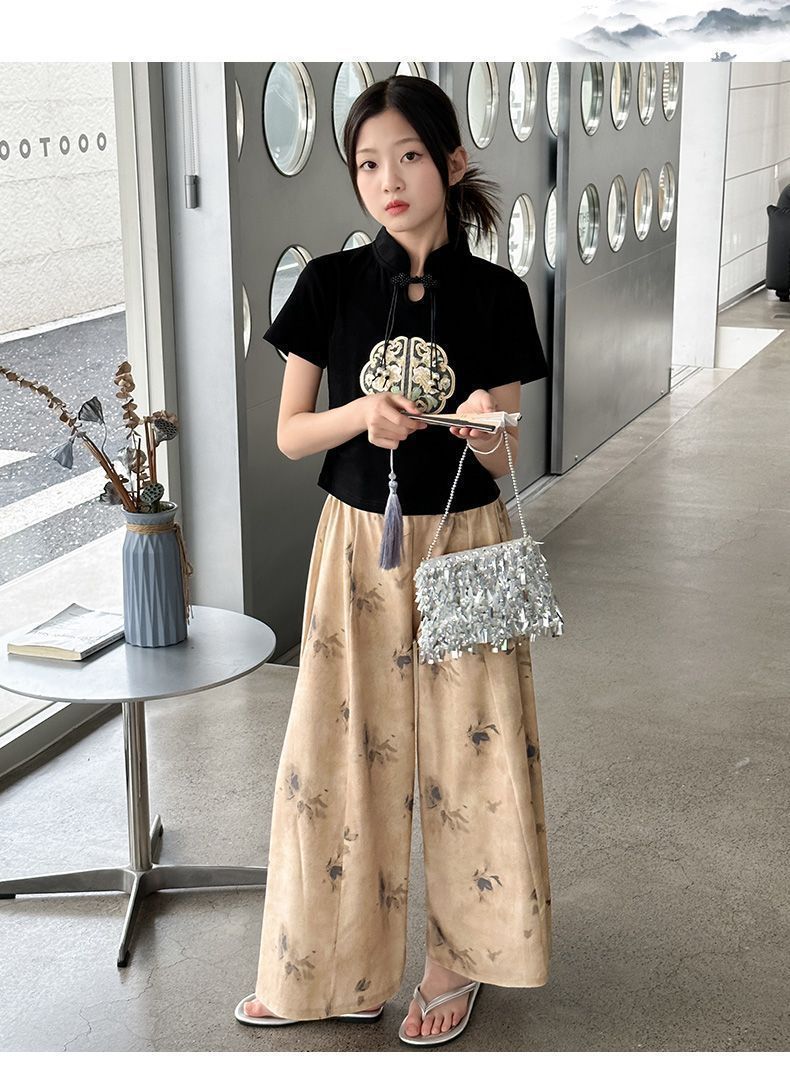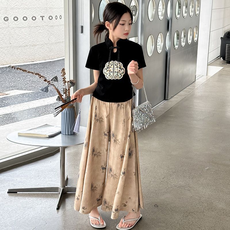 2025년 여름 신상 스타일 중국 스타일 탑 버튼 투피스 세트 여아용 중국식 반팔 슈트 여아용 와이드 팬츠