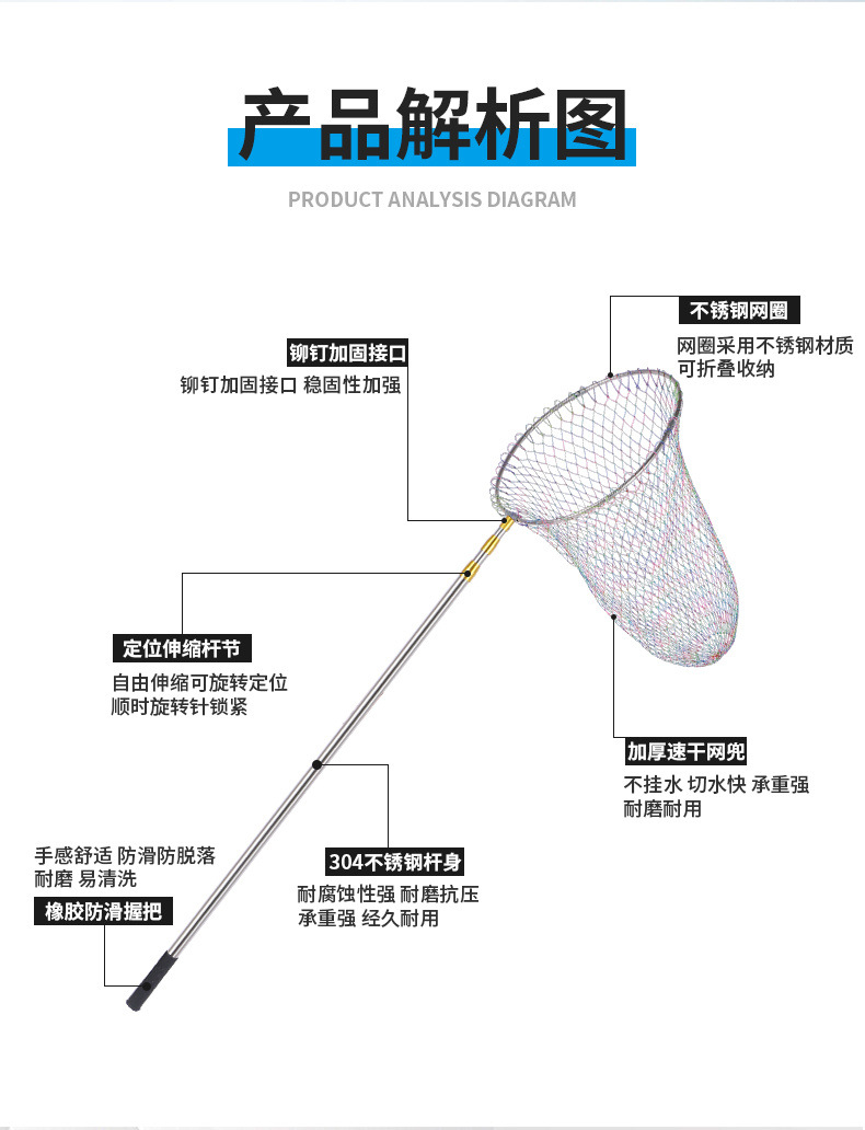 낚시 그물 풀 세트, 스테인레스 스틸 다기능 텔레스코픽 막대, 낚시 그물 포켓, Dali Ma 그물 헤드