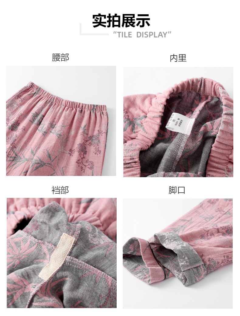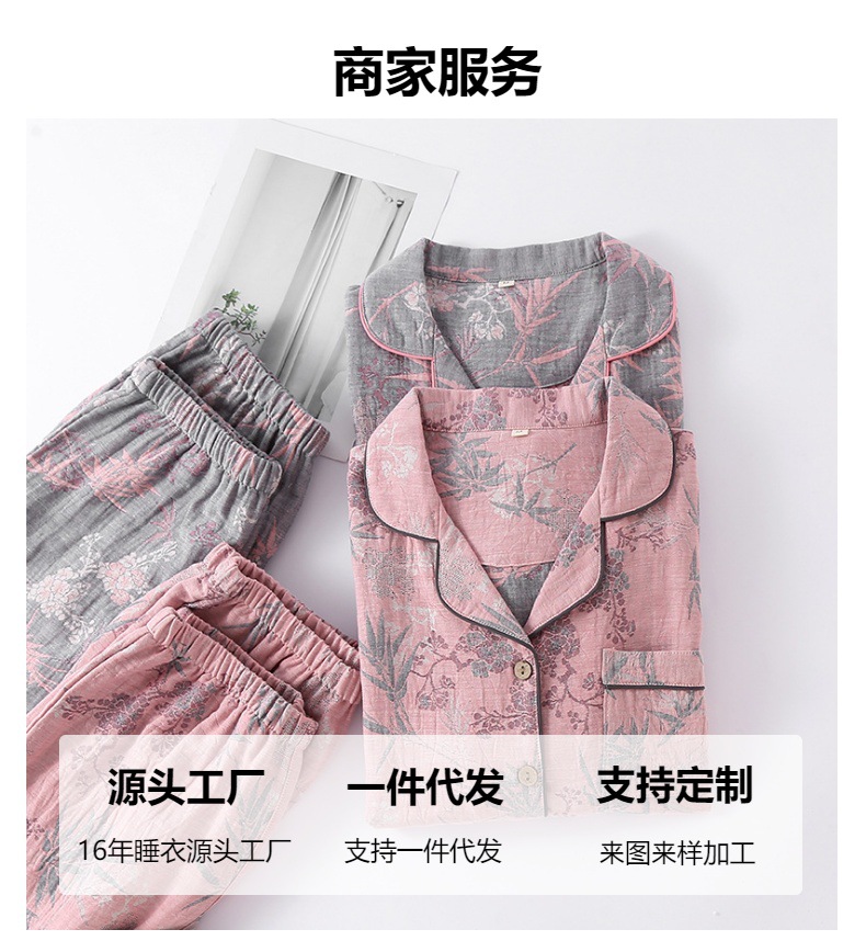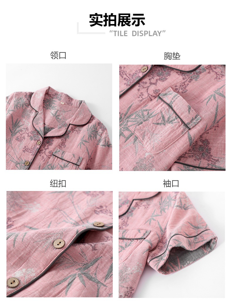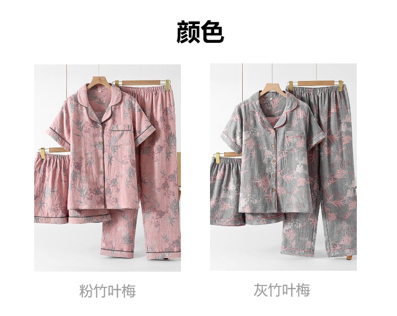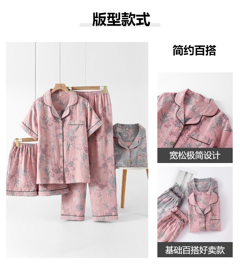 여성용 잠옷, 원사 염색 순면 자카드 봄 여름 이중 원사 홈 라펠 반팔 바지 반바지 3피스 홈웨어 세트스토어 가기