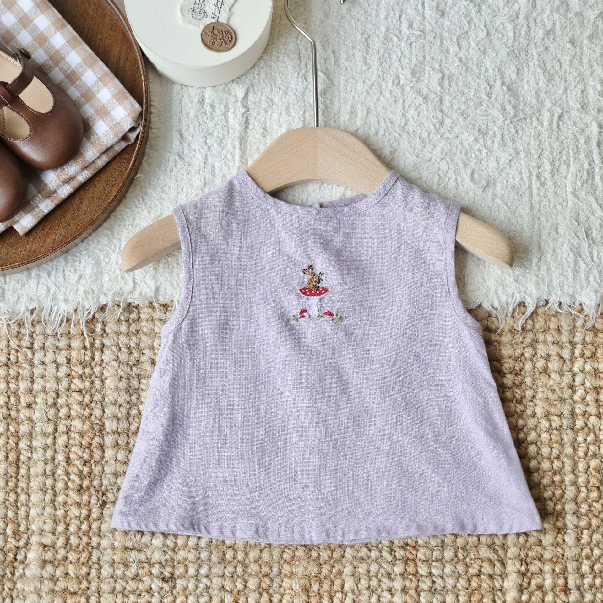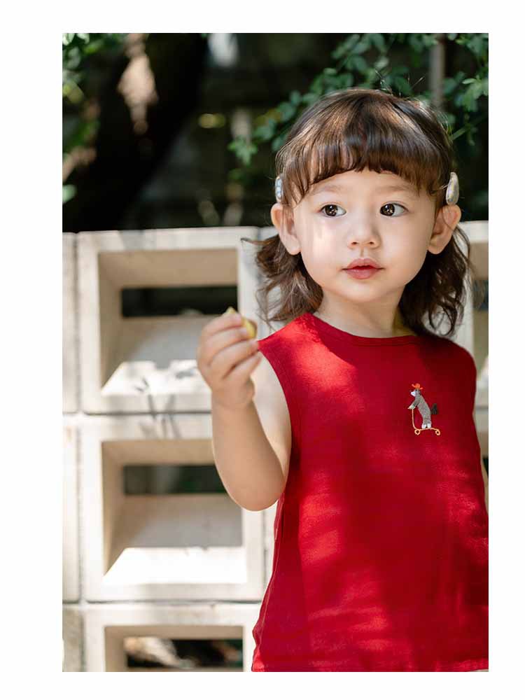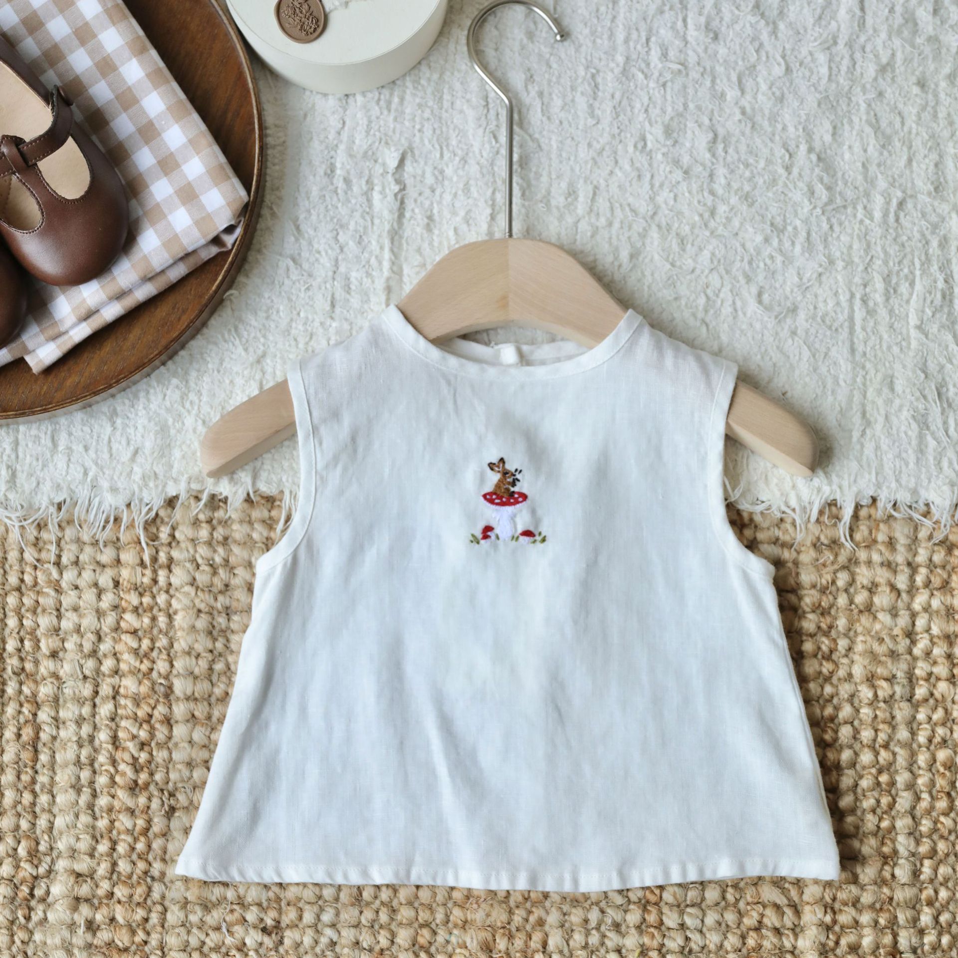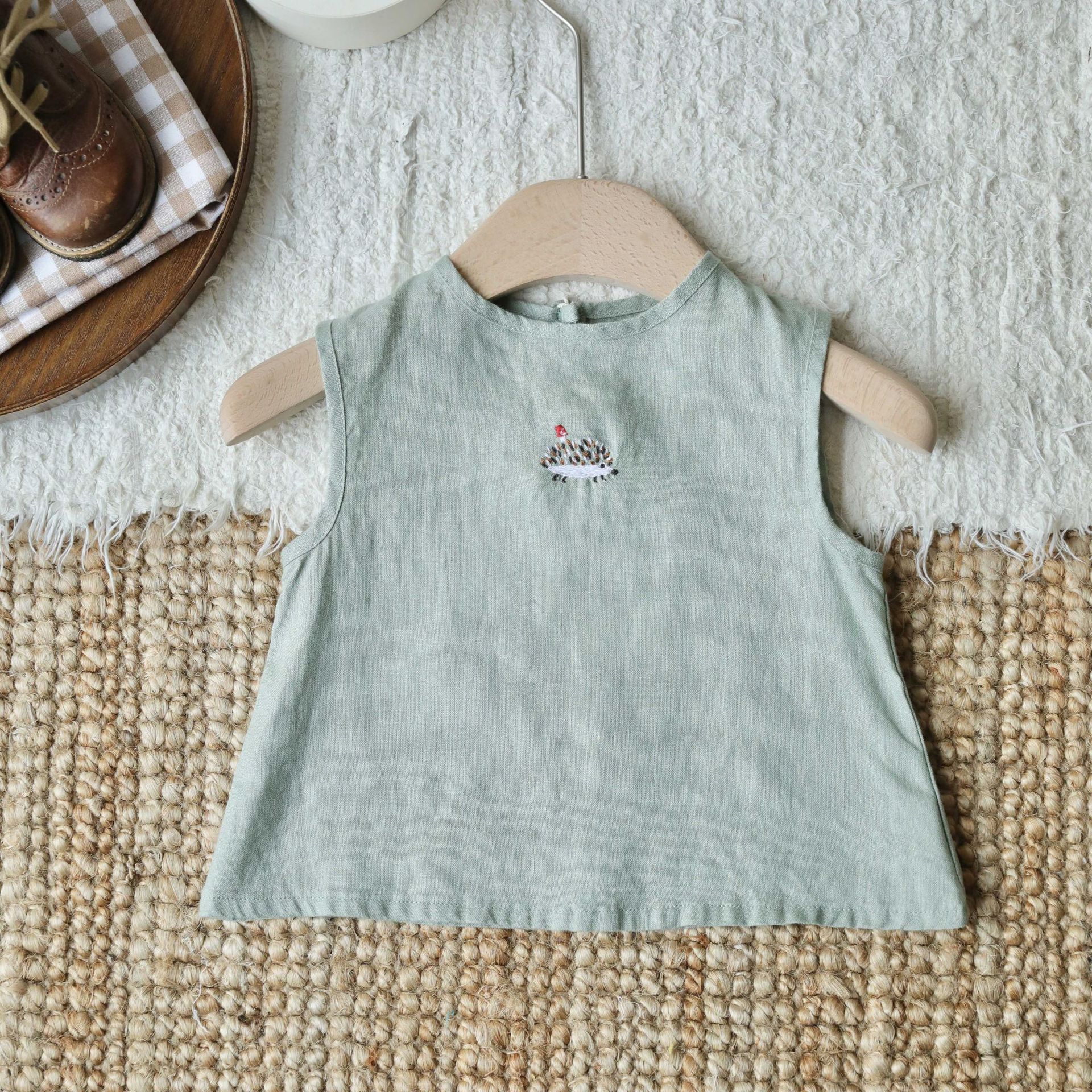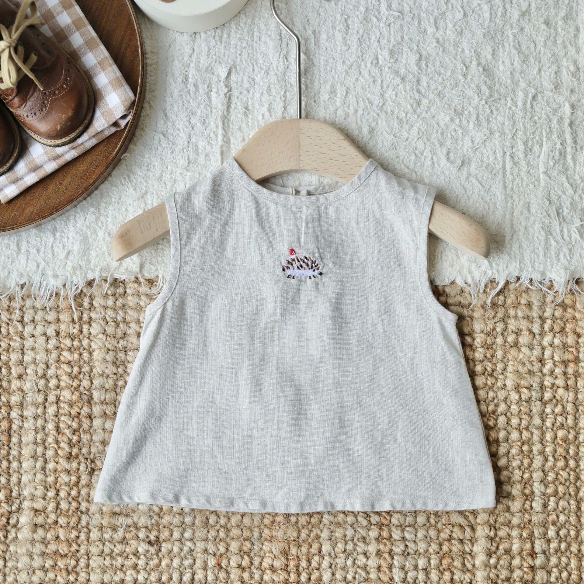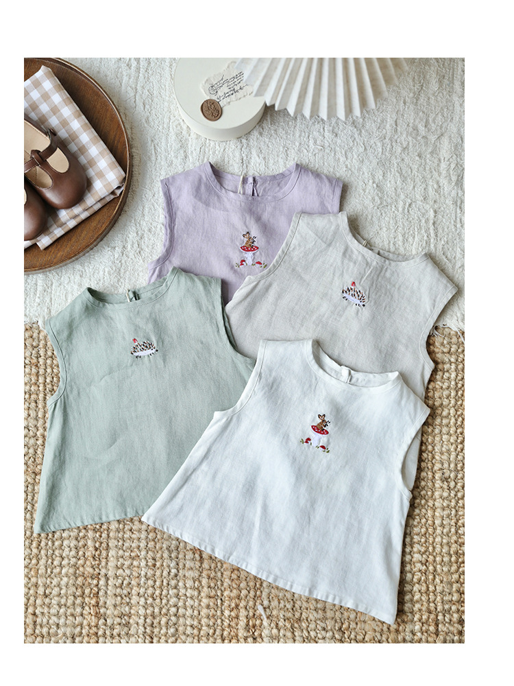 작은 앨리스 여름 민소매 100% 린넨 조끼 어린이 얇은 수 놓은 소년과 소녀 솔리드 컬러 탑 조끼