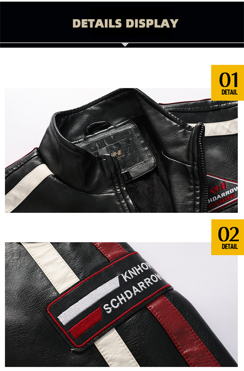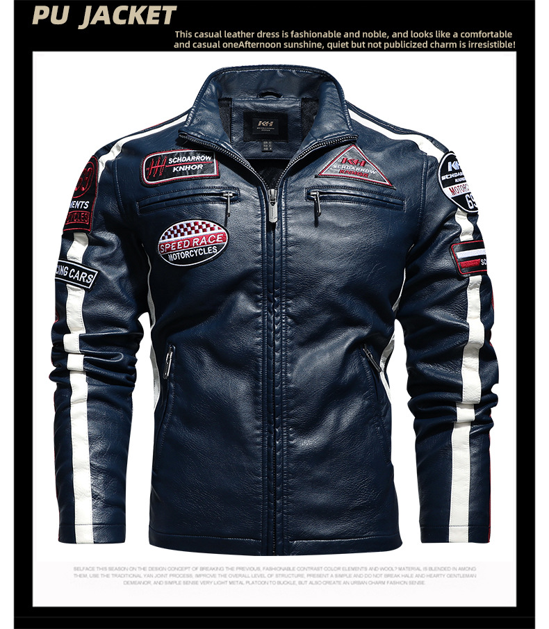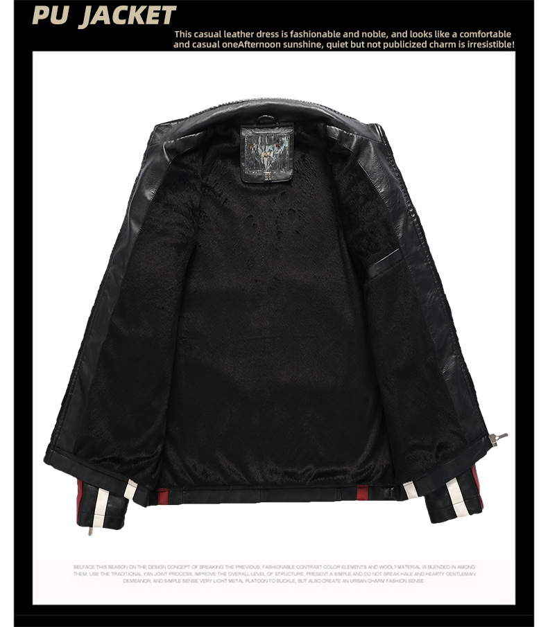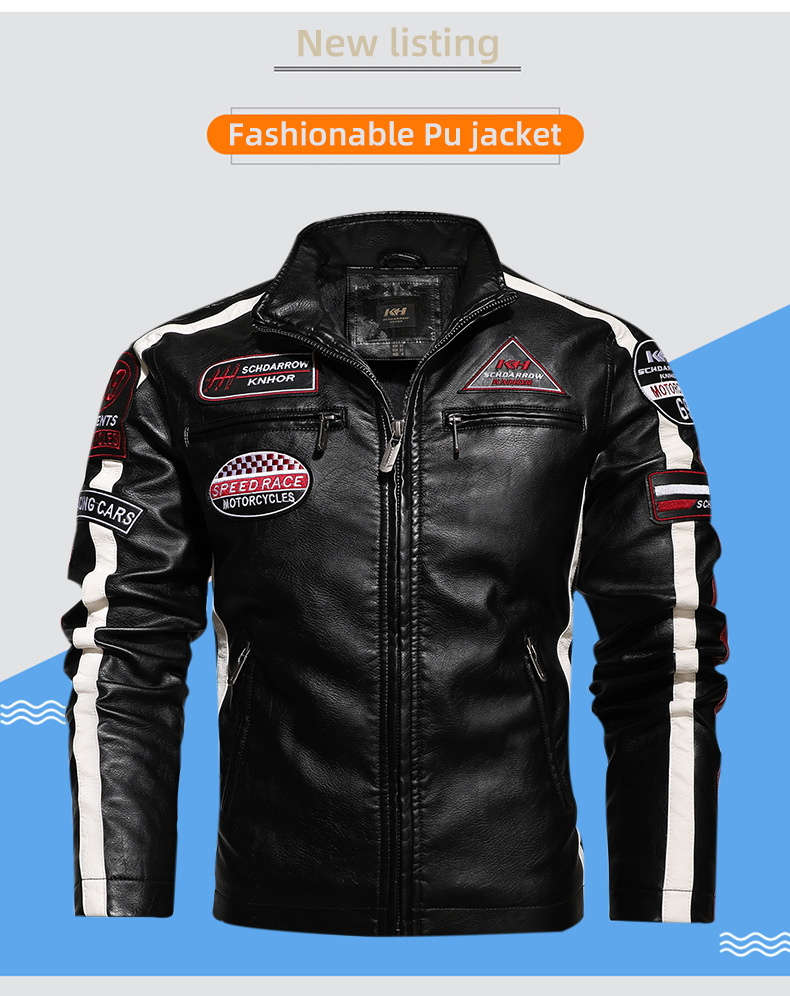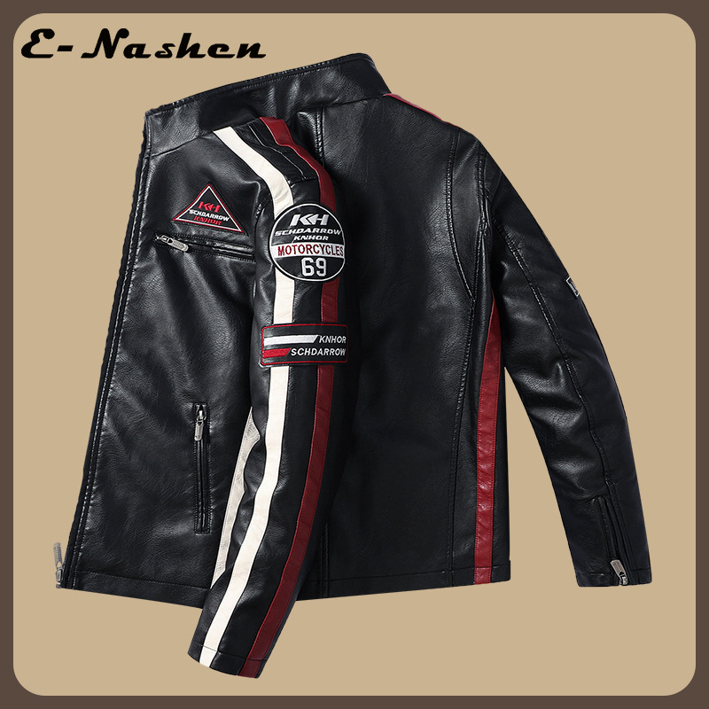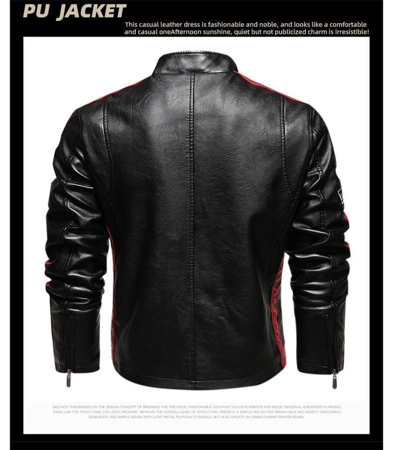 유럽과 미국의 대형 신형 남성용 PU 재킷 오토바이 레이싱 슈트 트렌디한 남성용 가죽 재킷 플러스 벨벳 얇은 라벨 대비 색상 재킷