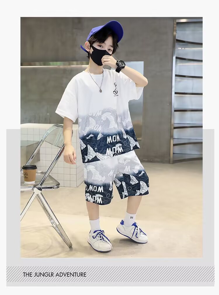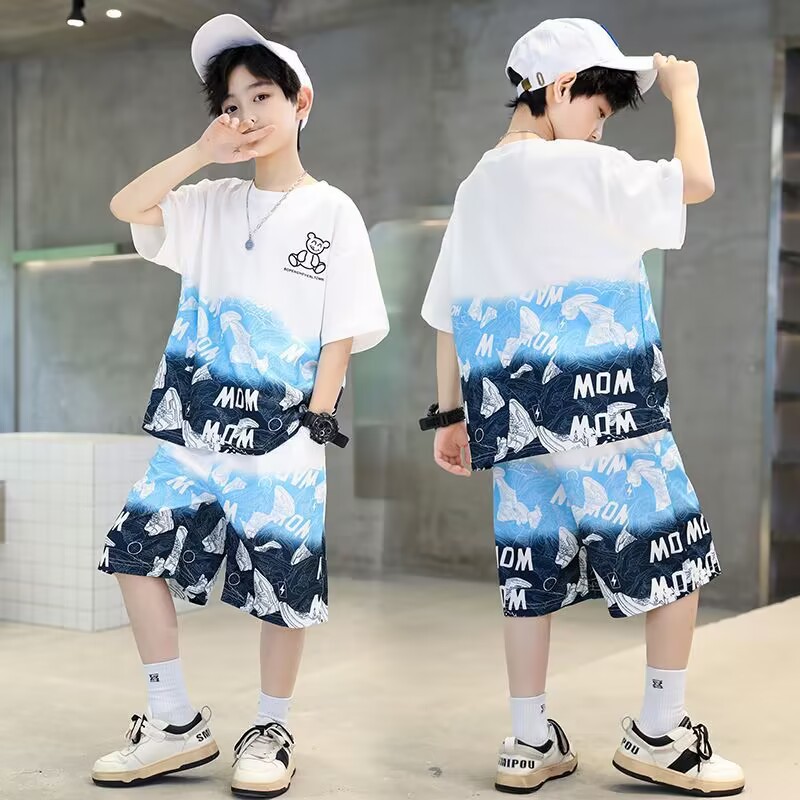 소년 여름 정장 유행 브랜드 티셔츠 반팔 반바지 그라데이션 색상 캐주얼 스포츠 의류 소년과 어린이를위한 투피스 세트