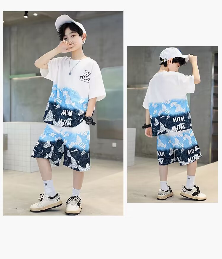 소년 여름 정장 유행 브랜드 티셔츠 반팔 반바지 그라데이션 색상 캐주얼 스포츠 의류 소년과 어린이를위한 투피스 세트스토어 가기