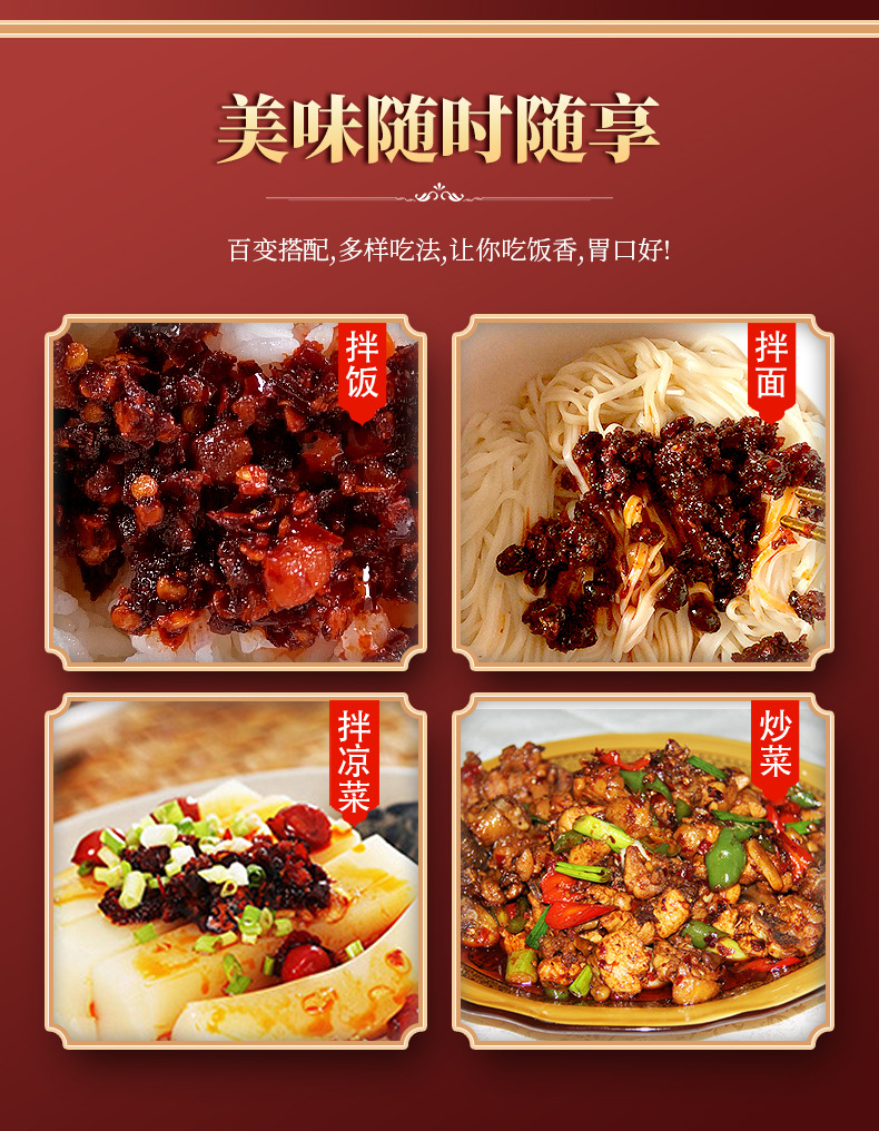 라오간마오맛 콩장아리, 닭고기기름, 고추, 삼각쇠고기, 버섯소스, 붉은 두부, 물바삭한 요리