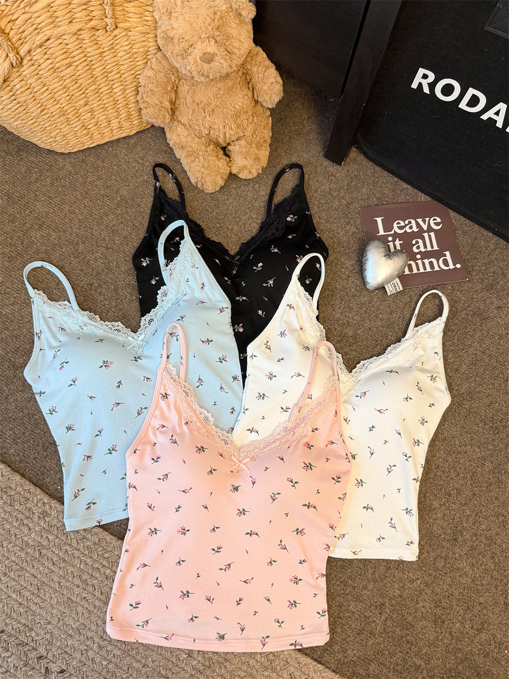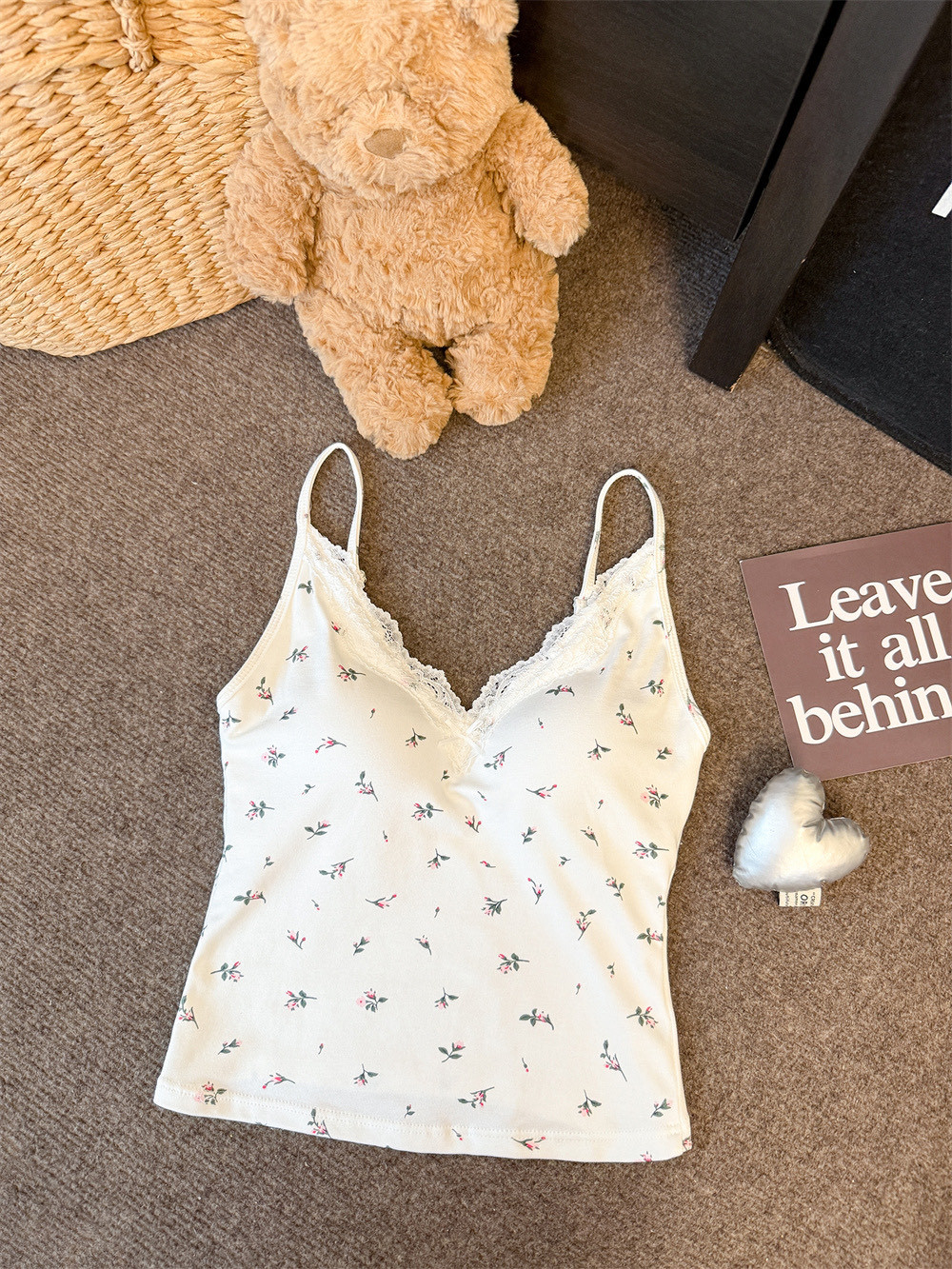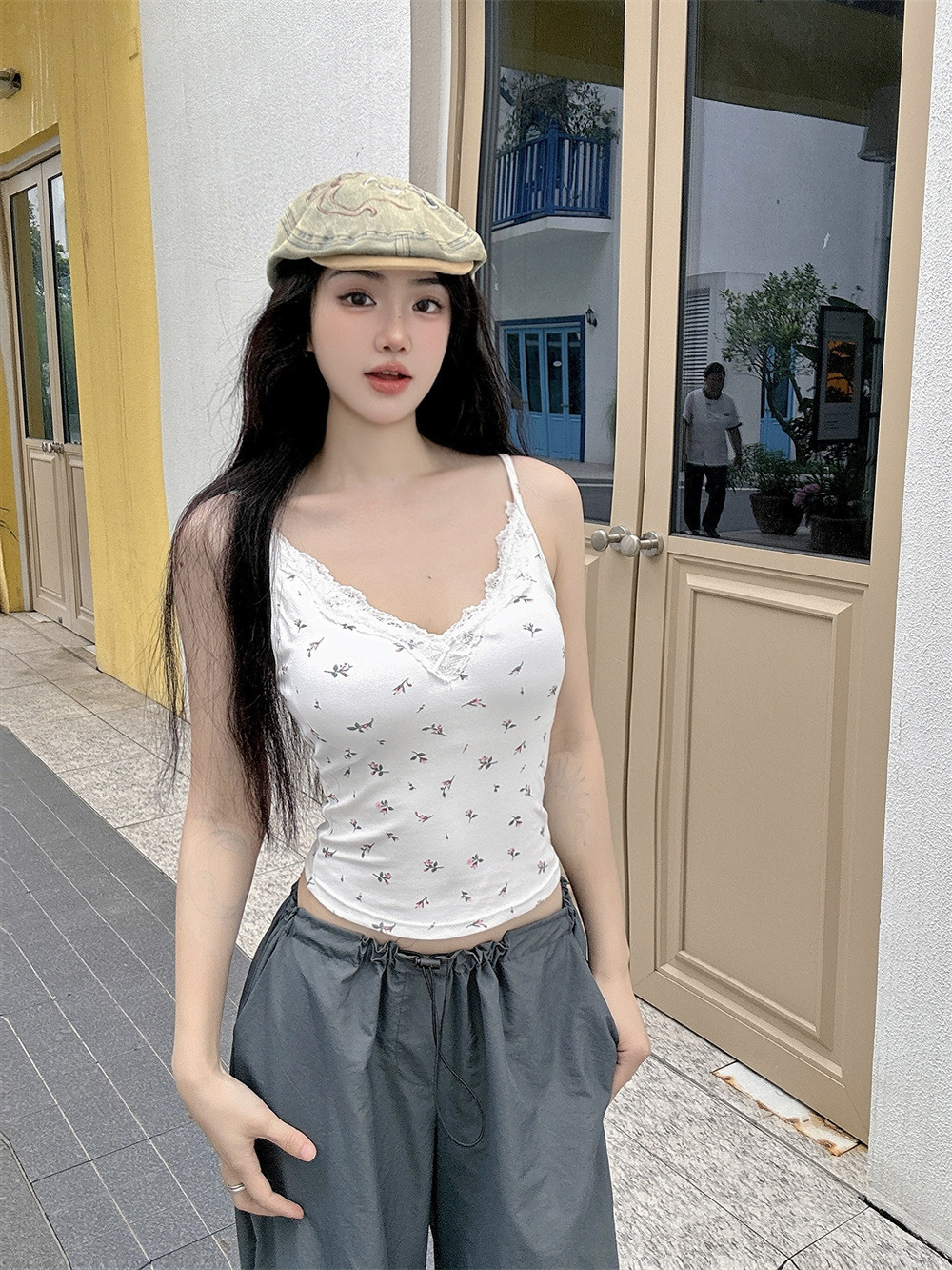 6102 # 섹시한 뜨거운 소녀 레이스 스플 라이스 v 넥 캐미솔 여성 여름 달콤한 프린트 연령 감소 겉옷 민소매 탑