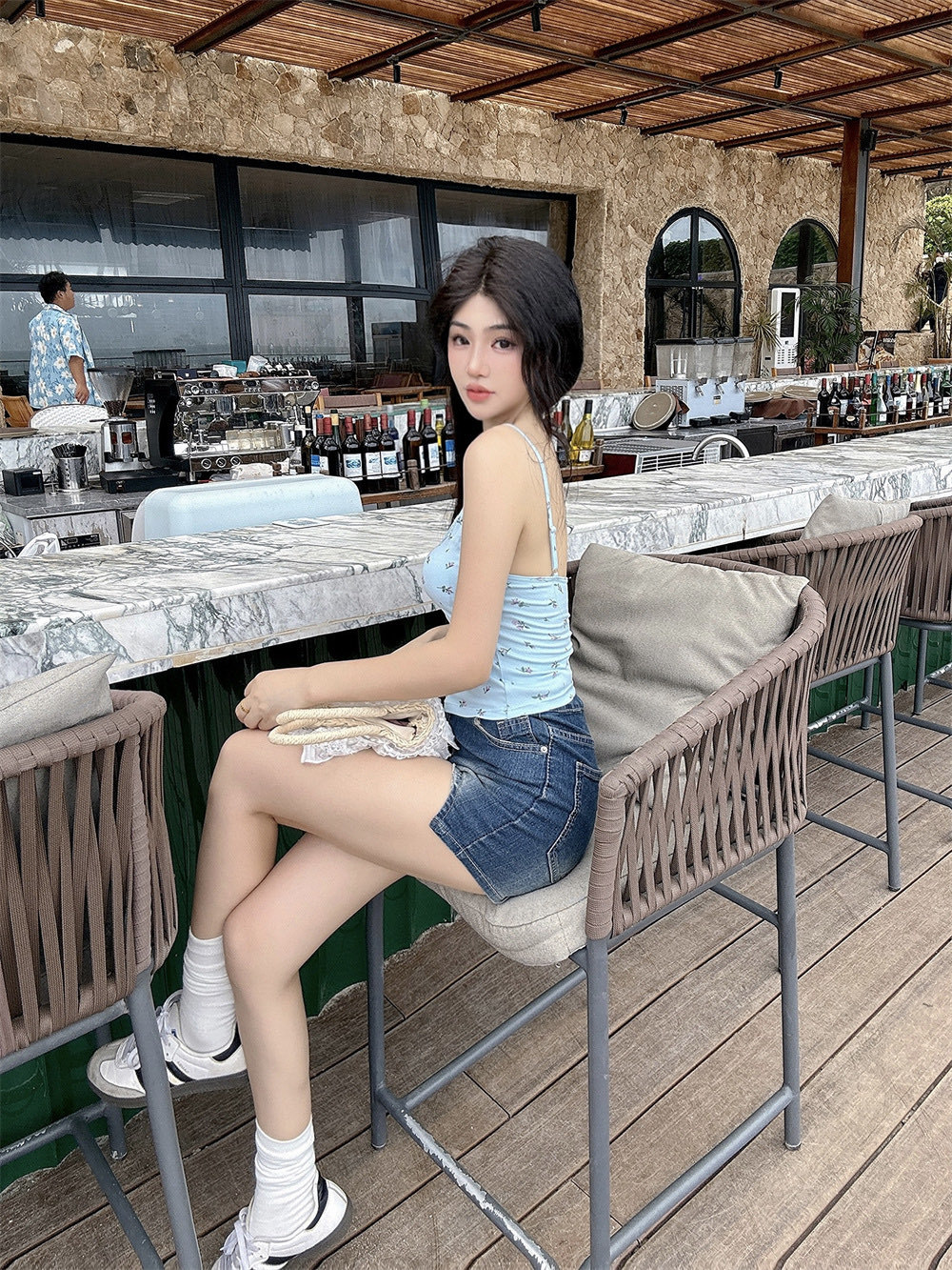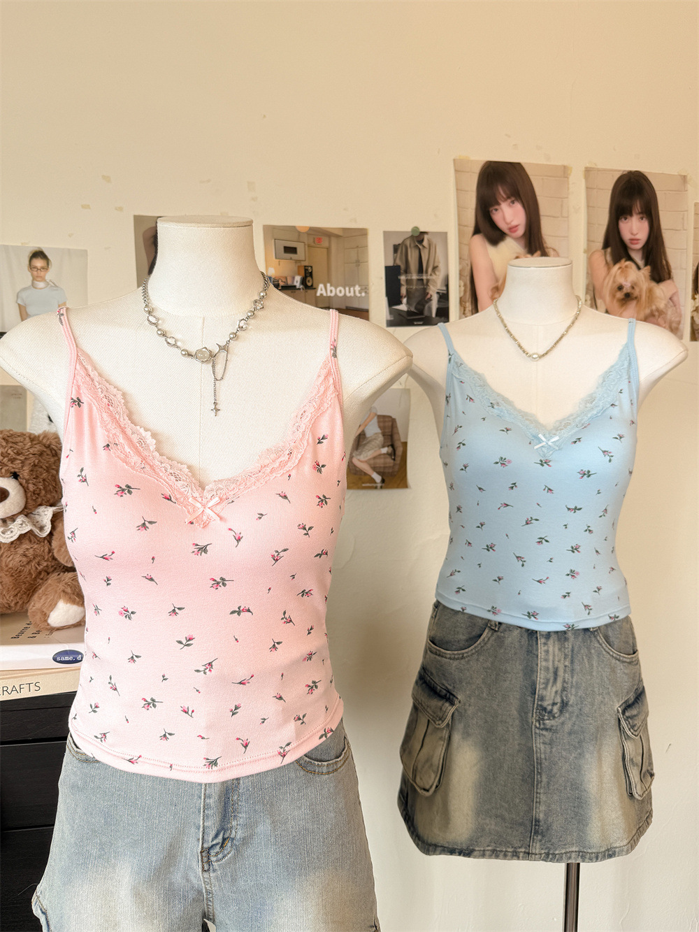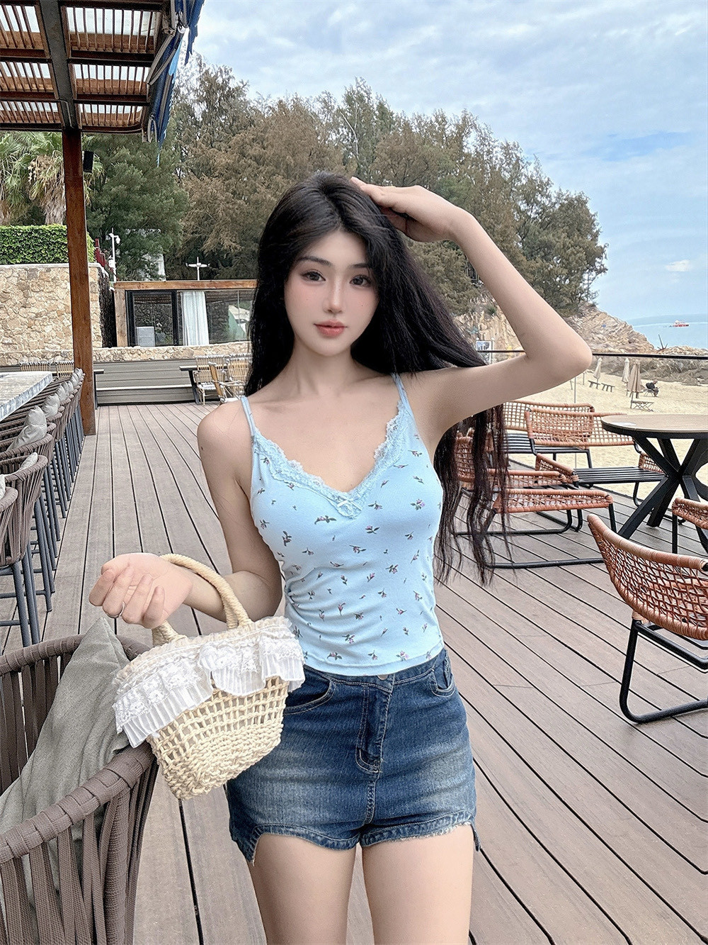 6102 # 섹시한 뜨거운 소녀 레이스 스플 라이스 v 넥 캐미솔 여성 여름 달콤한 프린트 연령 감소 겉옷 민소매 탑