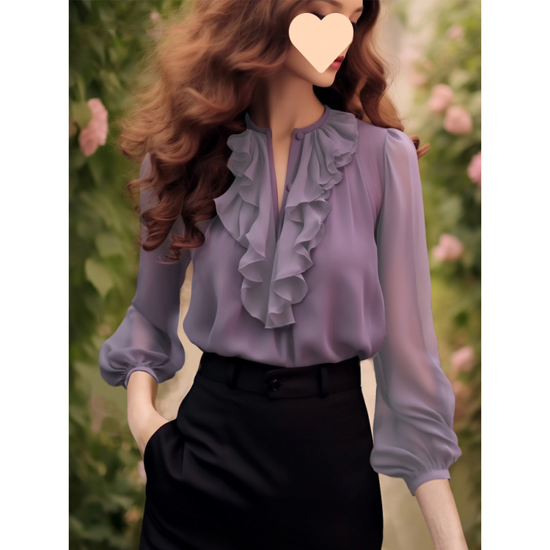2025 여름 프렌치 러플 쉬폰 셔츠 여성 7부 랜턴 슬리브 바닥 셔츠 퍼플 셔츠