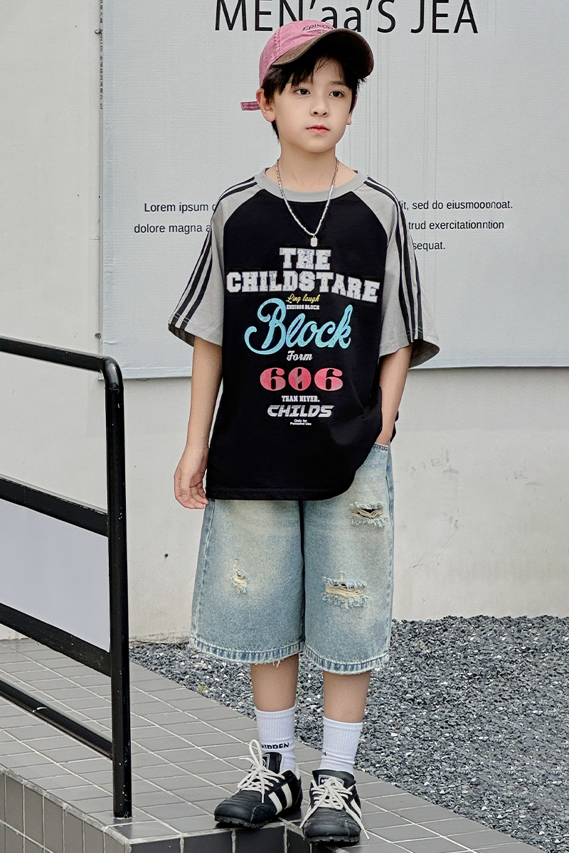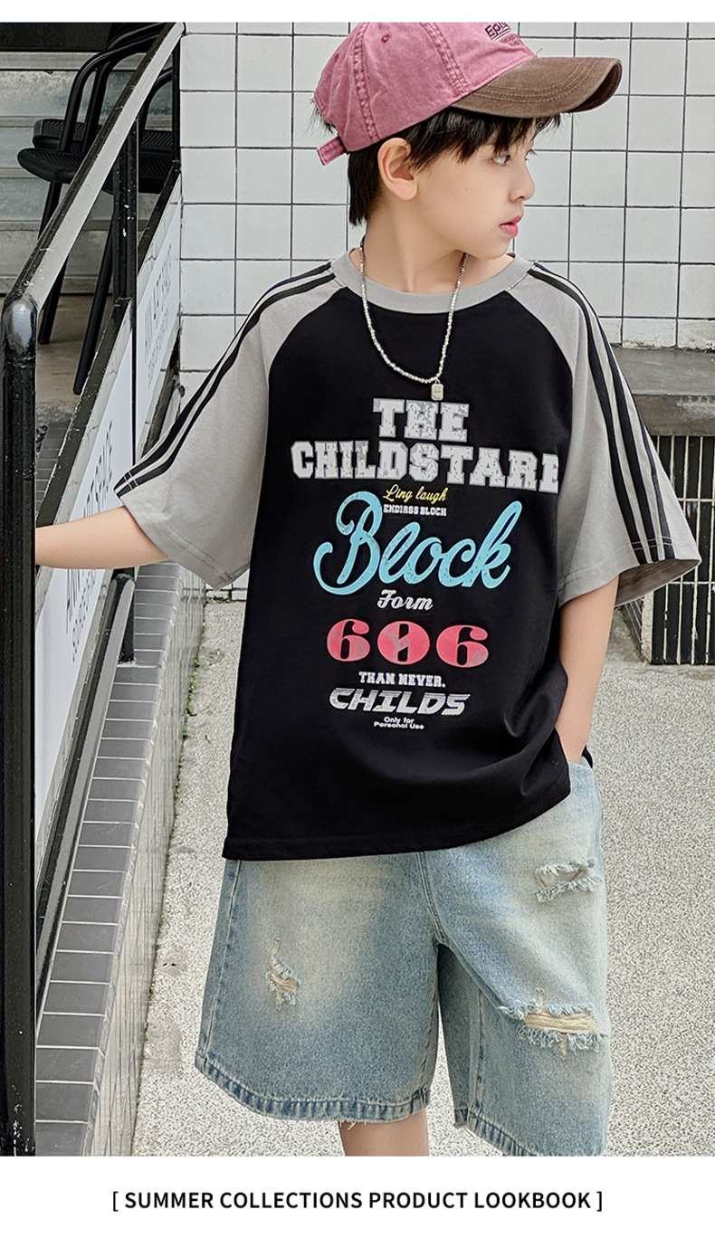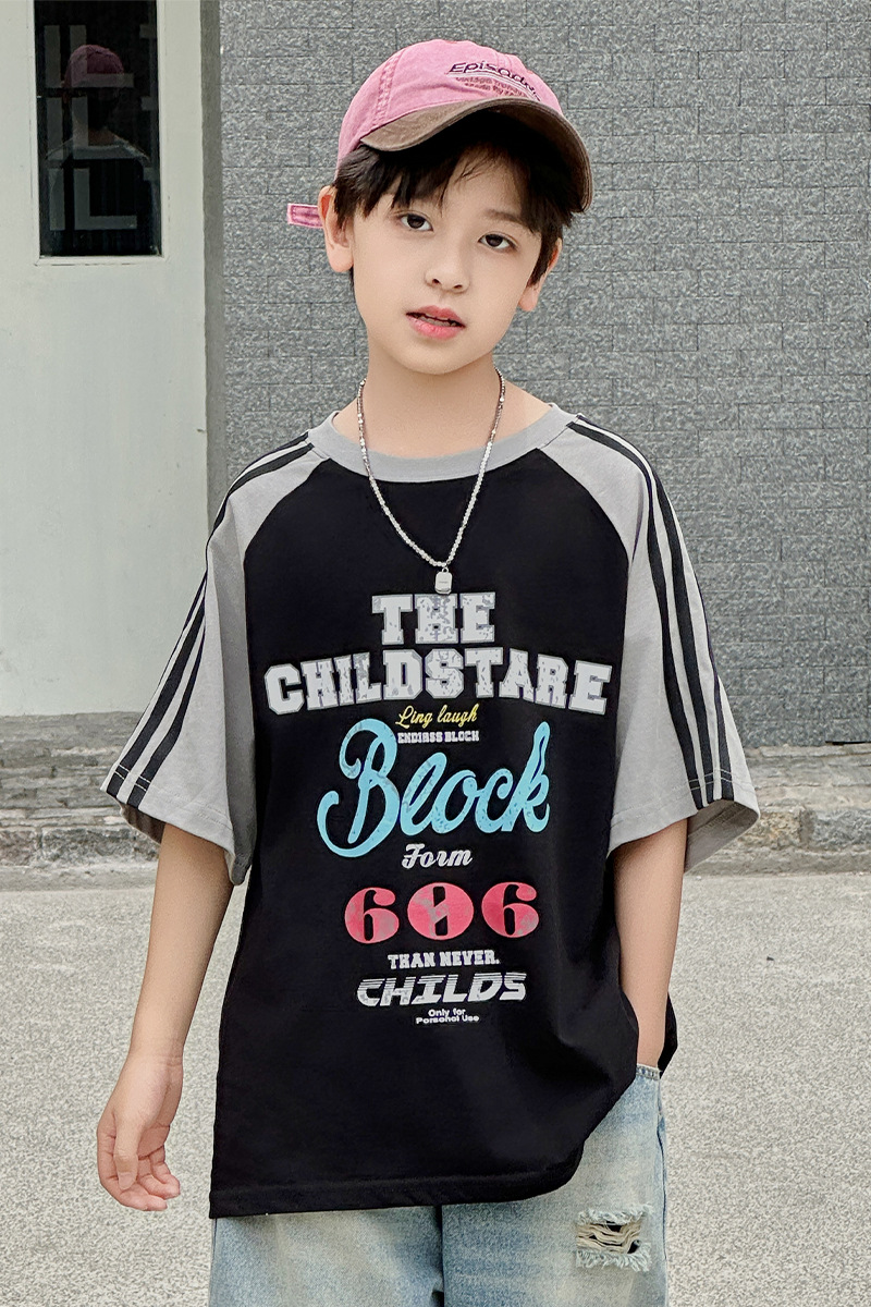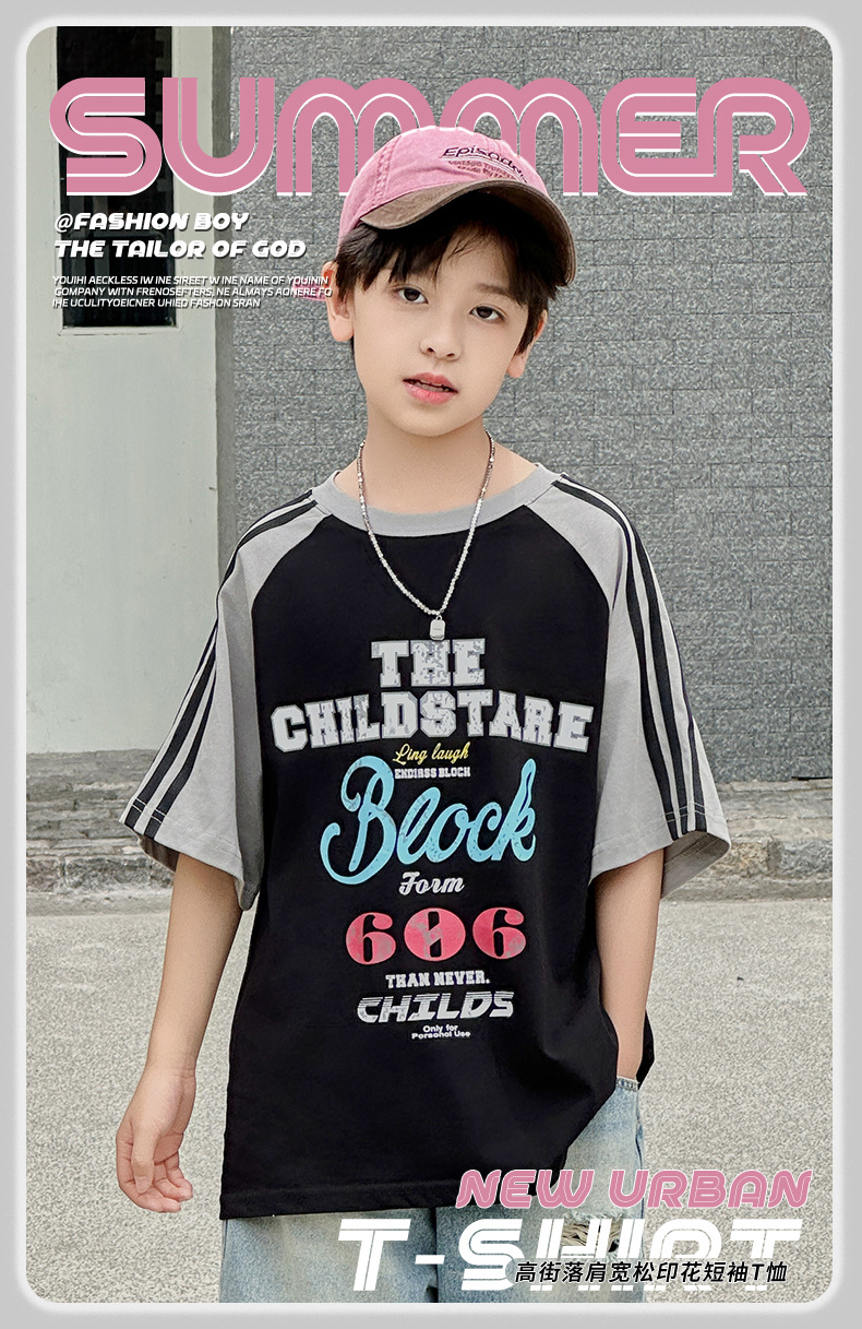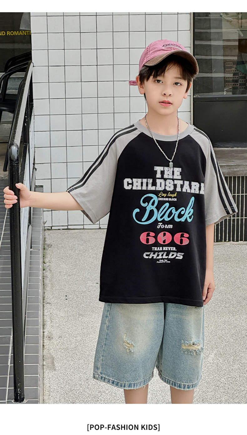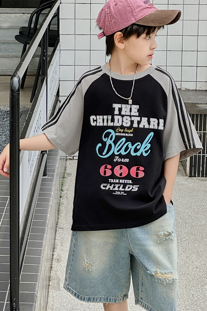 남아용 반팔 티셔츠 2026 여름 신상 한국 스타일 패치워크 프린트 래글런 소매 루즈핏 티셔츠
