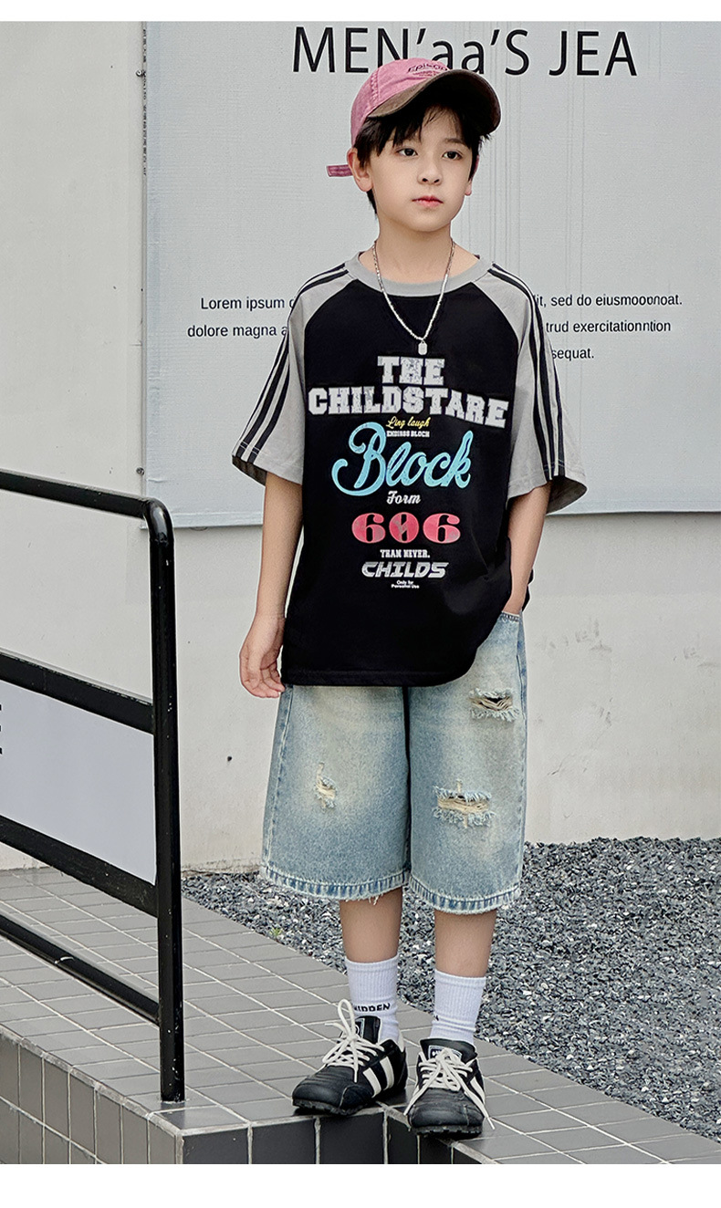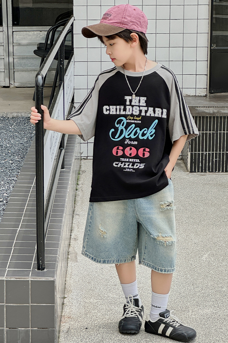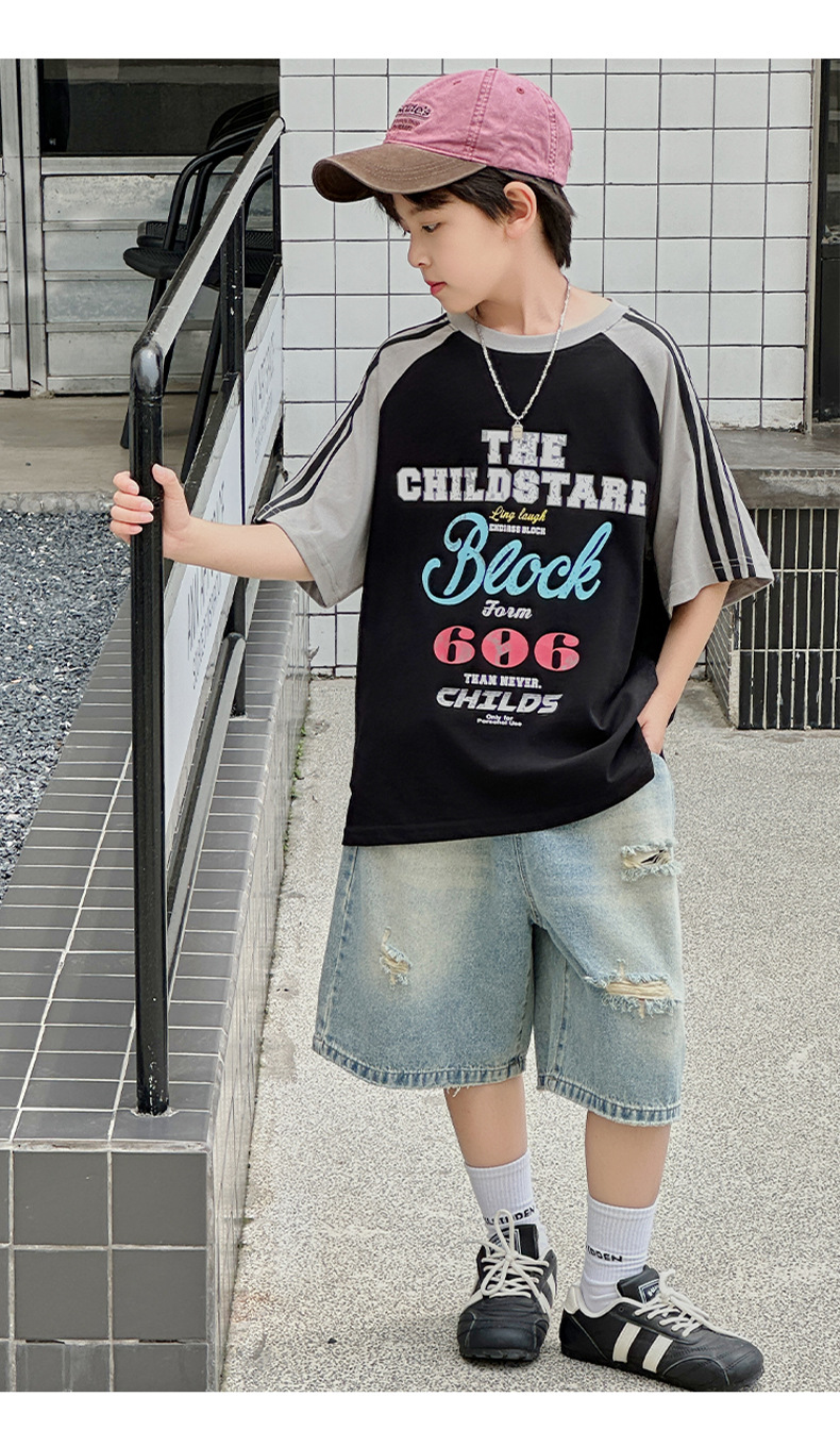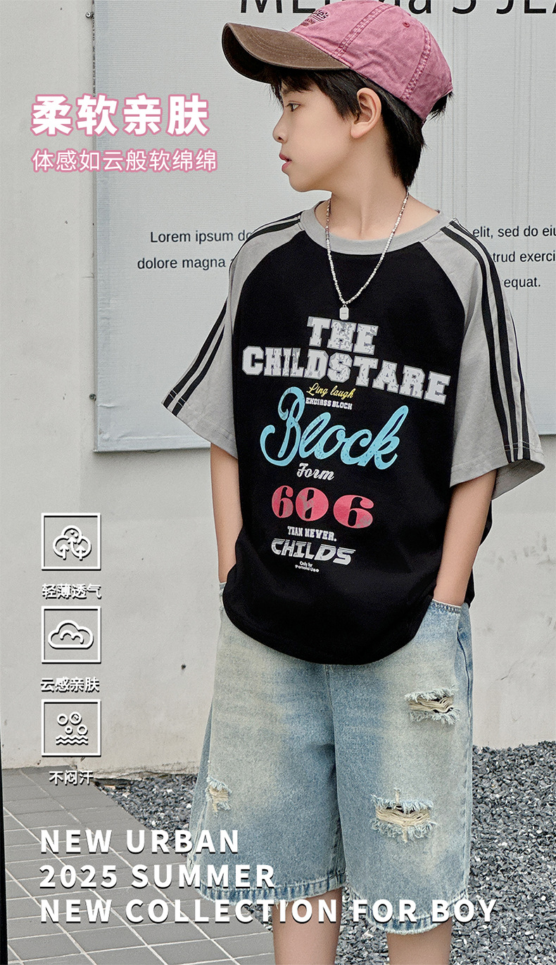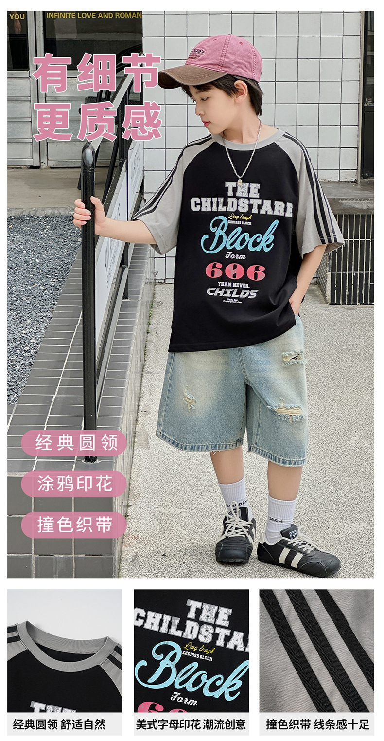 남아용 반팔 티셔츠 2026 여름 신상 한국 스타일 패치워크 프린트 래글런 소매 루즈핏 티셔츠