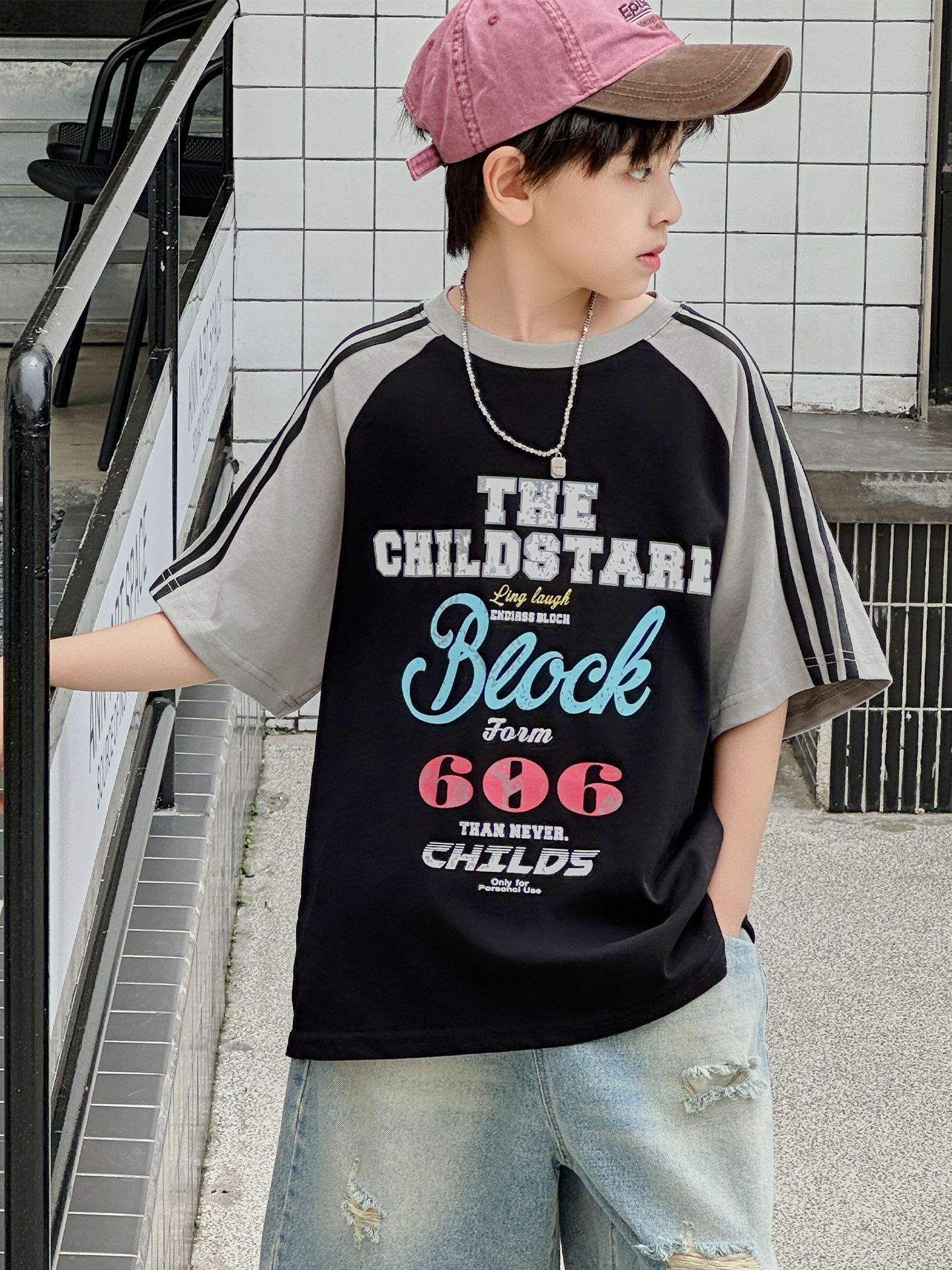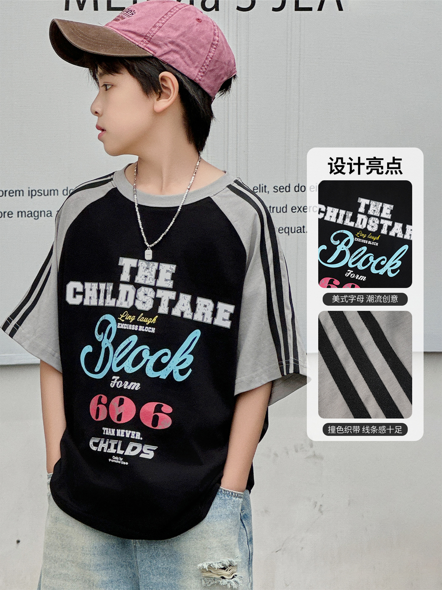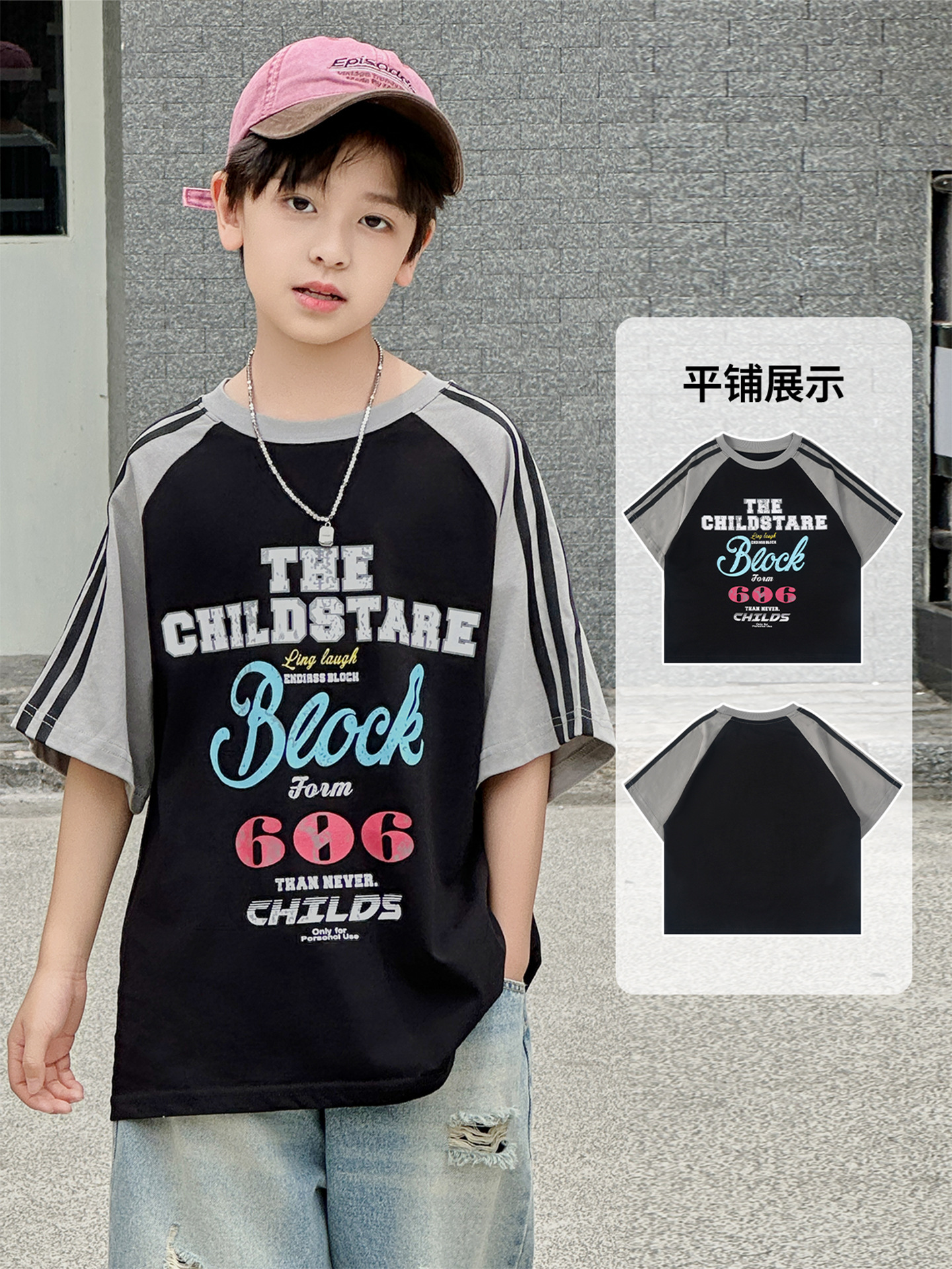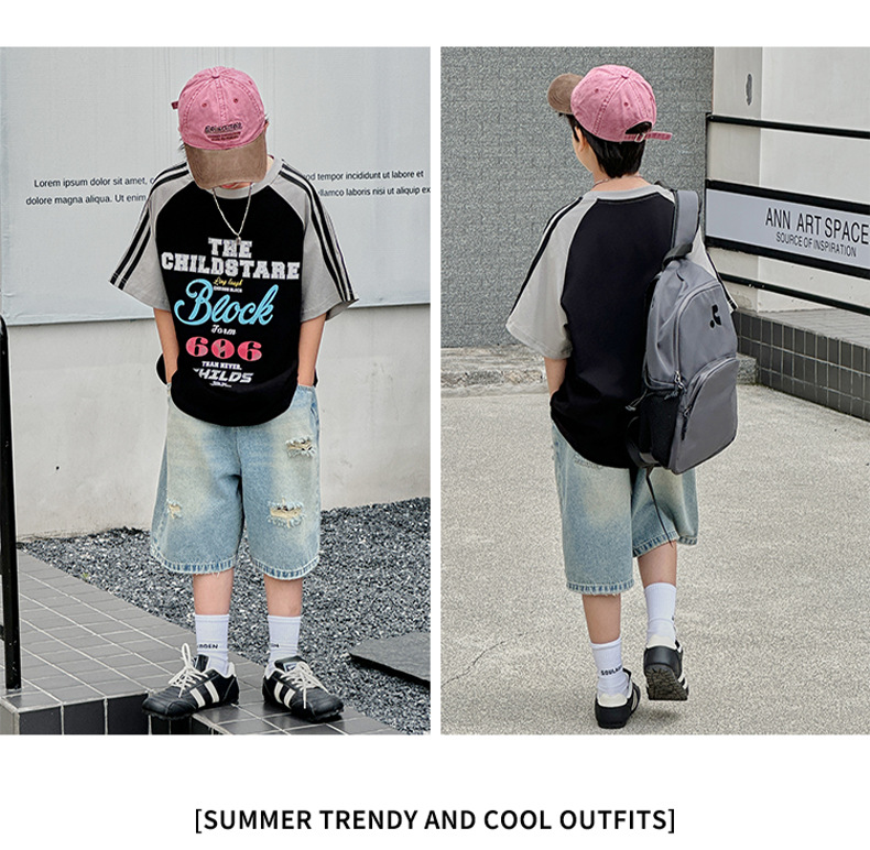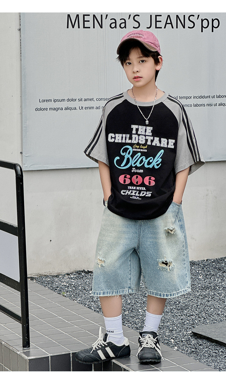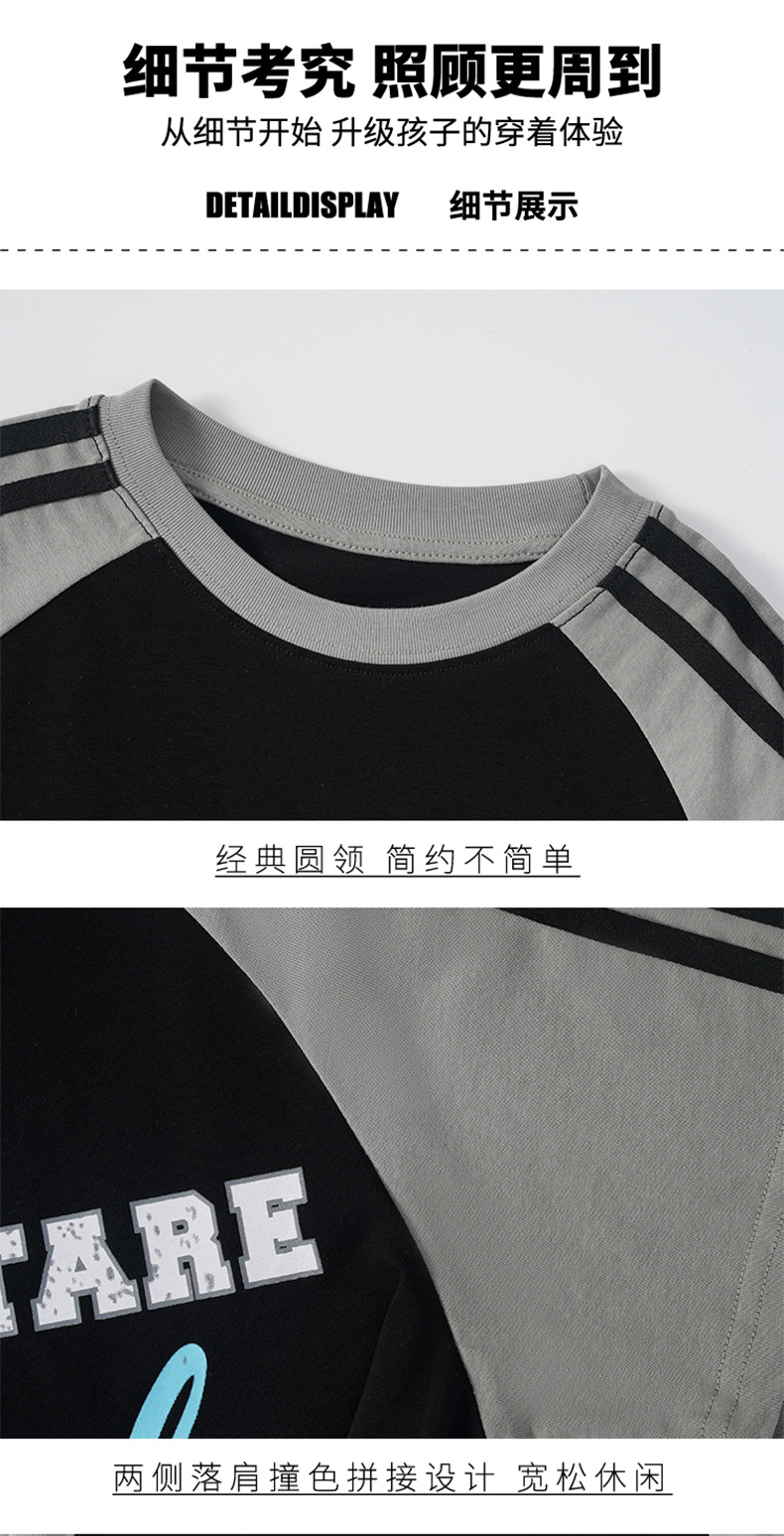 남아용 반팔 티셔츠 2026 여름 신상 한국 스타일 패치워크 프린트 래글런 소매 루즈핏 티셔츠