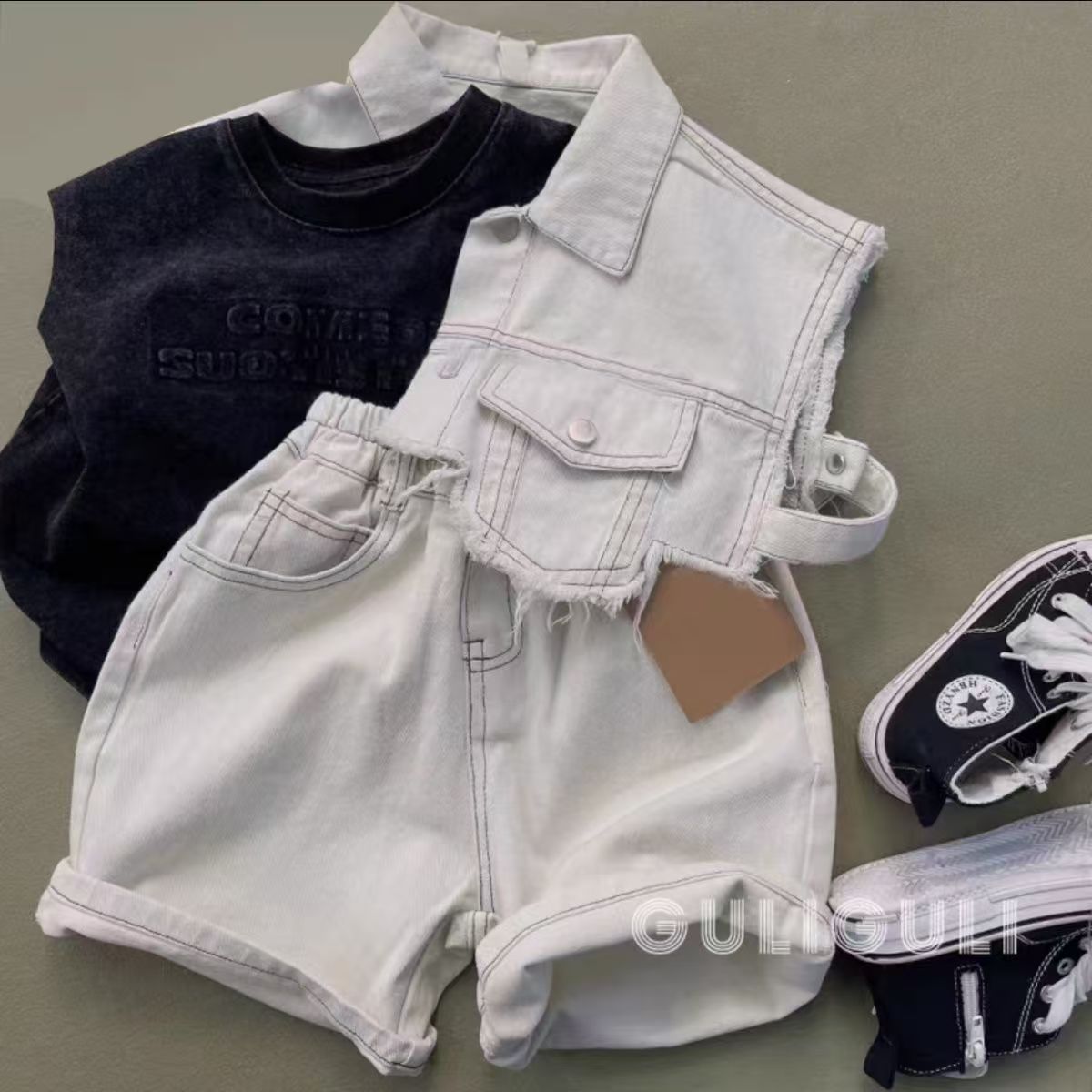 남아 여름 데님 슈트, 핸섬 스트리트 패션 루즈 아동 데님 셔츠, 얇은 반바지 3종 세트스토어 가기