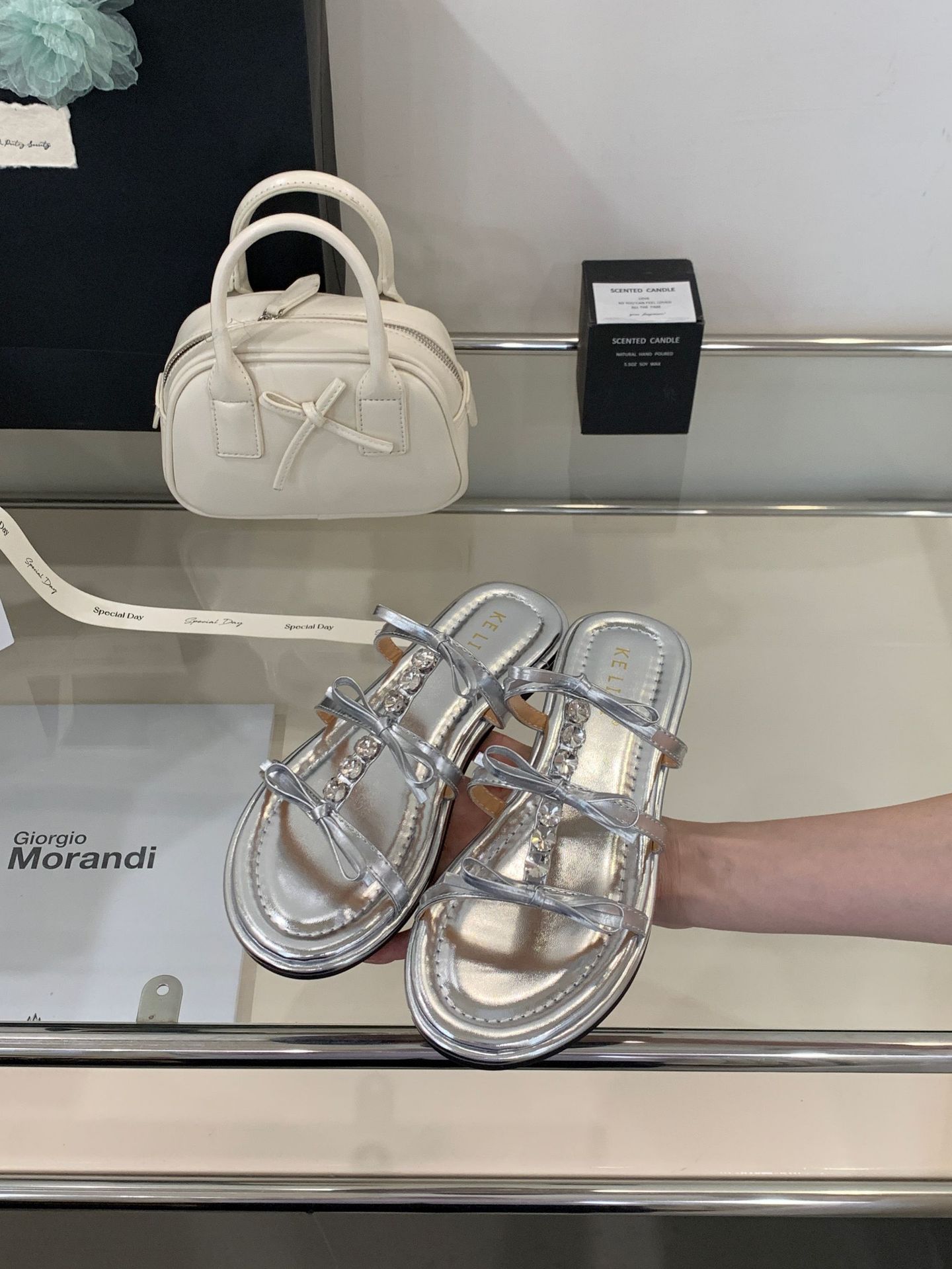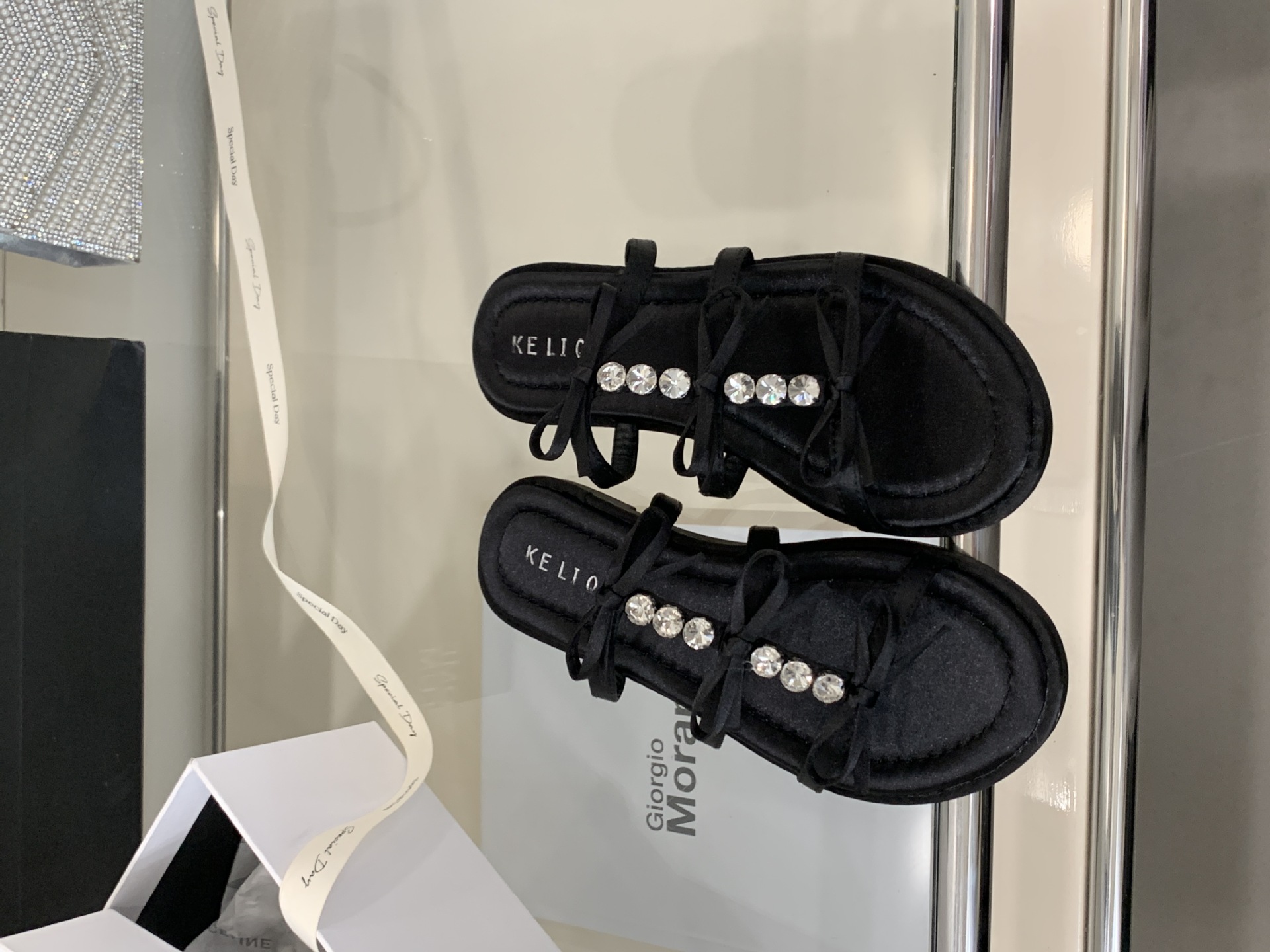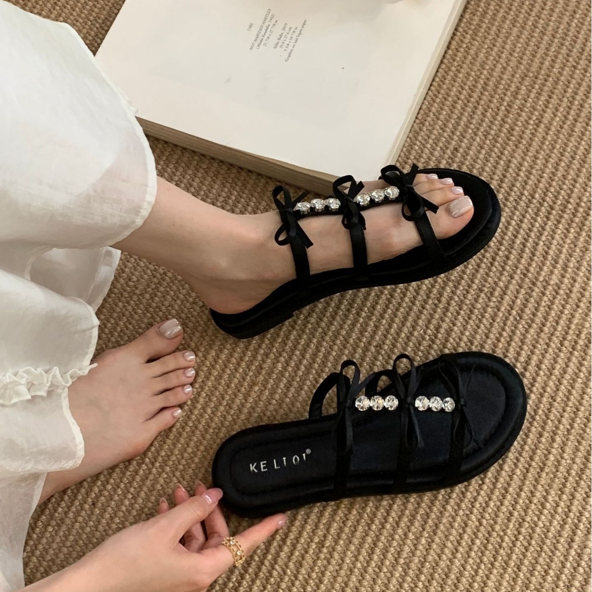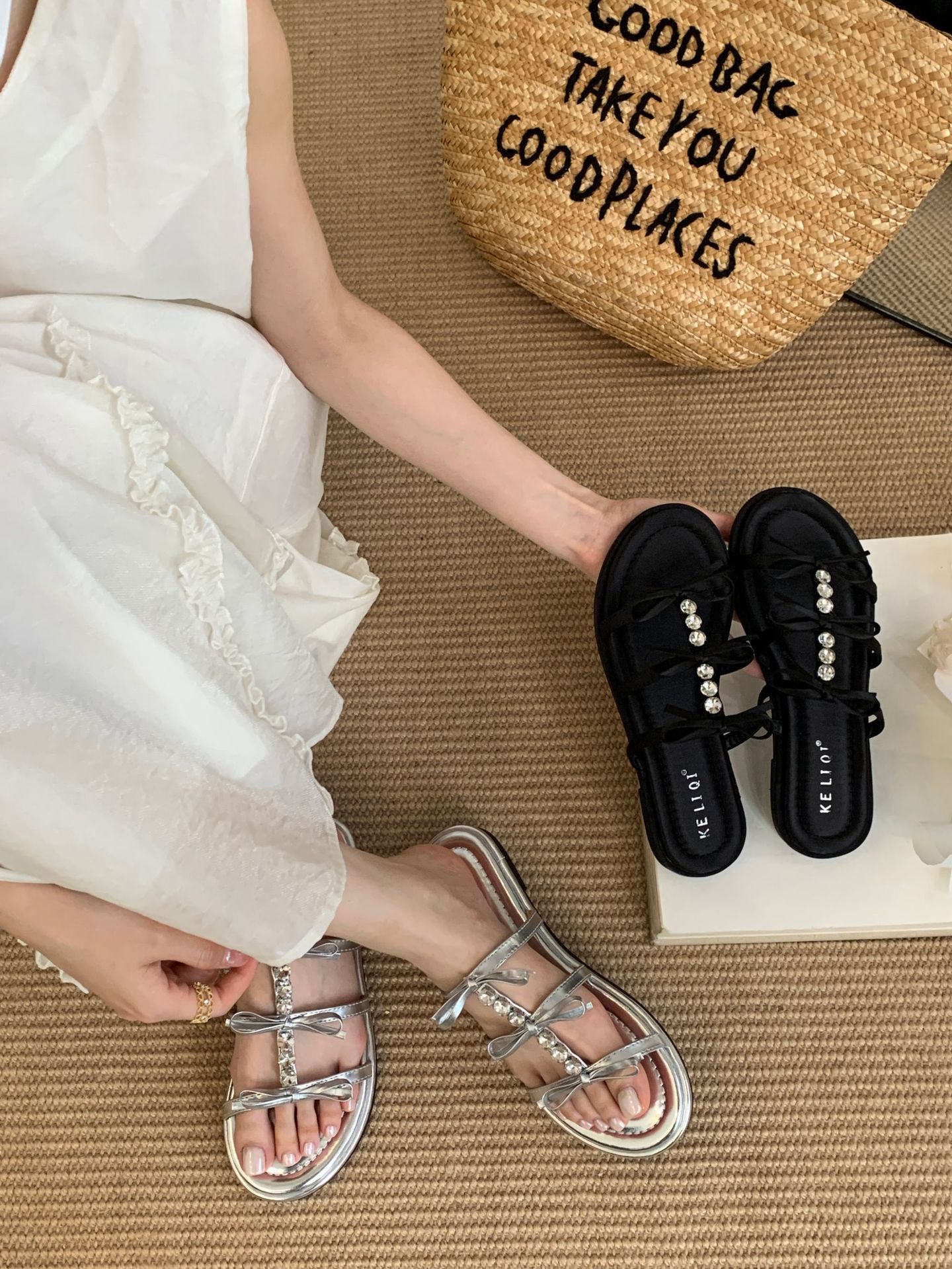 2025 여성 슬리퍼 여름 두꺼운 밑창 캐주얼 라운드 발가락 보우 라인스톤 플랫 힐 새틴 슬리퍼 비치 샌들스토어 가기