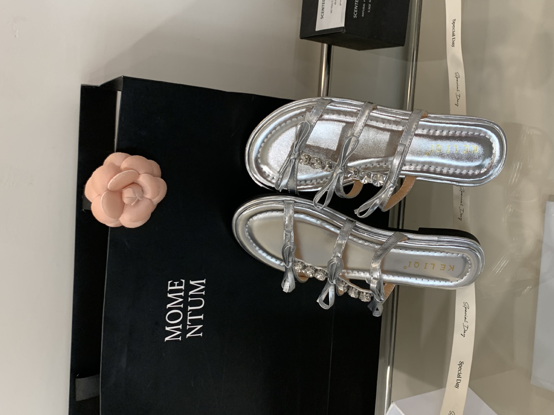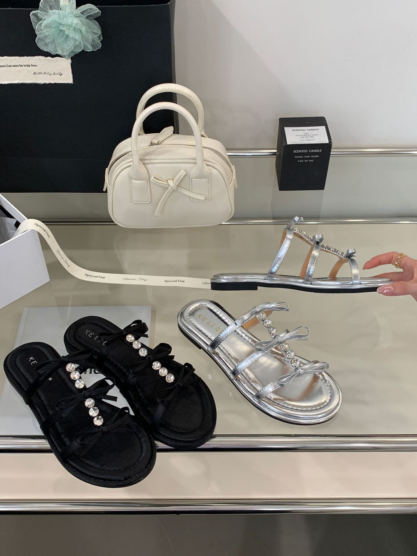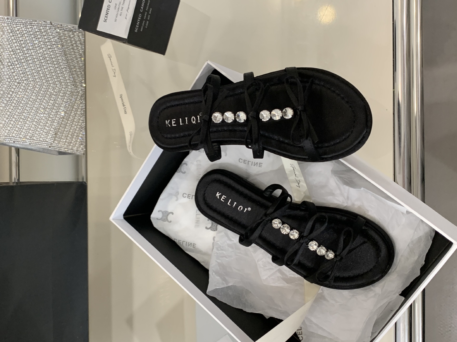 2025 여성 슬리퍼 여름 두꺼운 밑창 캐주얼 라운드 발가락 보우 라인스톤 플랫 힐 새틴 슬리퍼 비치 샌들스토어 가기
