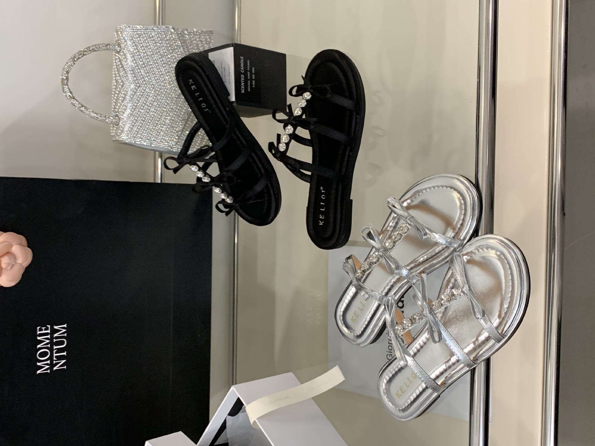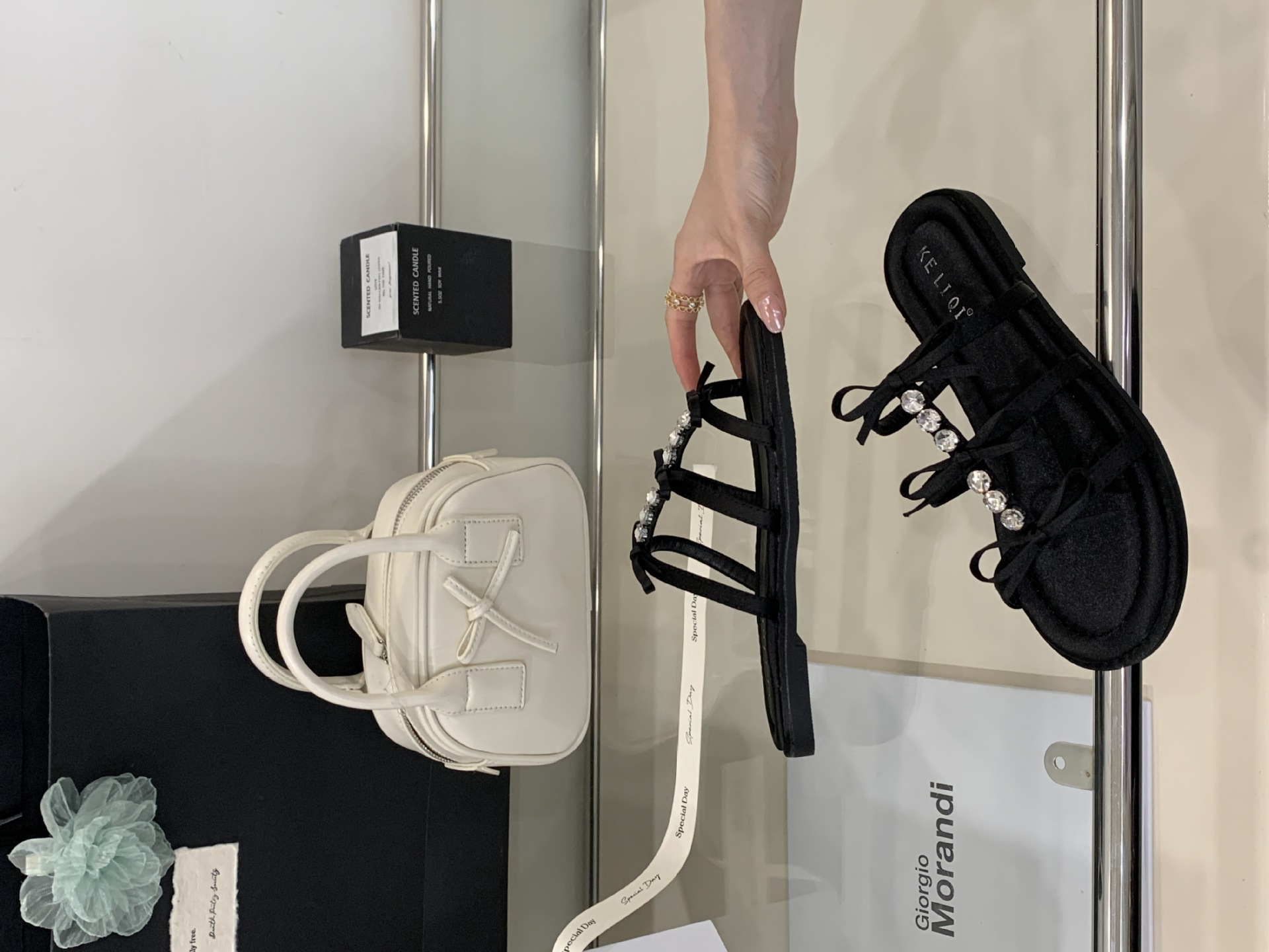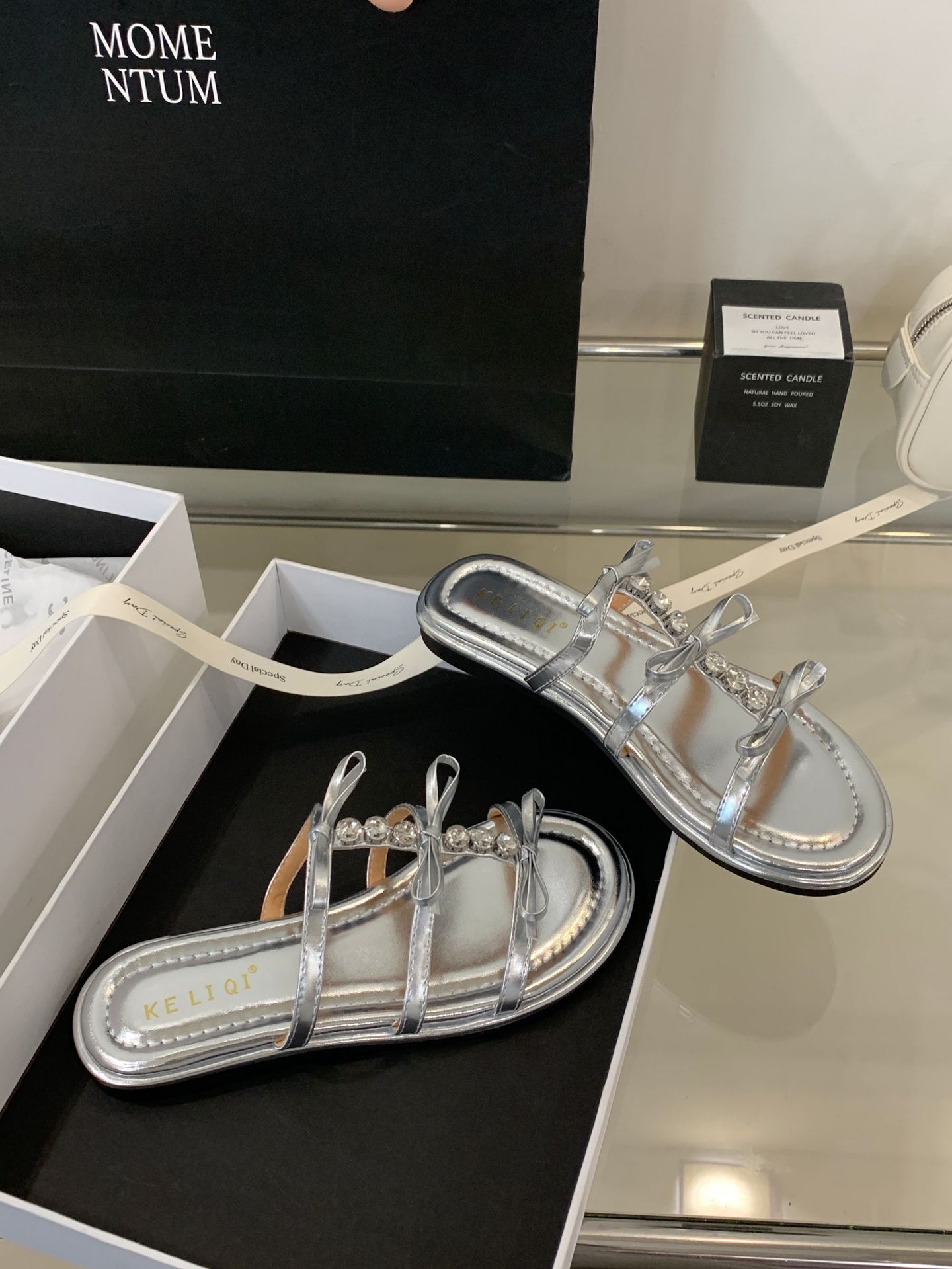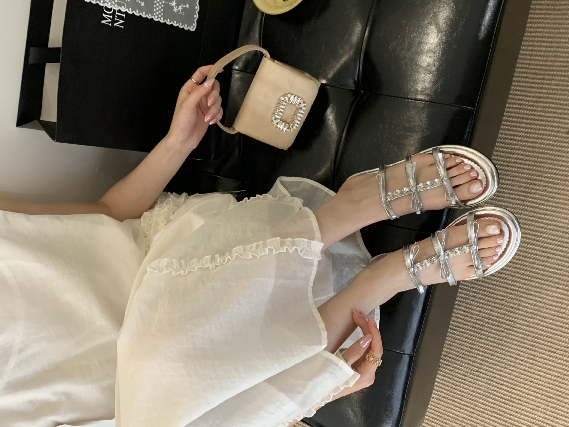 2025 여성 슬리퍼 여름 두꺼운 밑창 캐주얼 라운드 발가락 보우 라인스톤 플랫 힐 새틴 슬리퍼 비치 샌들스토어 가기