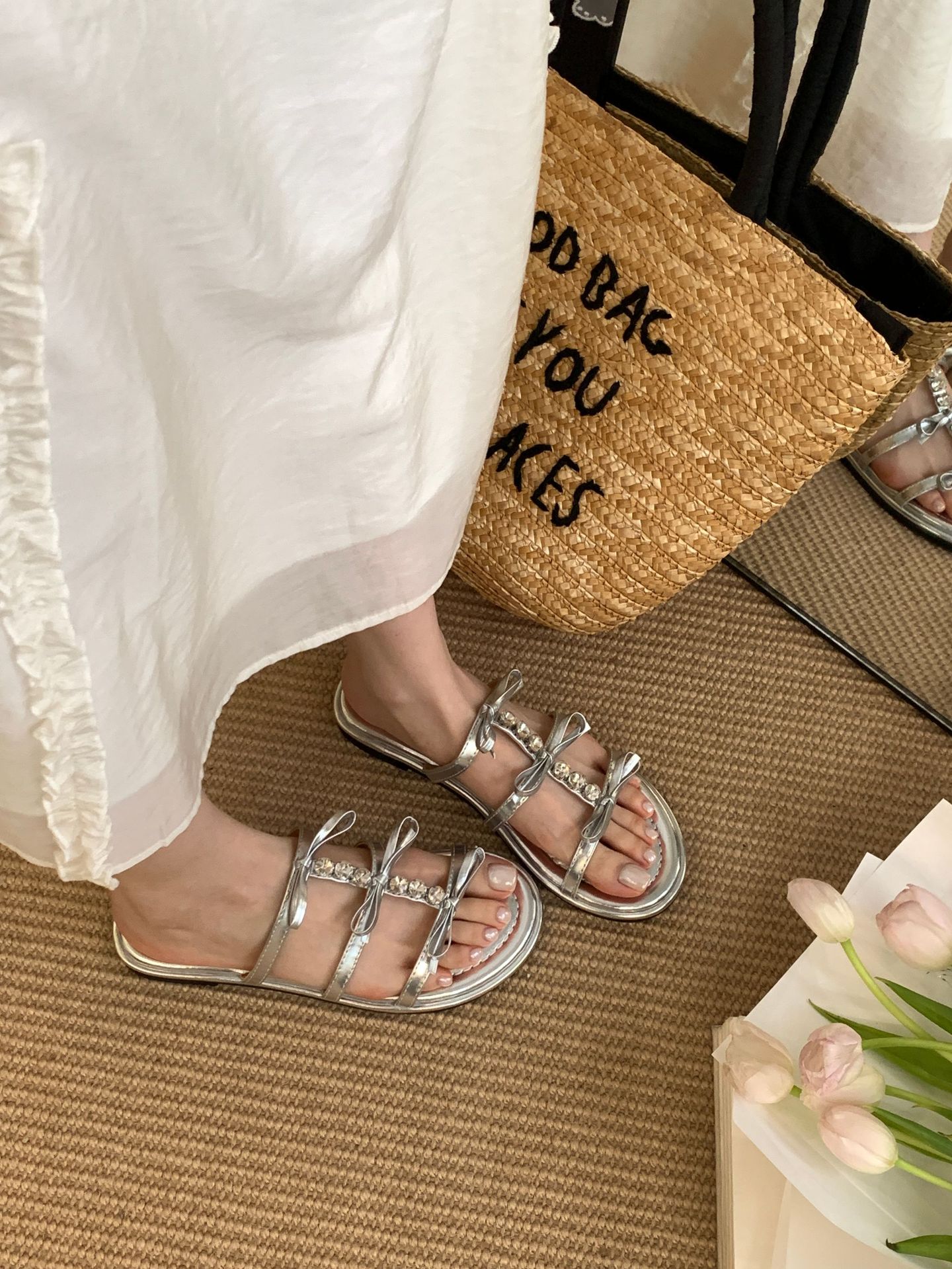 2025 여성 슬리퍼 여름 두꺼운 밑창 캐주얼 라운드 발가락 보우 라인스톤 플랫 힐 새틴 슬리퍼 비치 샌들