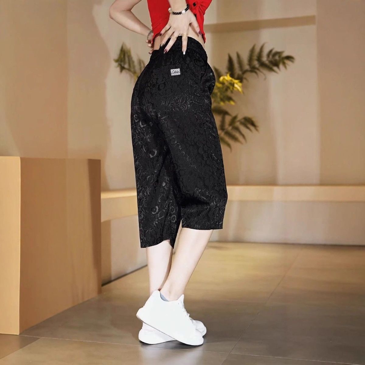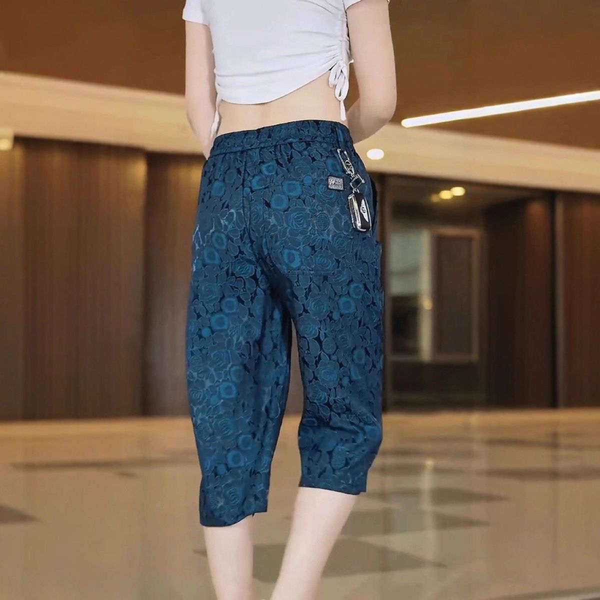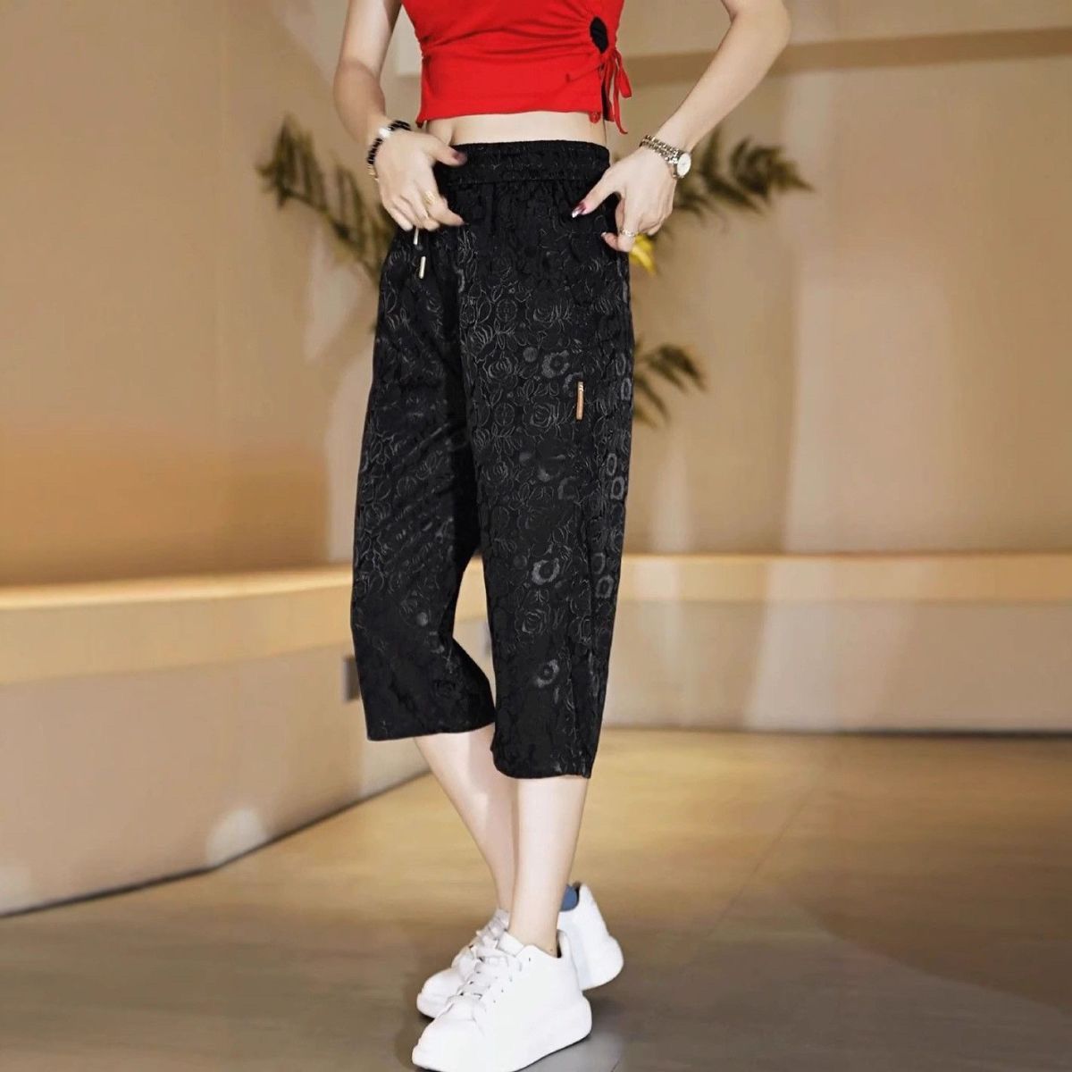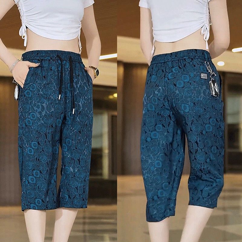 소스 제조업체 아이스 실크 자카드 무릎 위 반바지 남성 여름 바지 캐주얼하고 편안한 스트레치 크롭 팬츠 루즈 스트레이트스토어 가기