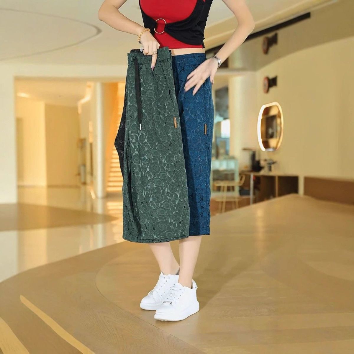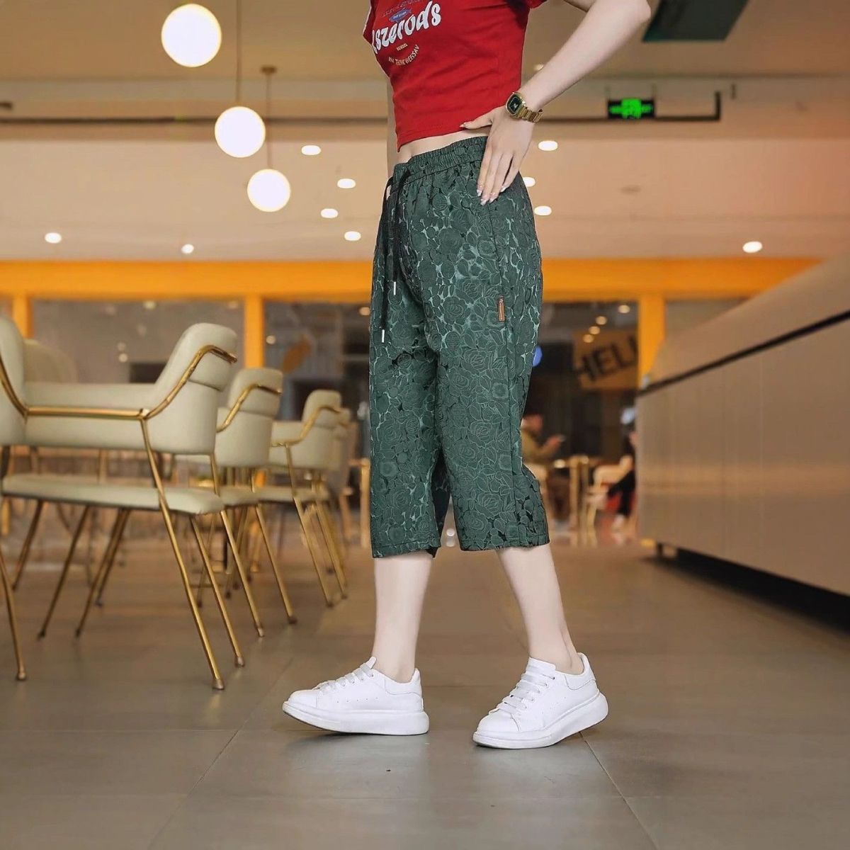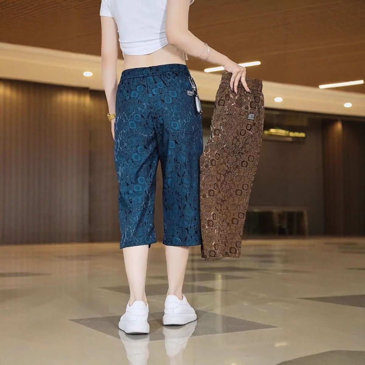 소스 제조업체 아이스 실크 자카드 무릎 위 반바지 남성 여름 바지 캐주얼하고 편안한 스트레치 크롭 팬츠 루즈 스트레이트스토어 가기