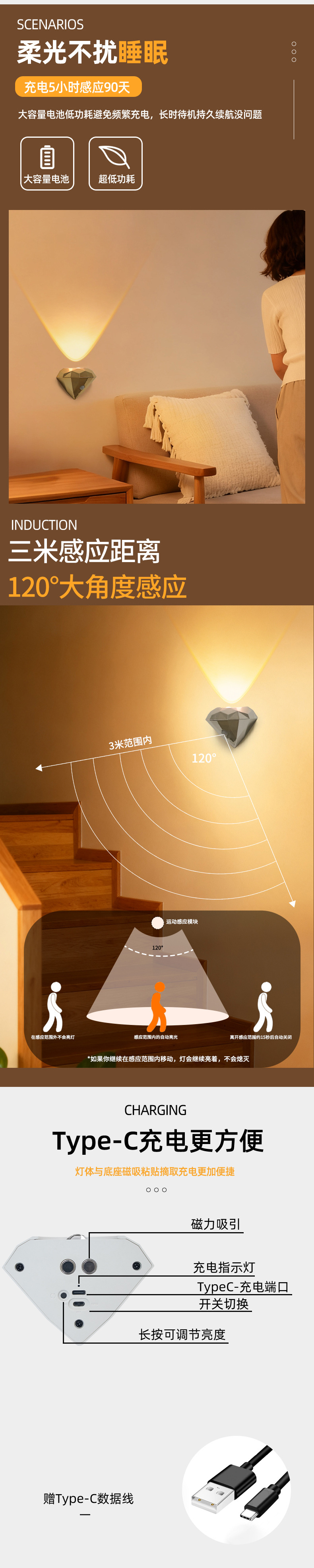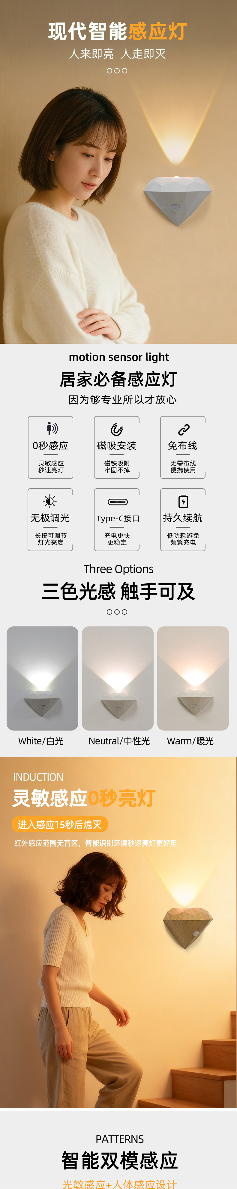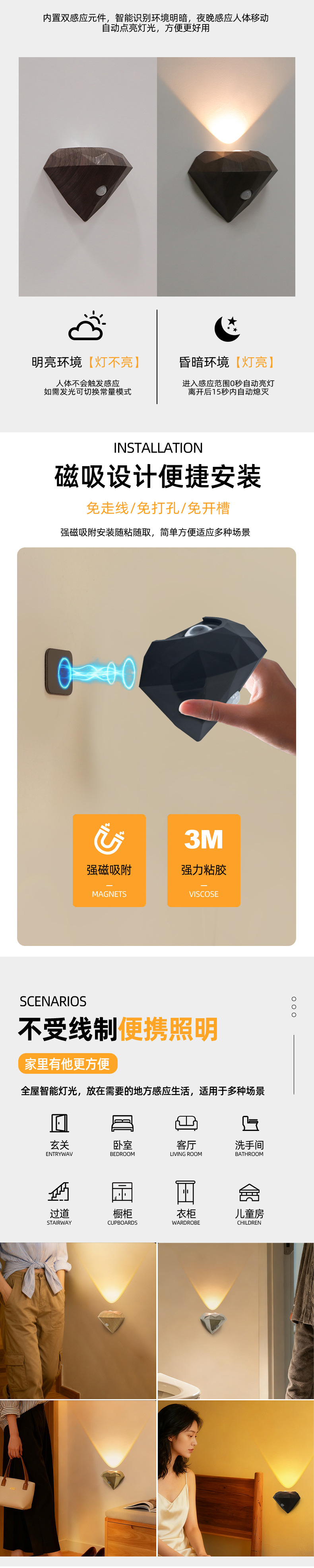 국경 간 실내 벽 램프 배선이 필요없는 자기 흡입 지능형 인체 모션 센서 램프 충전 야간 조명 통로 계단