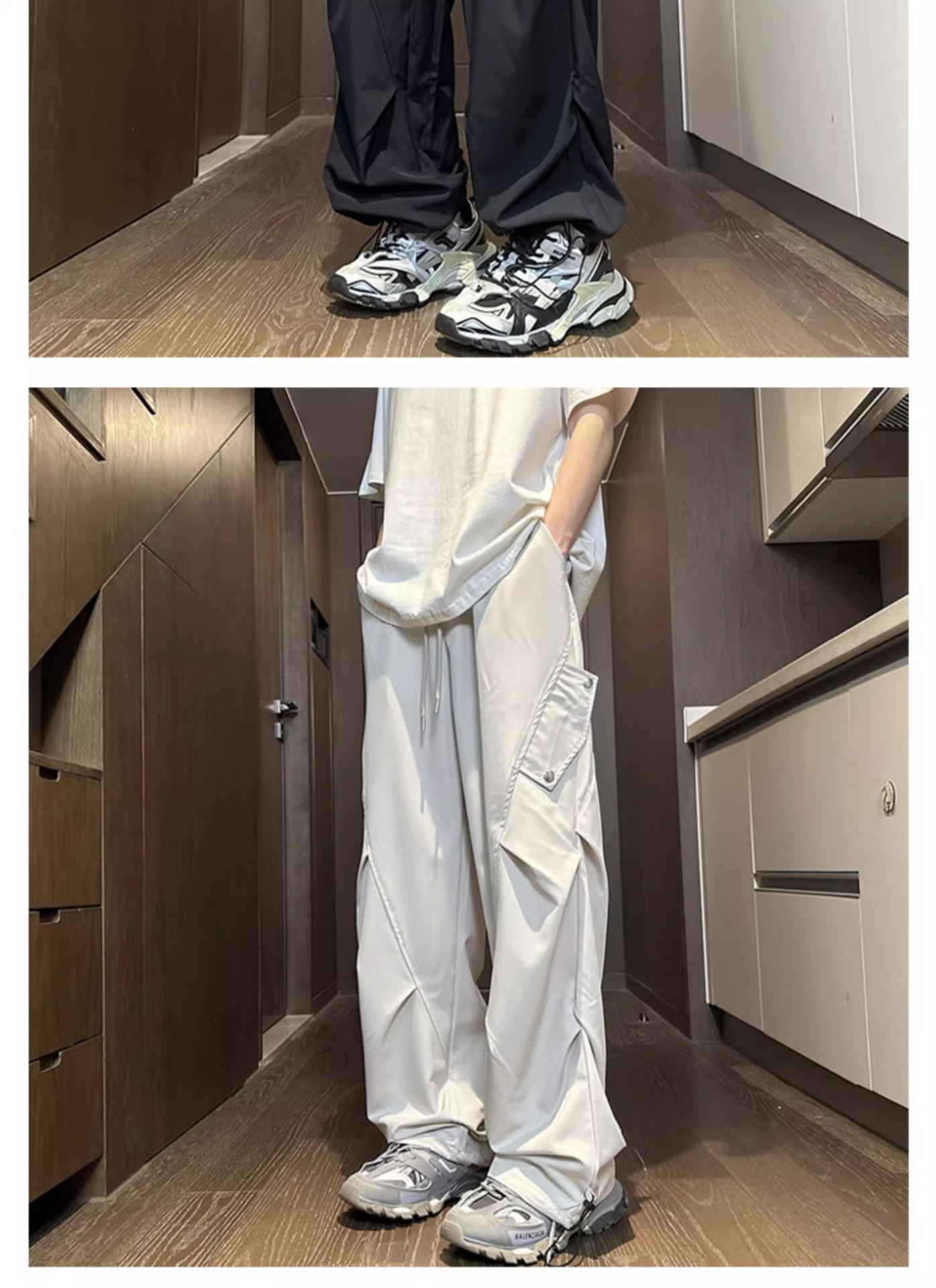 남성용 파라트로opers 작업복 여름 얇은 얼음 실크 트렌디 브랜드 루즈 스트레이트 충전 바지 속건성 와이드 레그 캐주얼 롱 팬츠