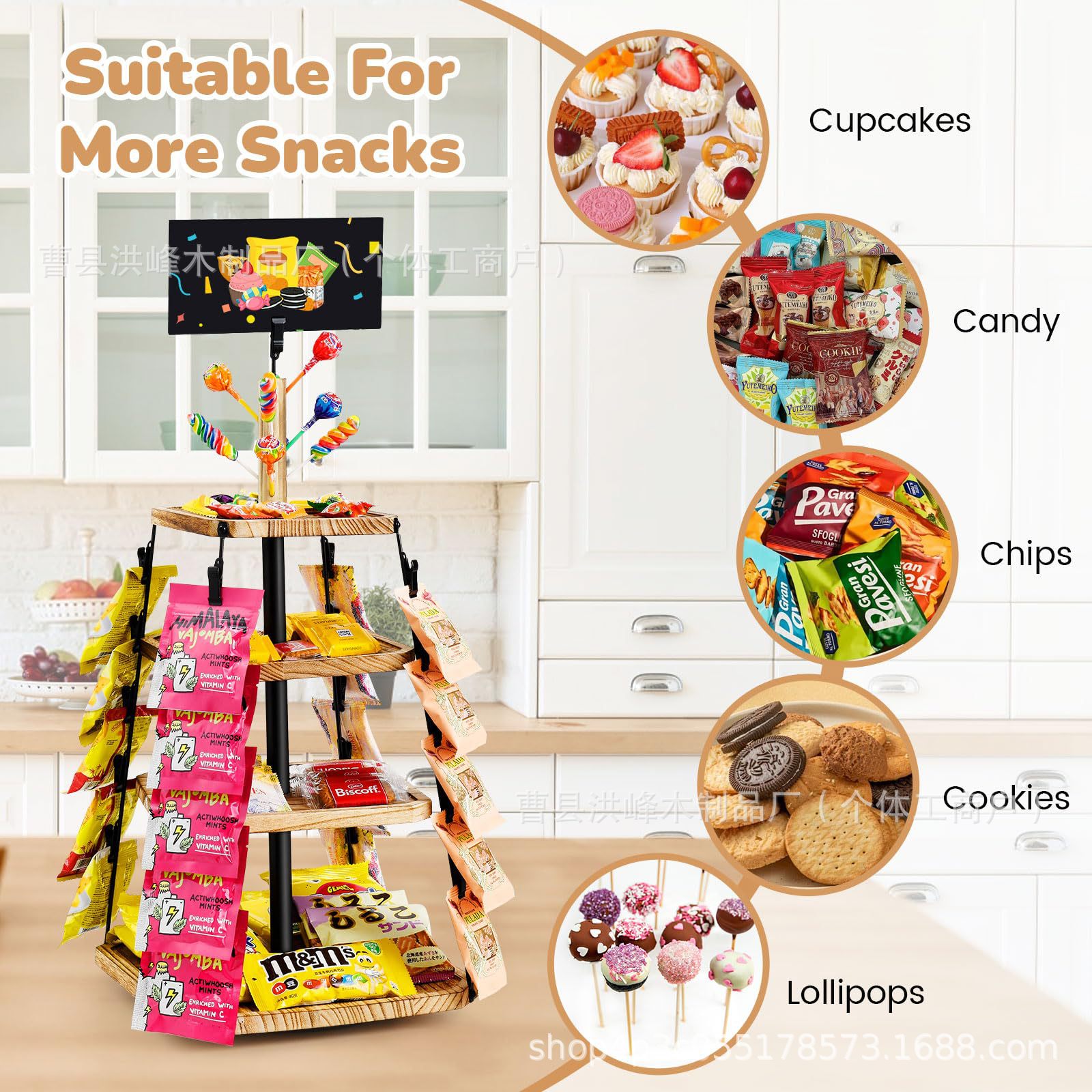 회전식 나무 스낵 랙 데스크탑 나무 스낵 디스플레이 랙 3층 나무 스낵 보관 랙스토어 가기