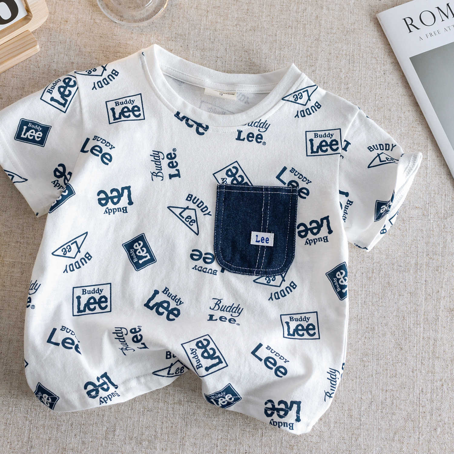 아동용 반팔 티셔츠 2025 여름 새 스타일 소년 소녀용 풀 프린트 탑 트렌디 브랜드 베이비 포켓 반팔 T 얇은 바닥