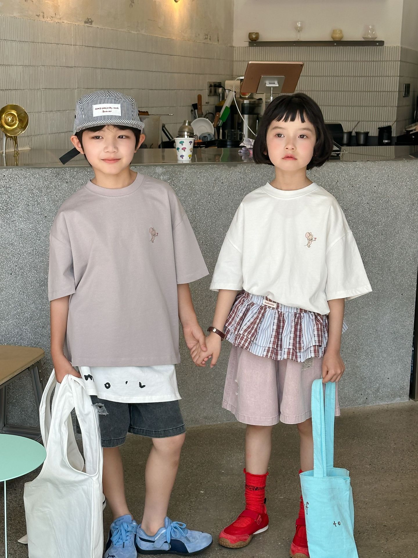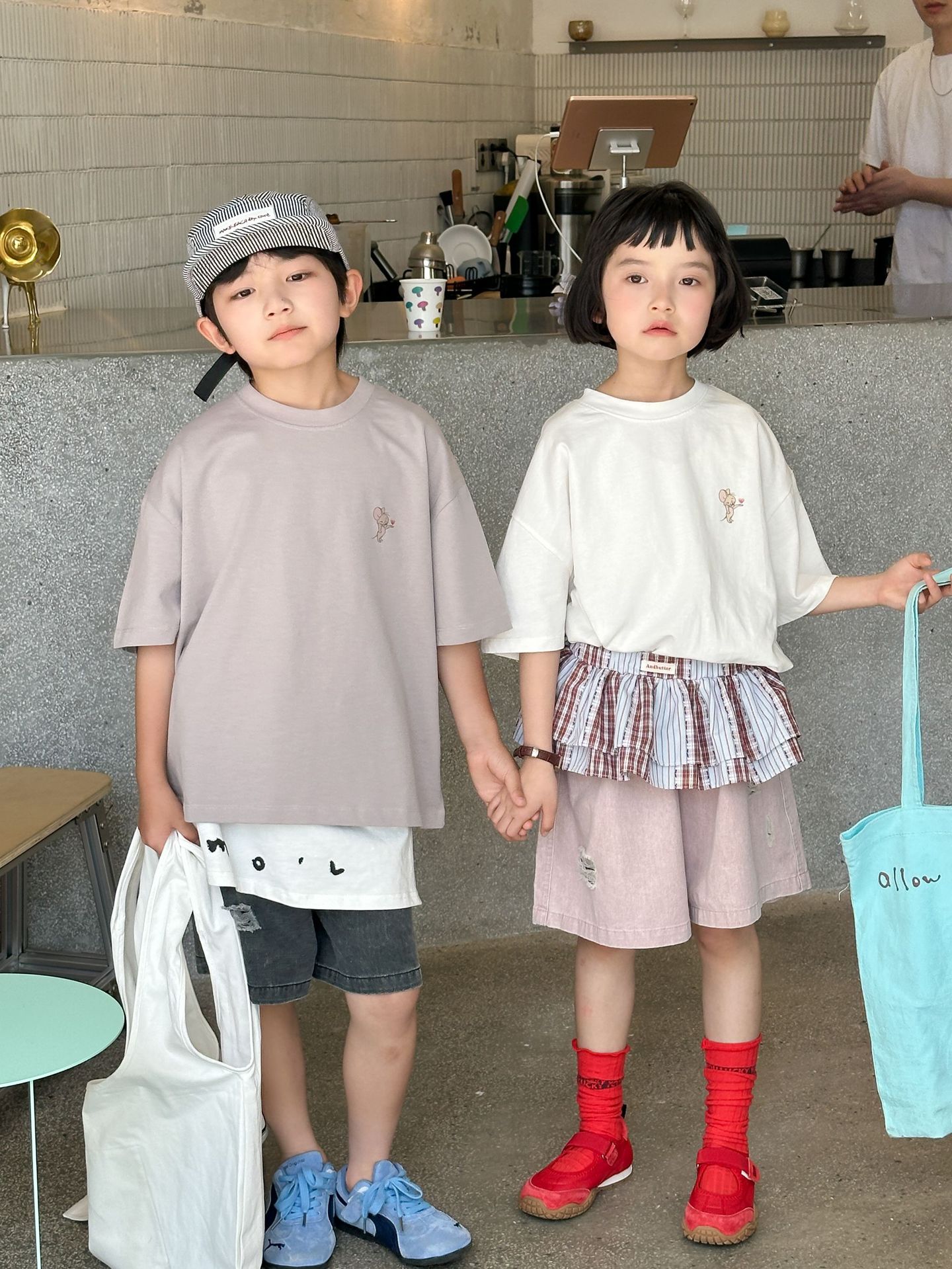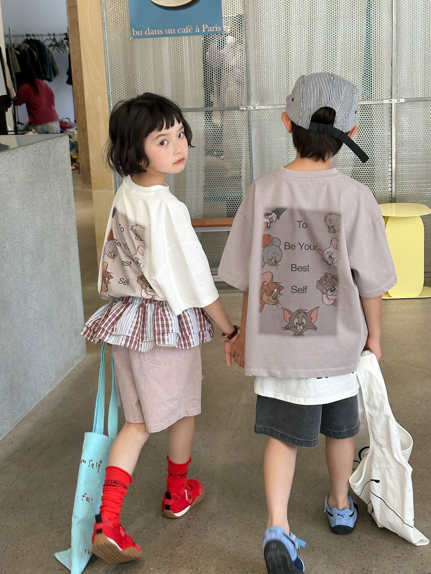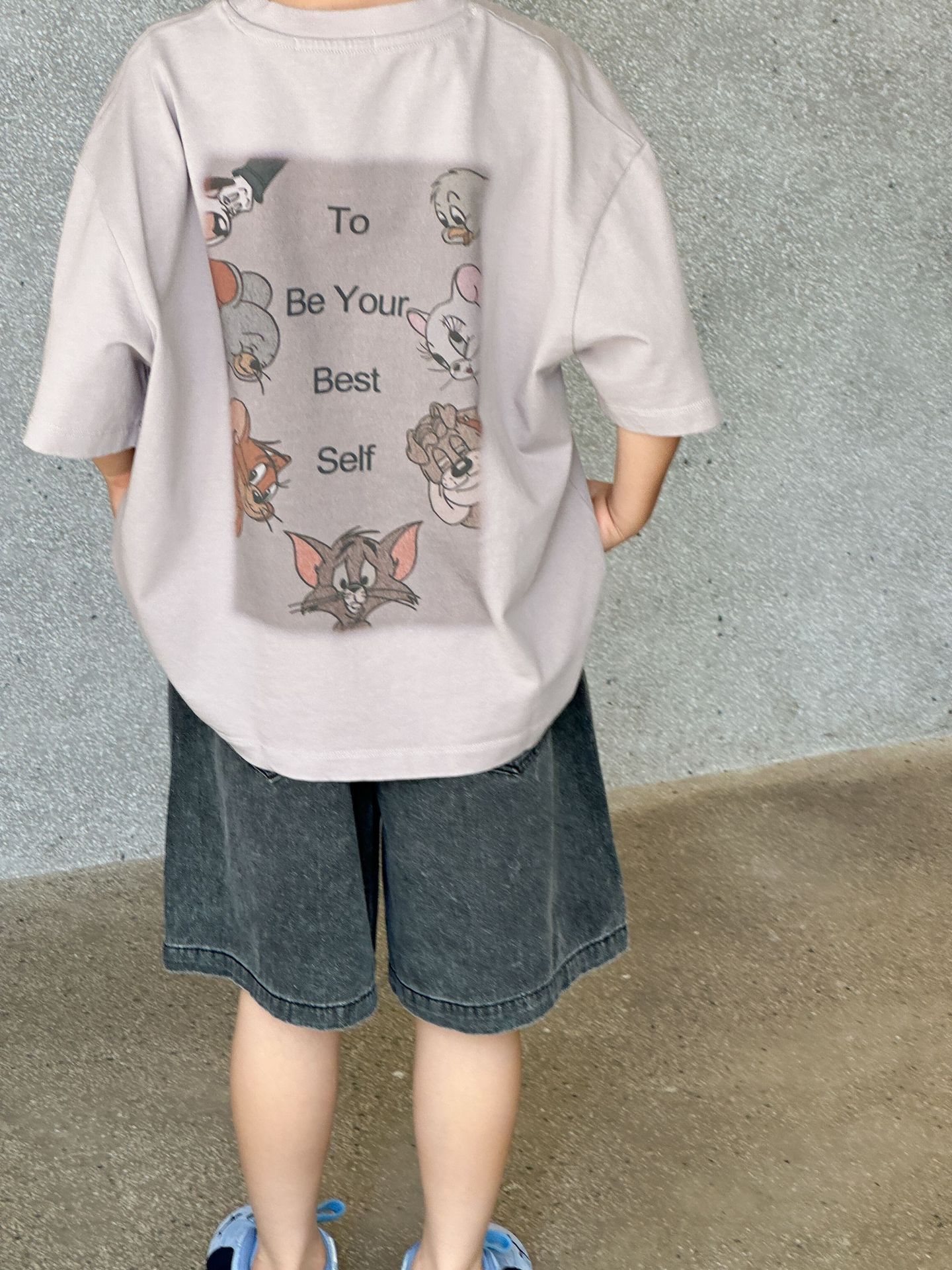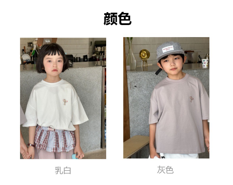 2025 새로운 여름 한국 스타일 어린이 순면 뒷면 프린트 반팔 소년과 소녀 캐주얼 루즈 다용도 티셔츠 유행스토어 가기