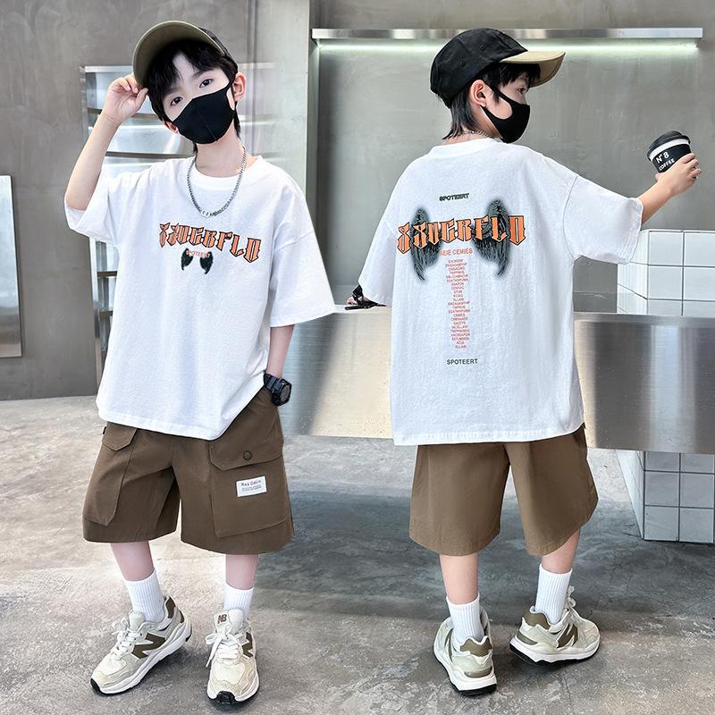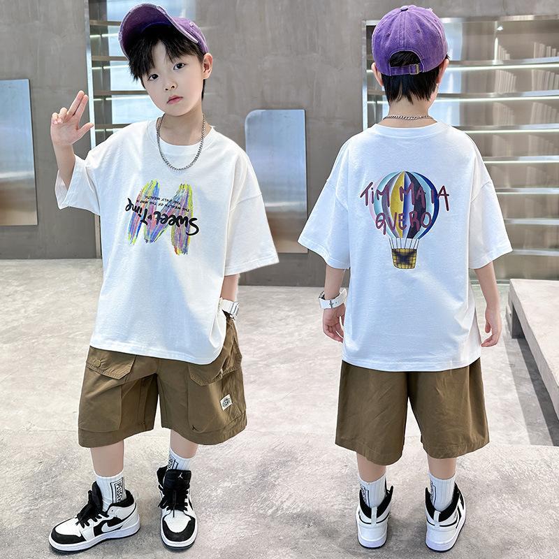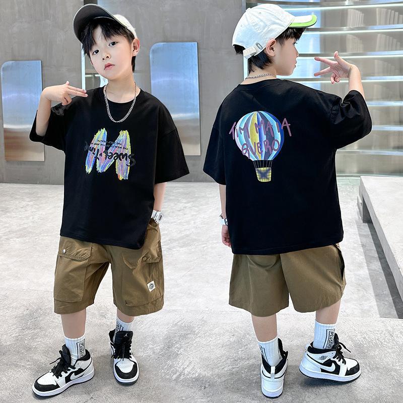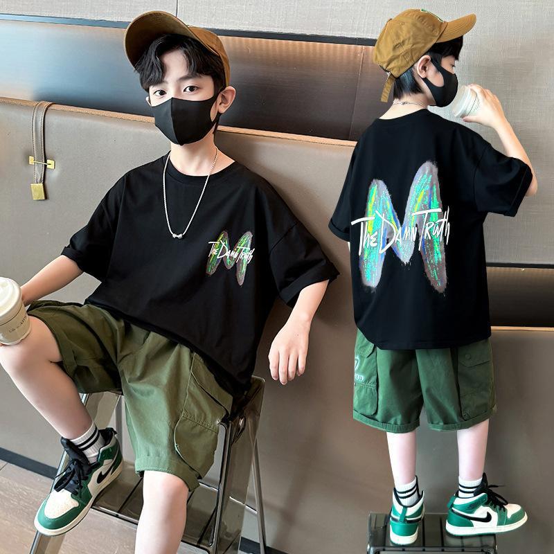 2025 새로운 여름 소년 순수 코튼 반팔 캐주얼 중대형 어린이 유행 및 잘 생긴 만화 인쇄 유행 짧은 T스토어 가기