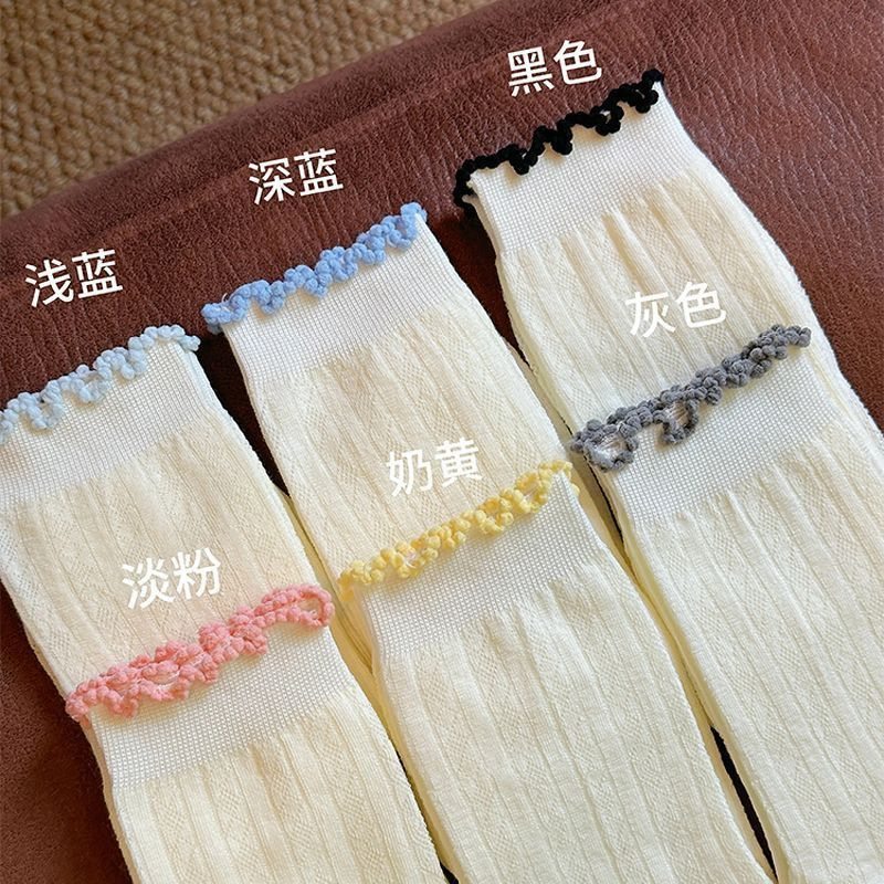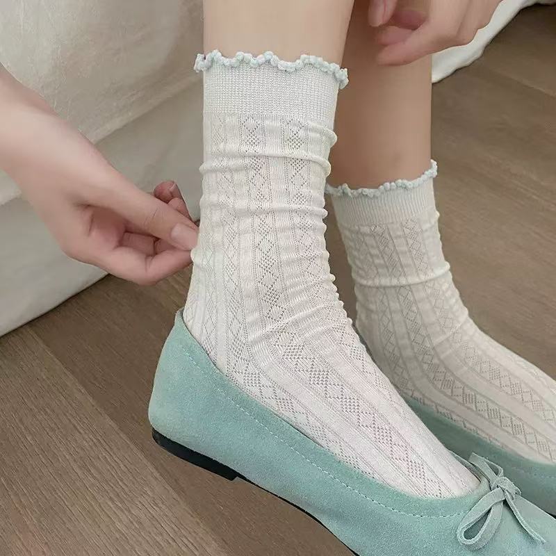 여름 여성용 크림색 양말, 컬러풀한 레이스 메쉬 중공 도파민 한국식 종아리 중간 트렌디한 다용도 양말스토어 가기