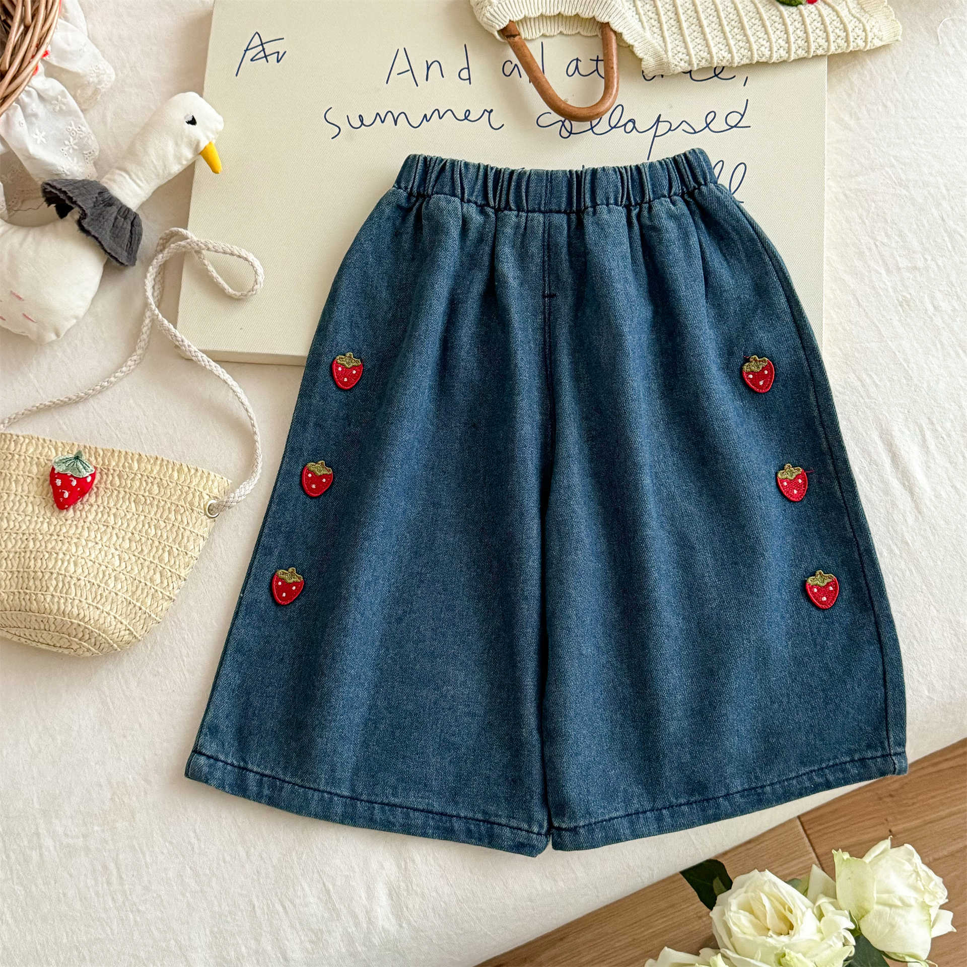핑크 하우스 소녀 여름 목가적 인 스타일 딸기 정장 새로운 스타일 아기 소녀 니트 중공 조끼 스트레이트 바지