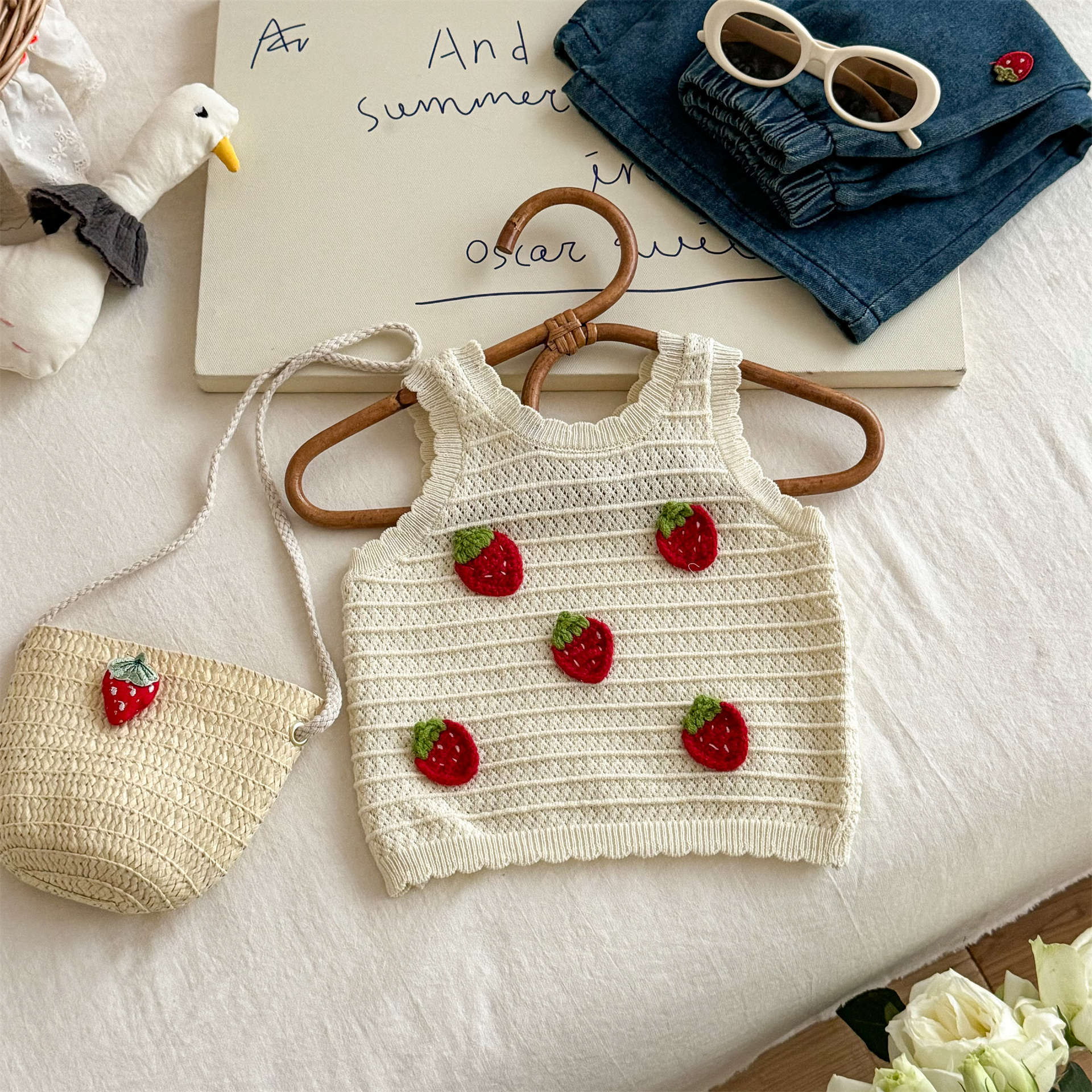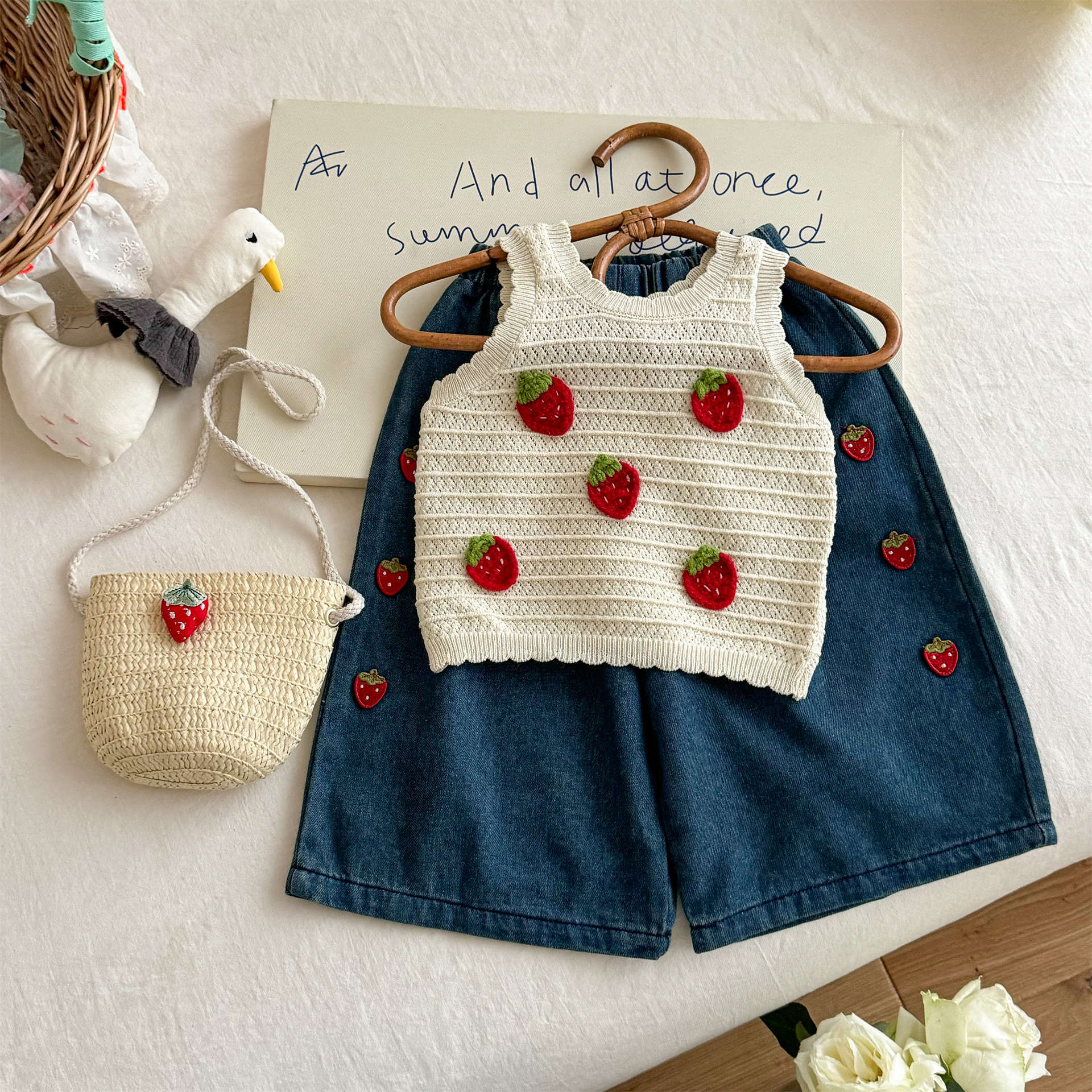 핑크 하우스 소녀 여름 목가적 인 스타일 딸기 정장 새로운 스타일 아기 소녀 니트 중공 조끼 스트레이트 바지스토어 가기