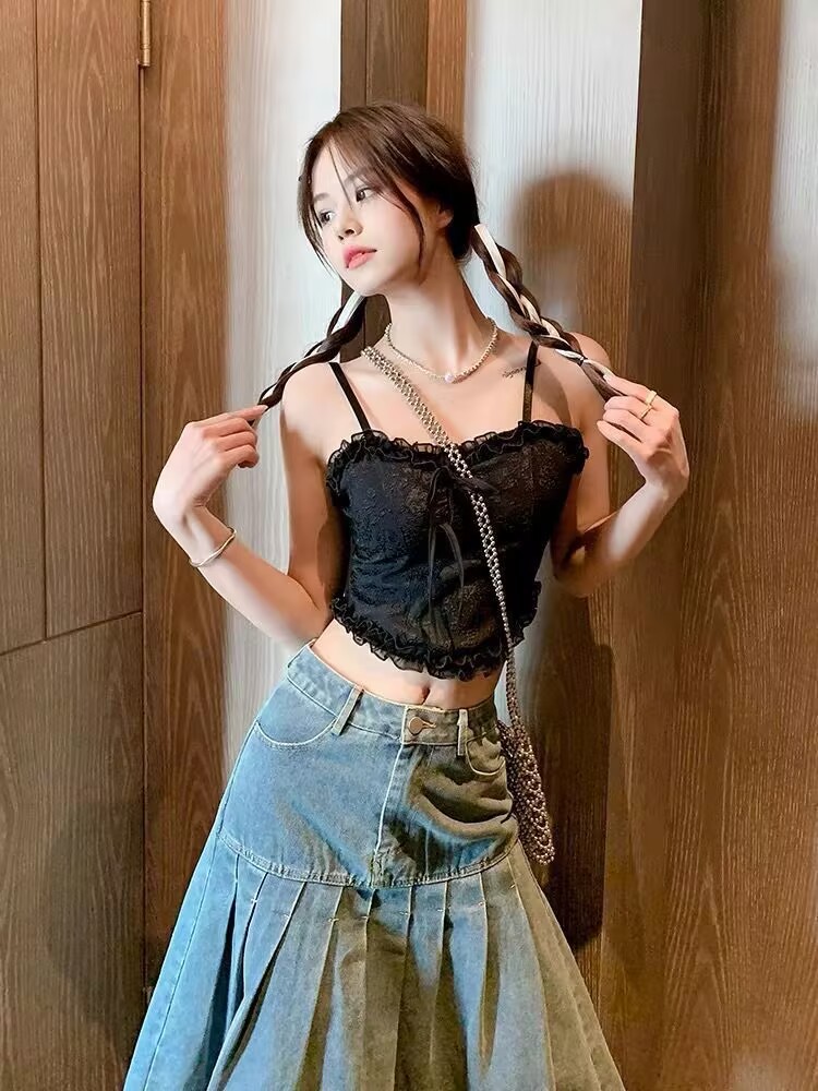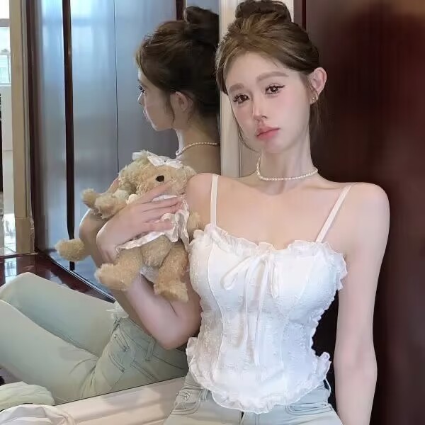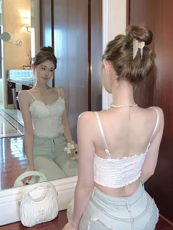 가슴 패드와 아름다운 등 자수가 있는 새로운 순수한 욕망 스타일, 다용도 레이스 멜빵, 편안하고 섹시한 여성용 가슴 리본 튜브 탑