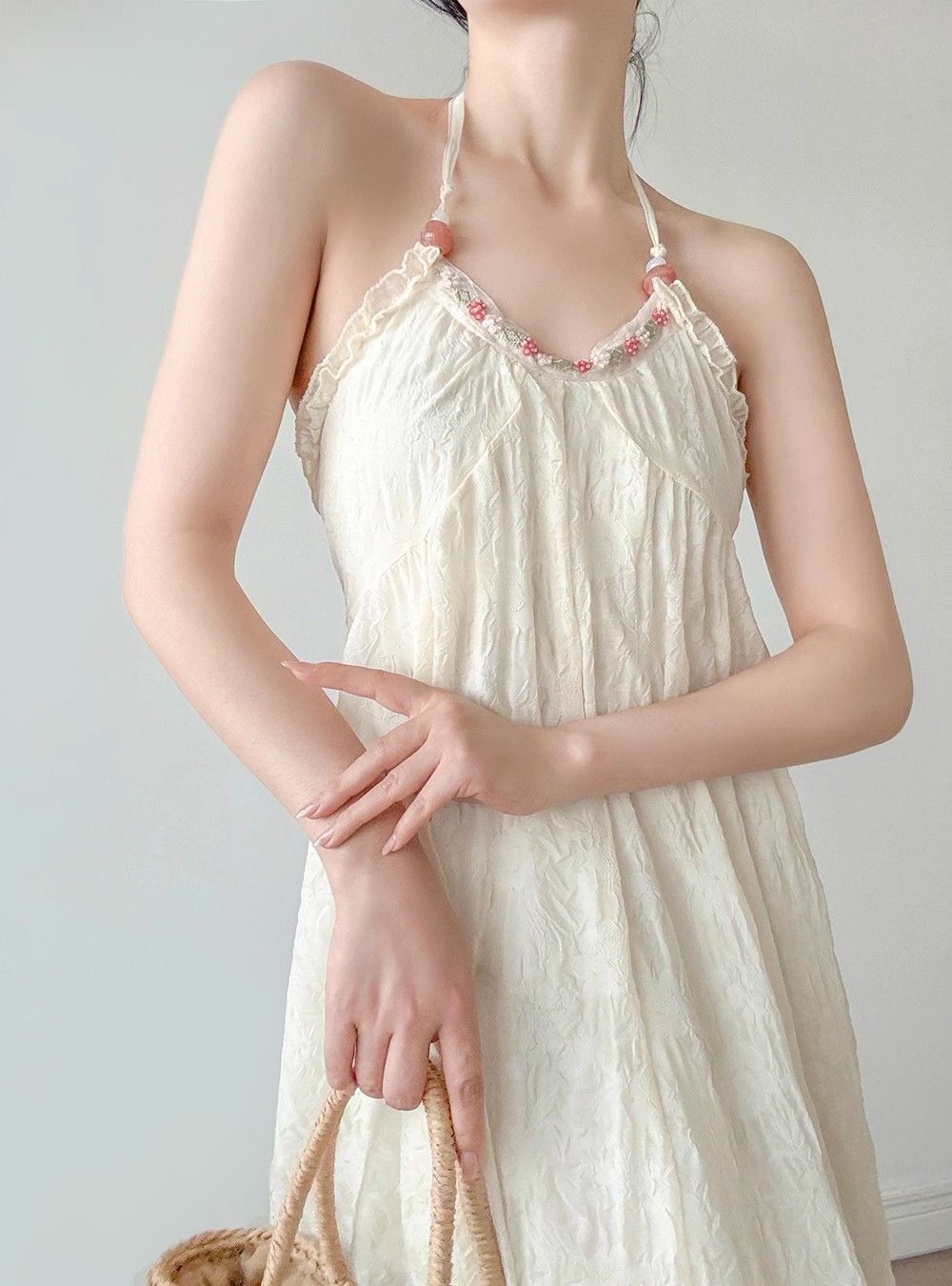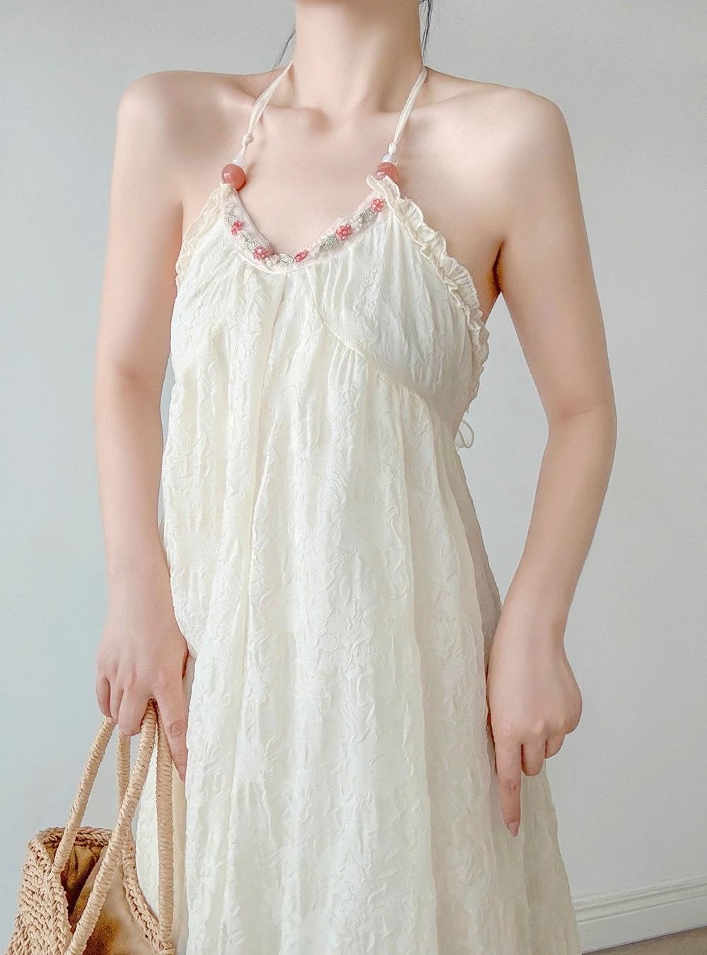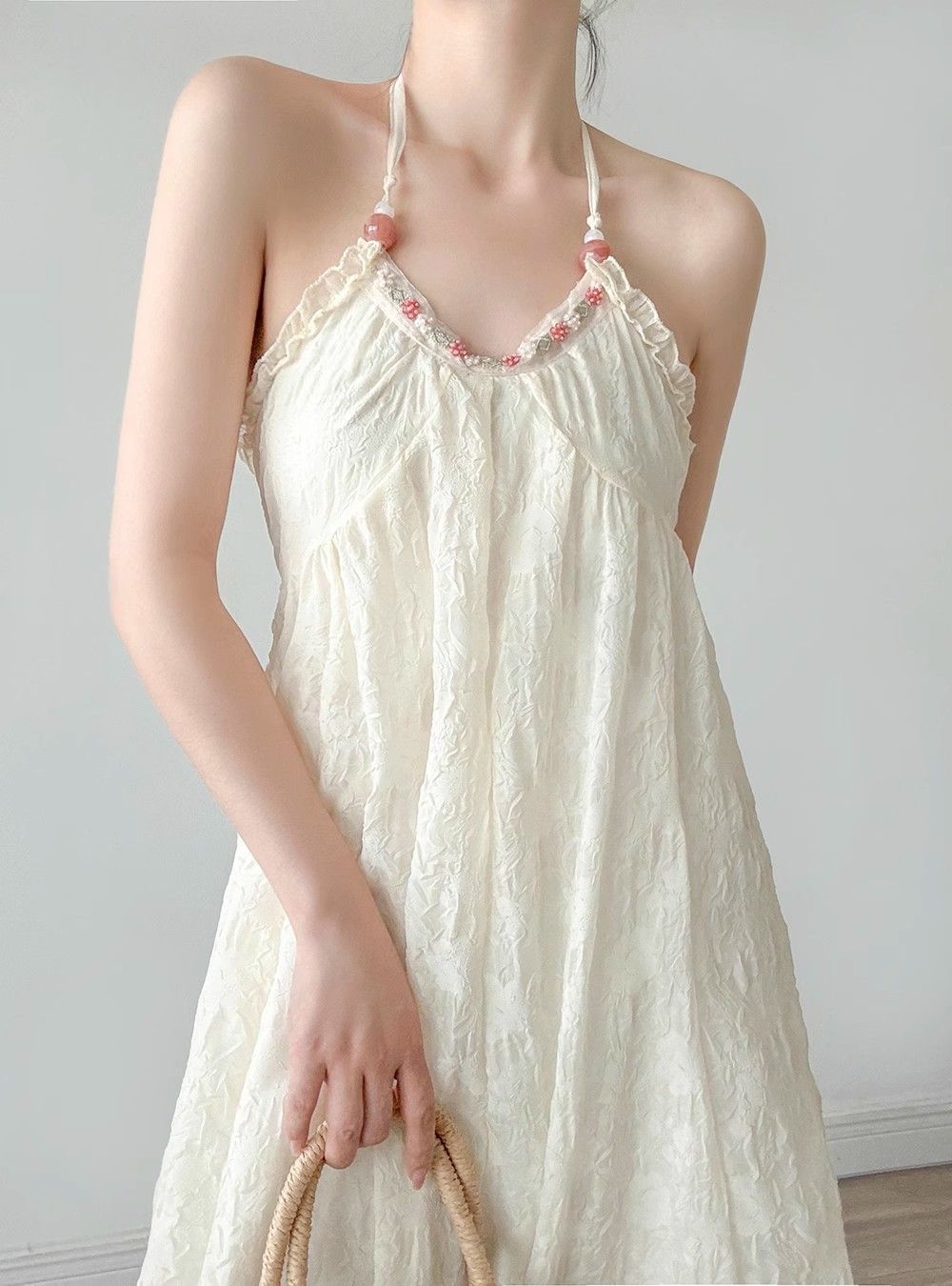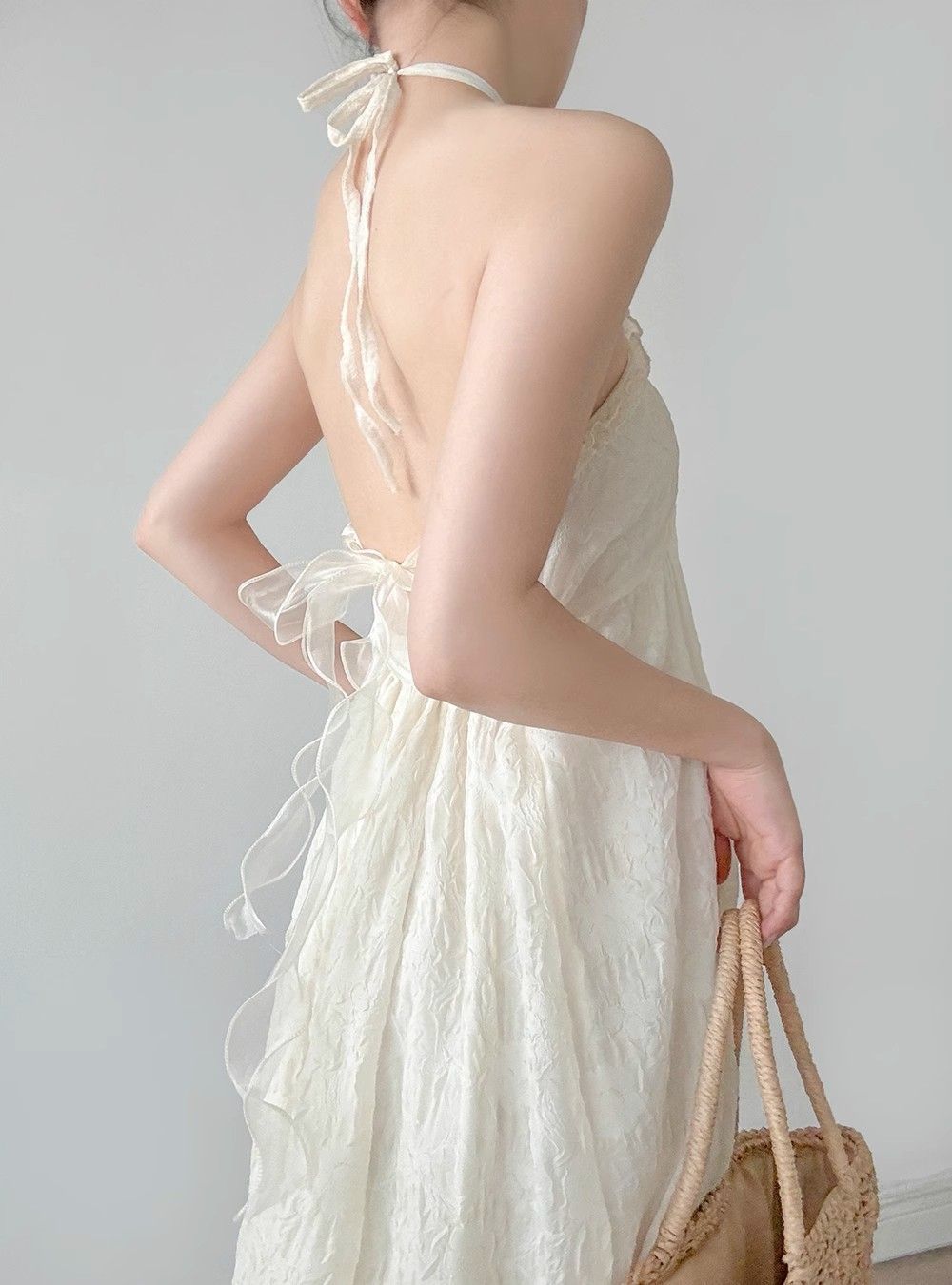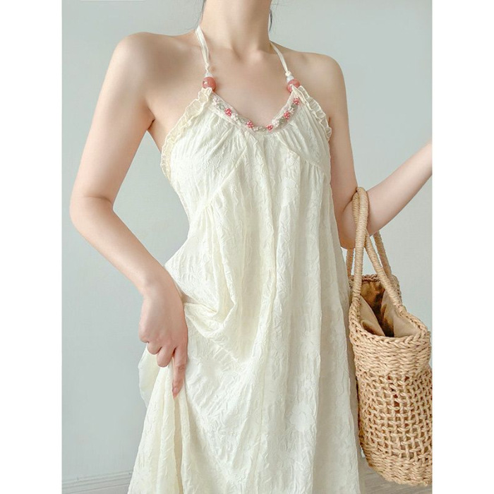 순수한 욕망 달콤한 백리스 홀터넥 서스펜더 드레스 여성 여름 새로운 슈퍼 요정 프랑스 해변 휴가 쉬폰 스커트스토어 가기