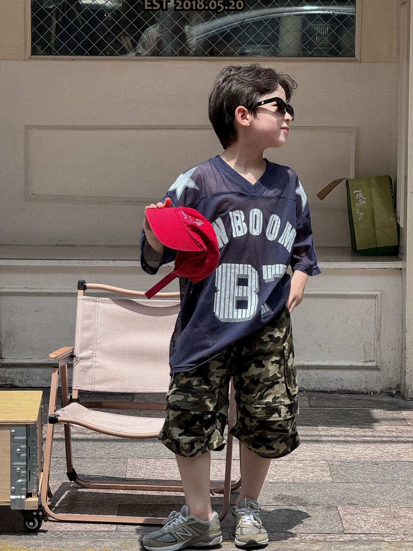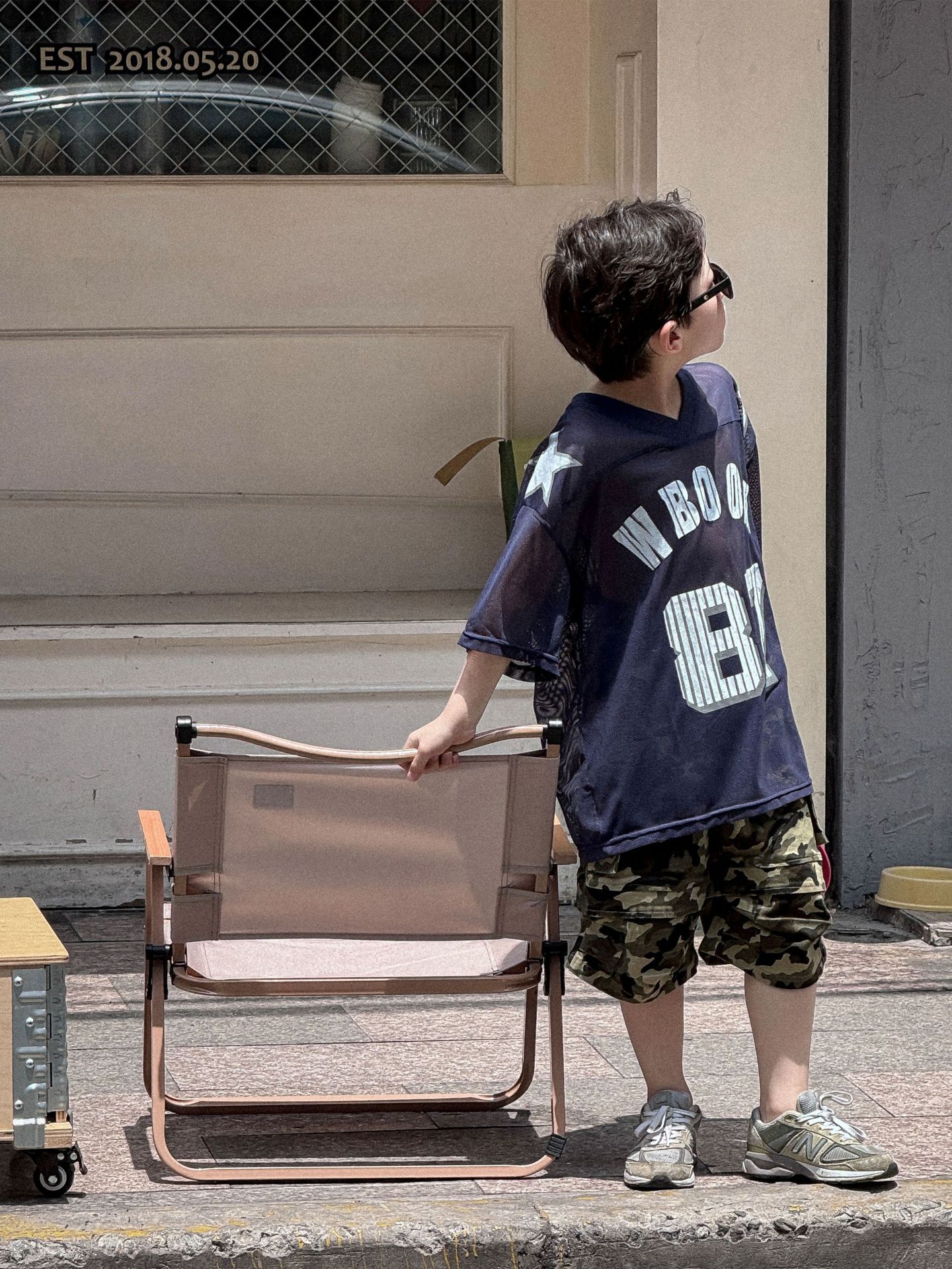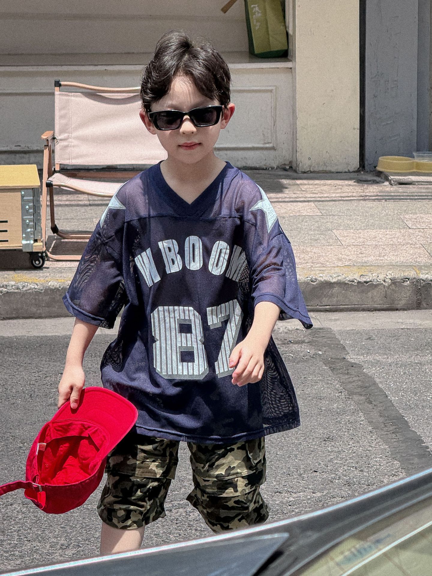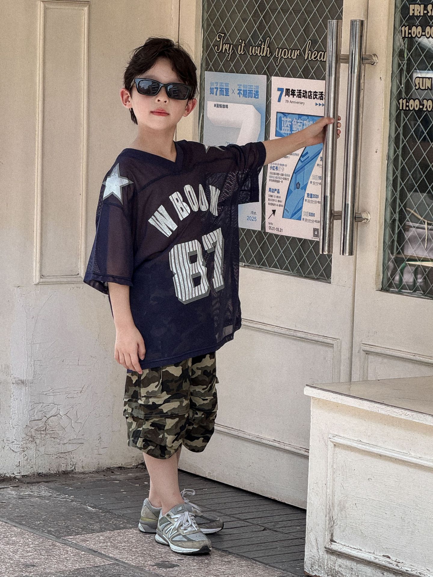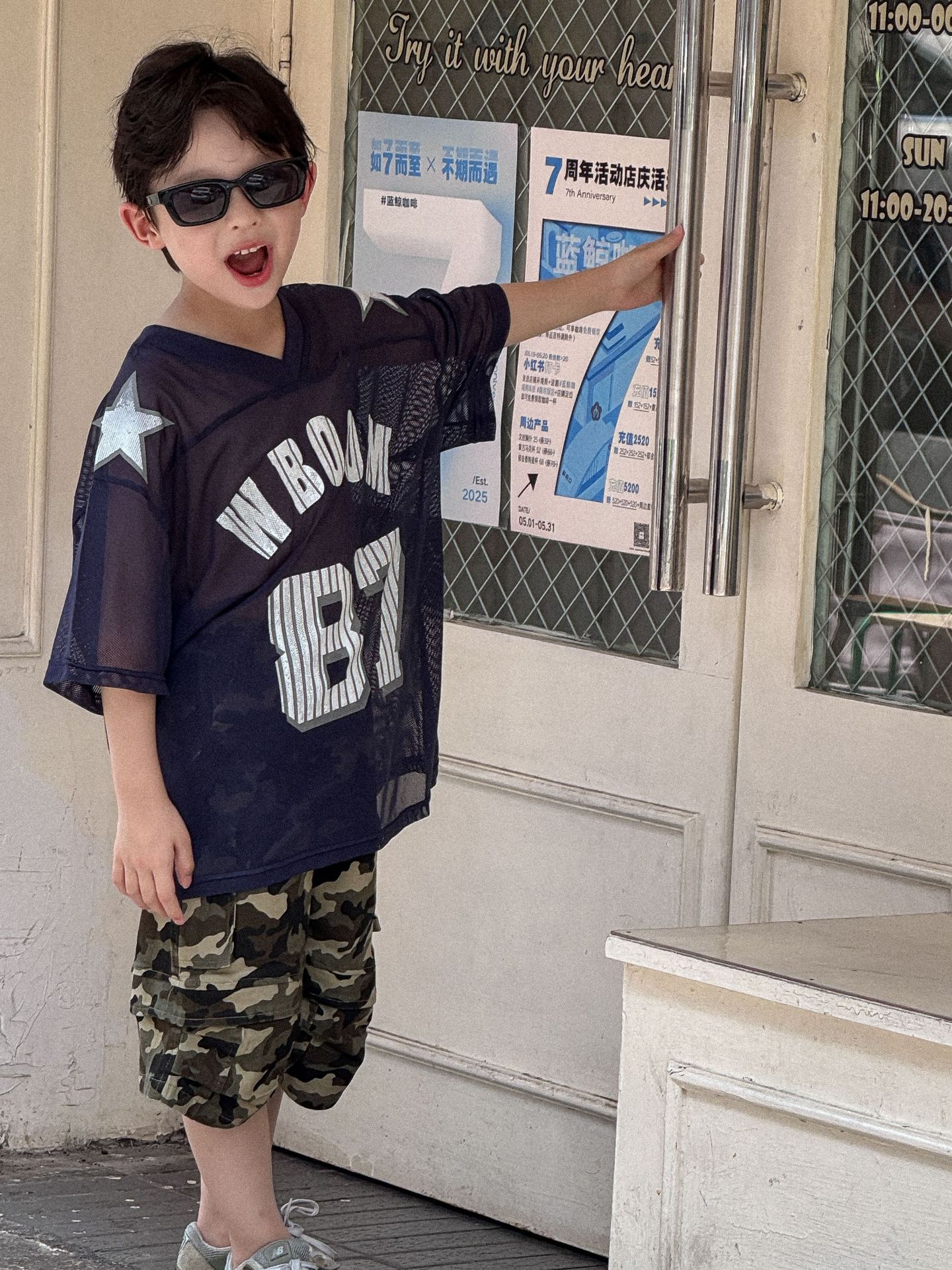 Lan Yu 25 여름 한국 아동복 중소 어린이 소년 편지 인쇄 스포츠 저지 할로우 V-넥 메쉬 짧은 소매