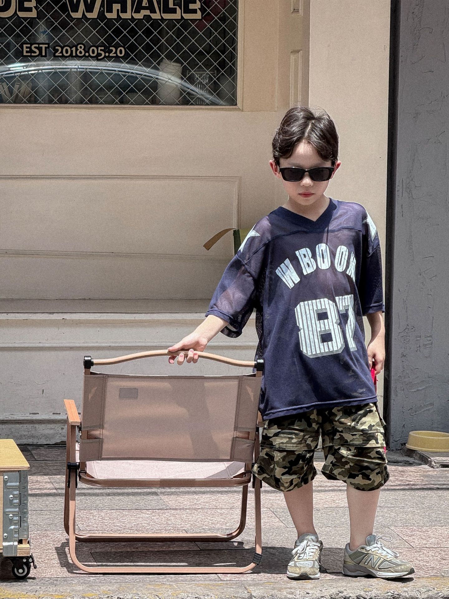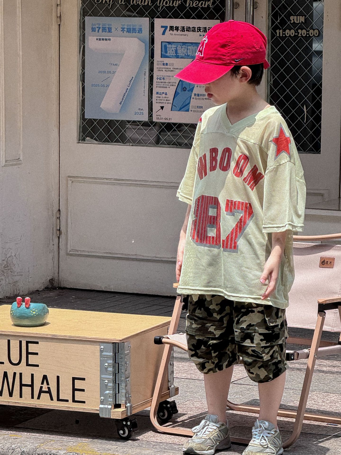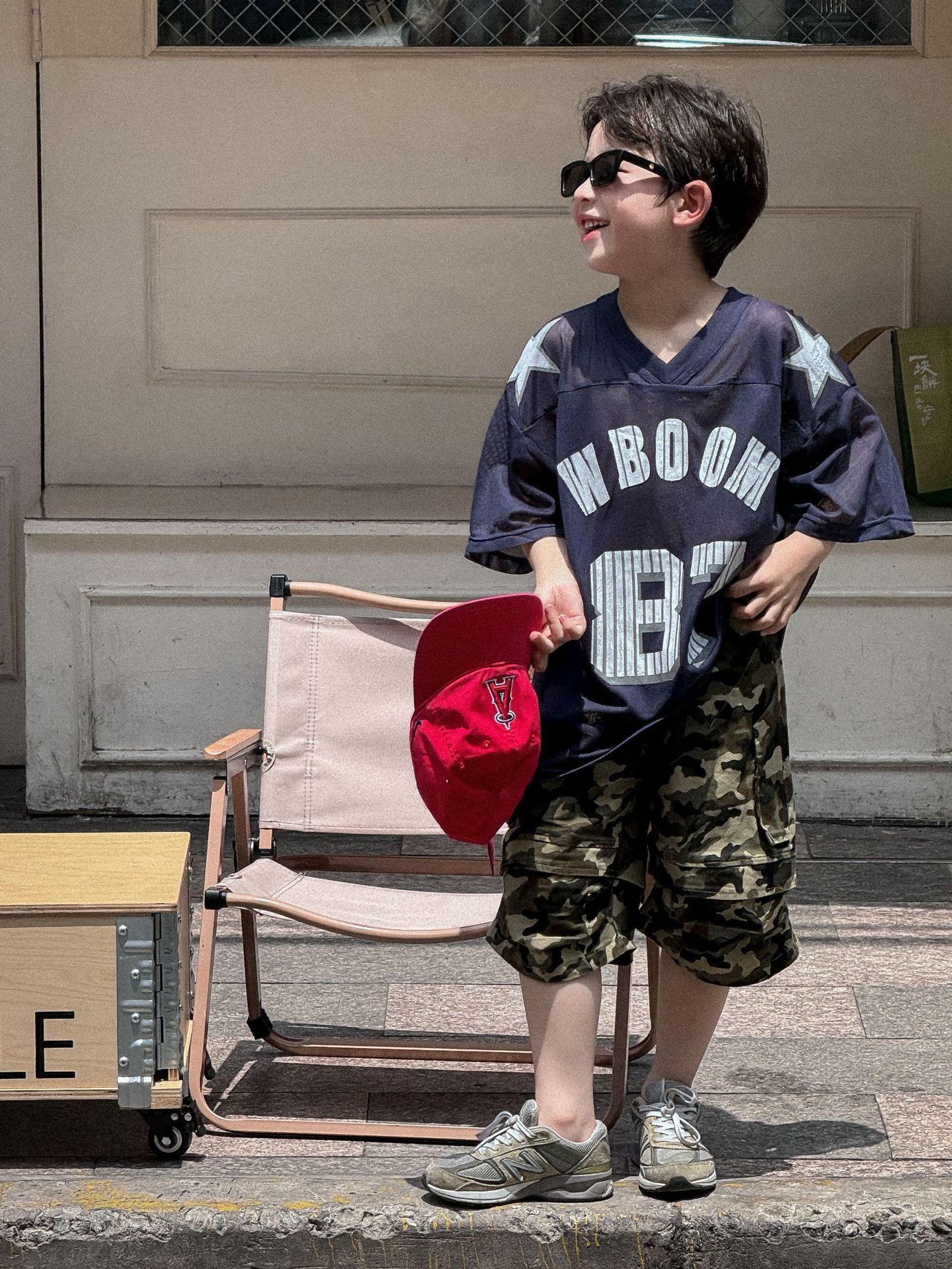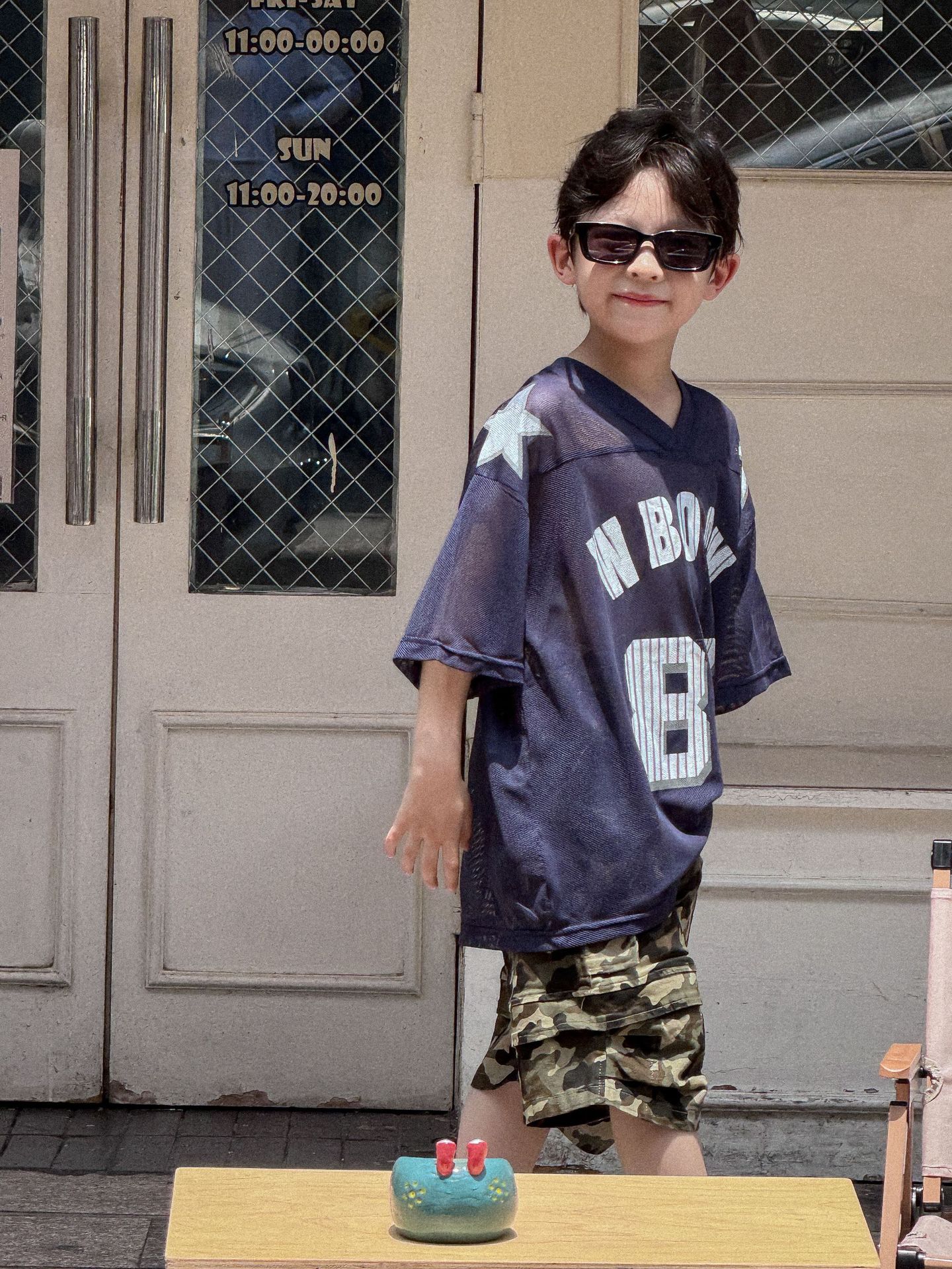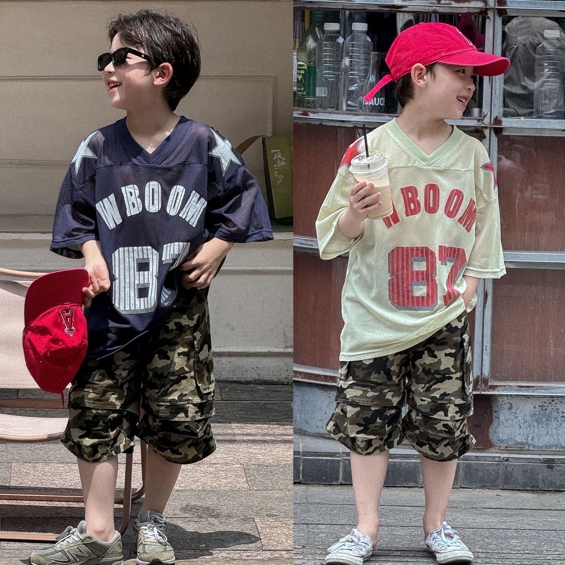Lan Yu 25 여름 한국 아동복 중소 어린이 소년 편지 인쇄 스포츠 저지 할로우 V-넥 메쉬 짧은 소매