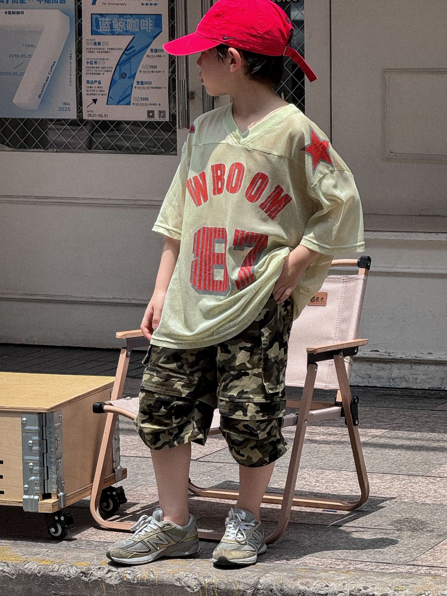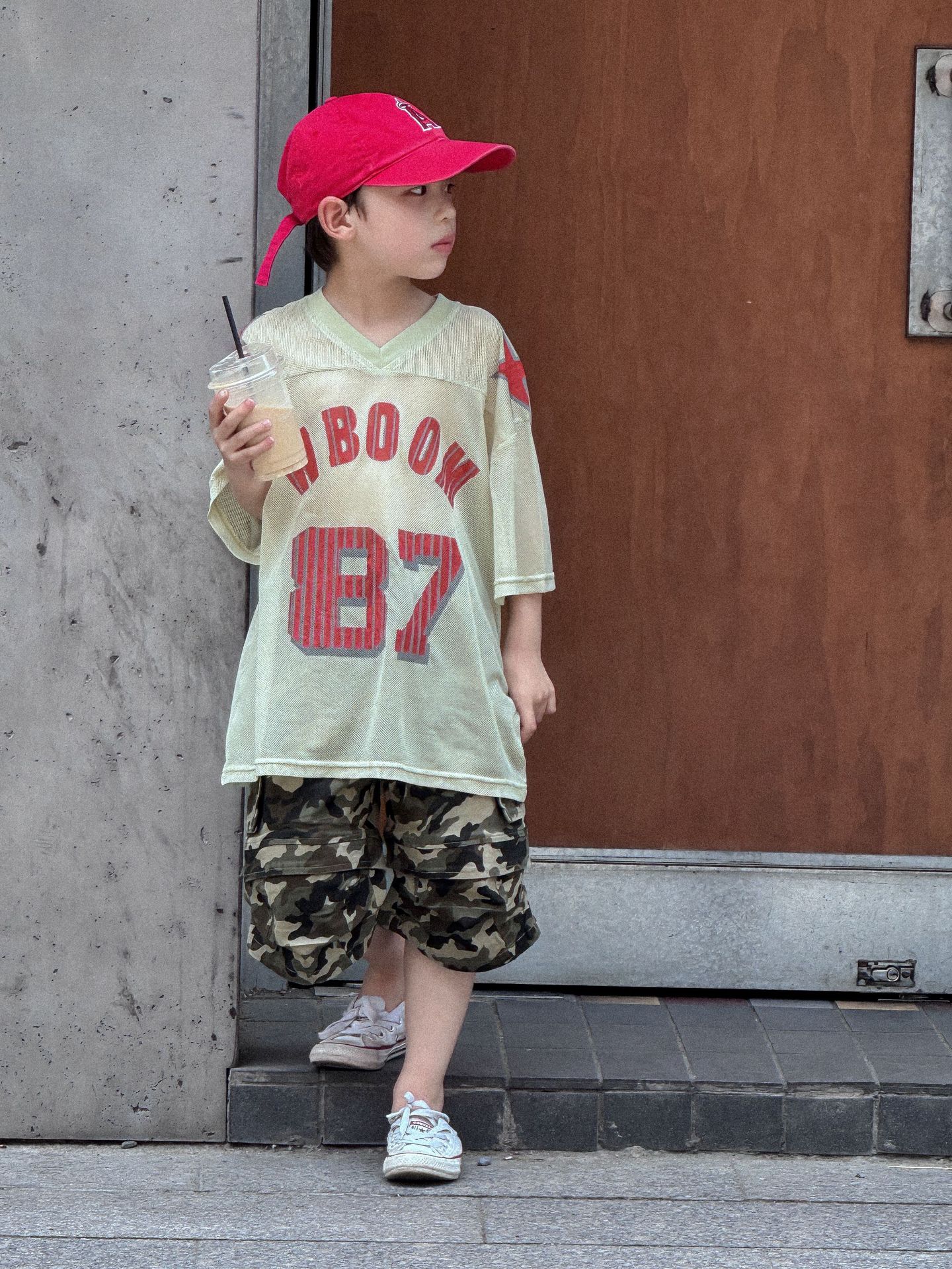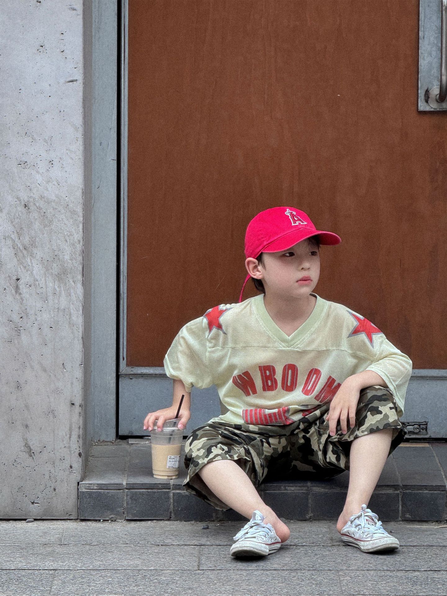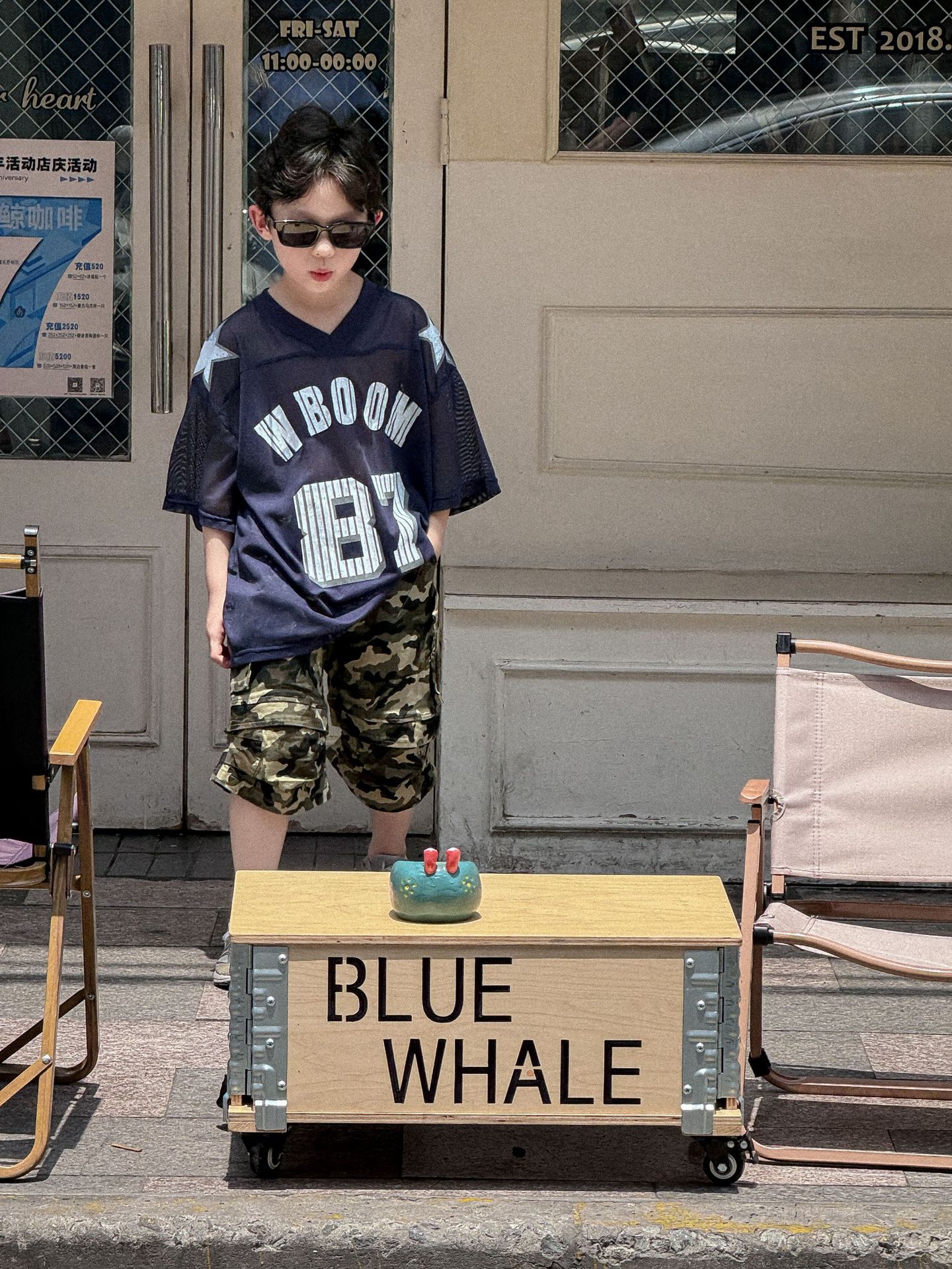 Lan Yu 25 여름 한국 아동복 중소 어린이 소년 편지 인쇄 스포츠 저지 할로우 V-넥 메쉬 짧은 소매