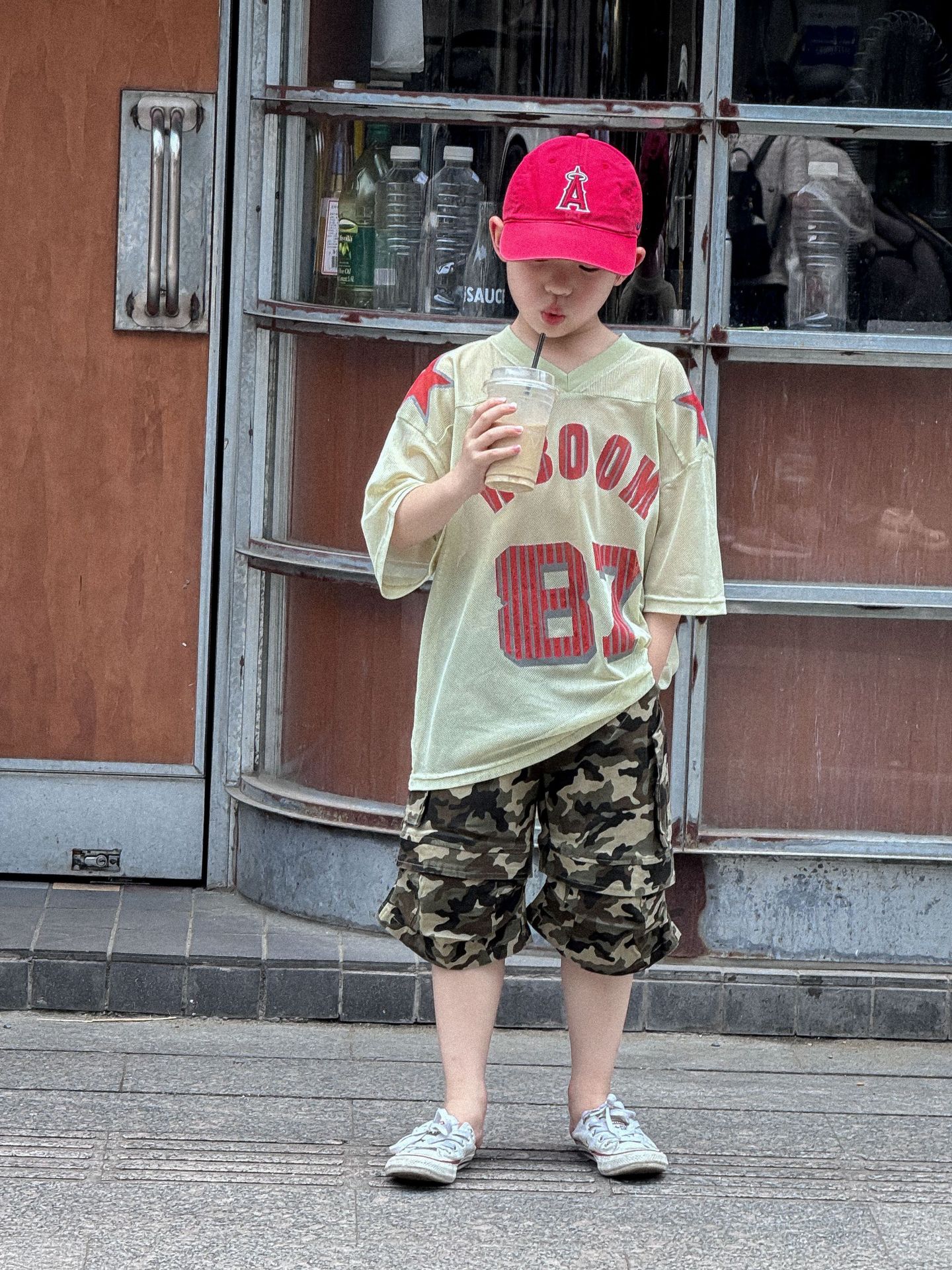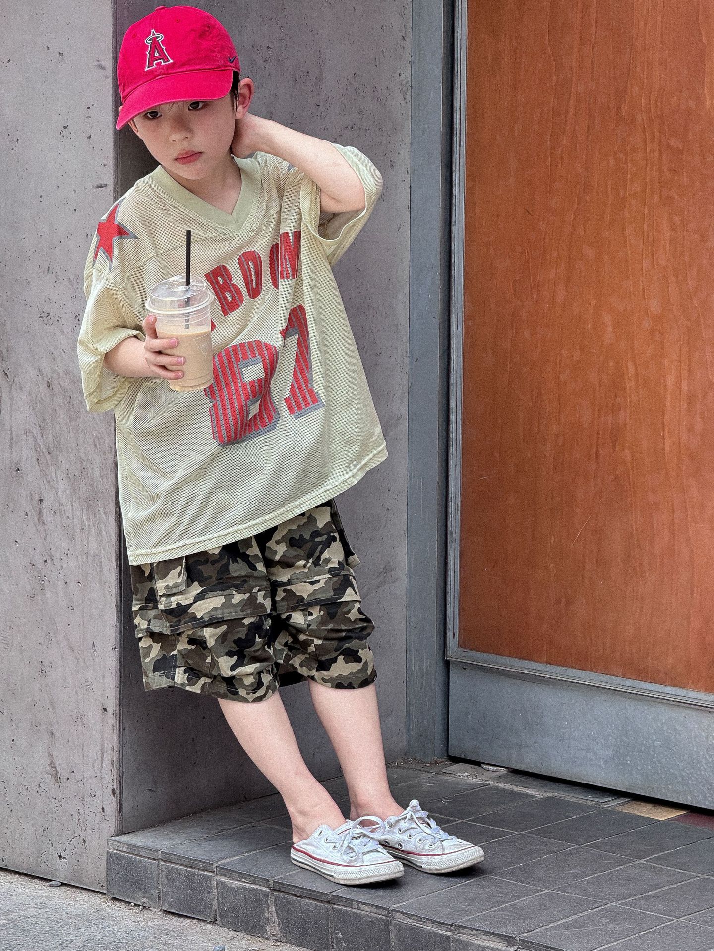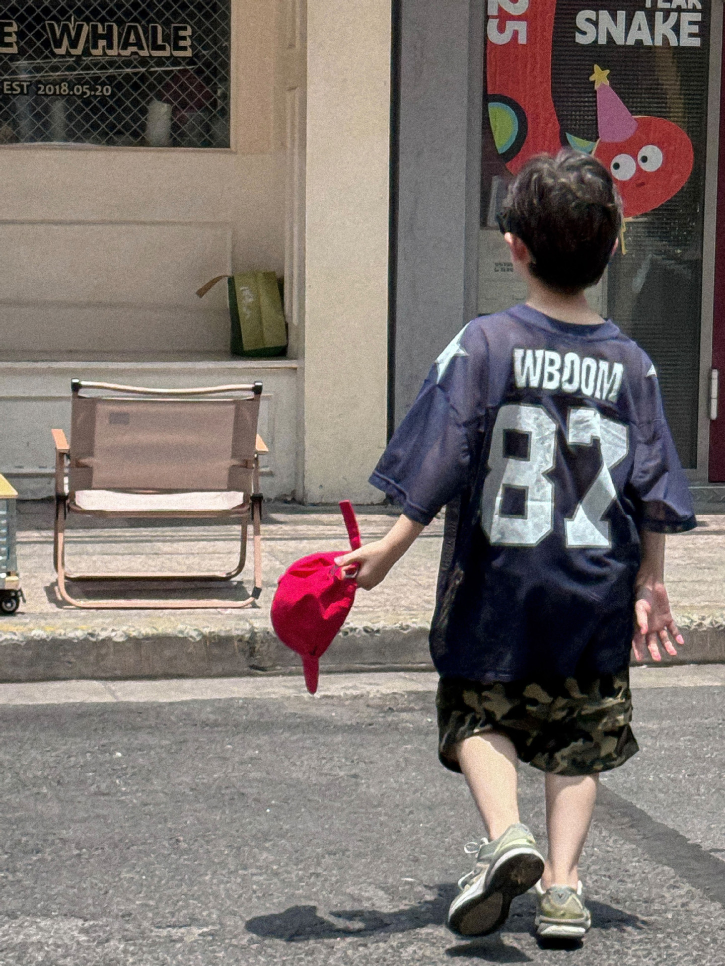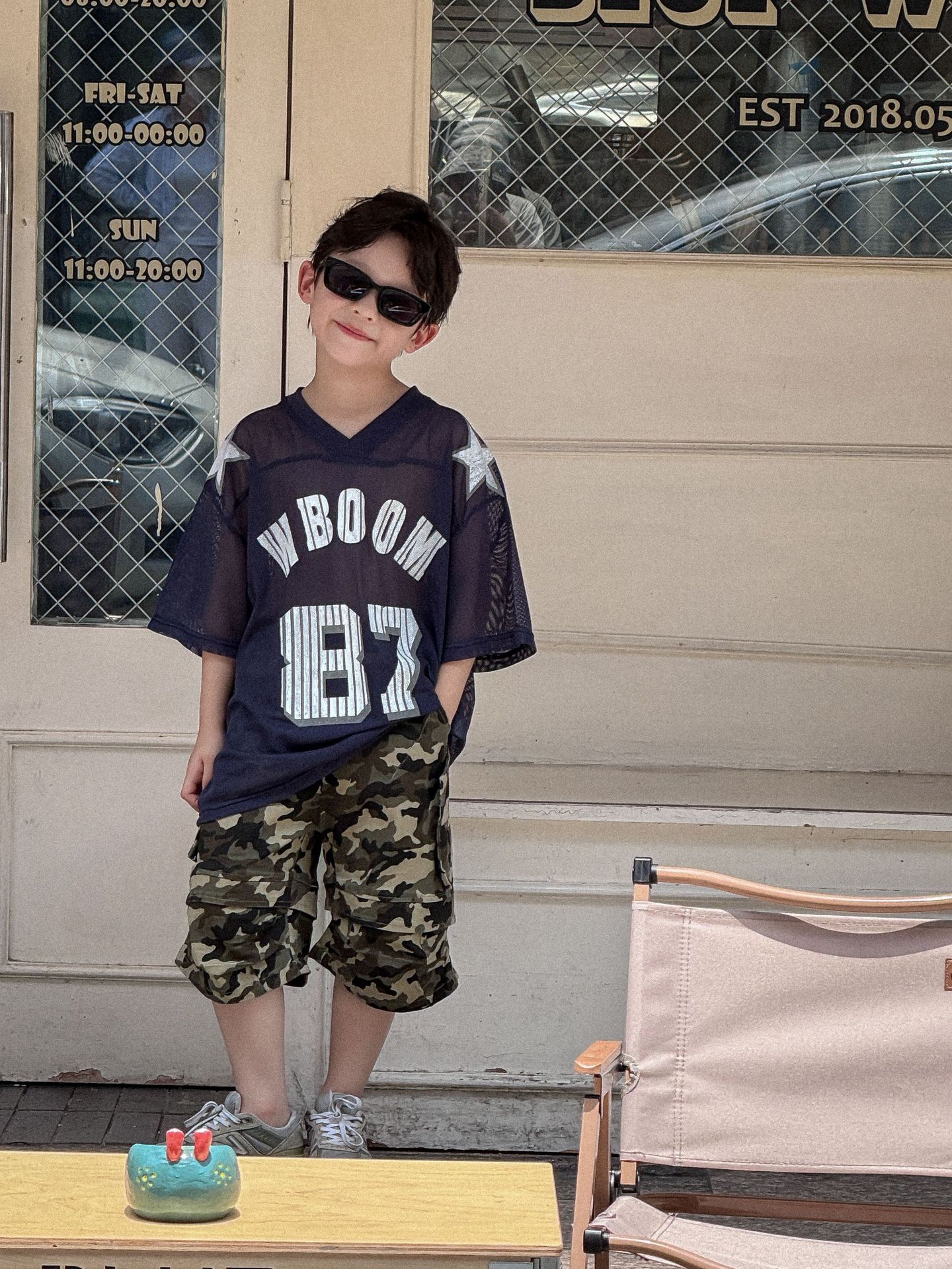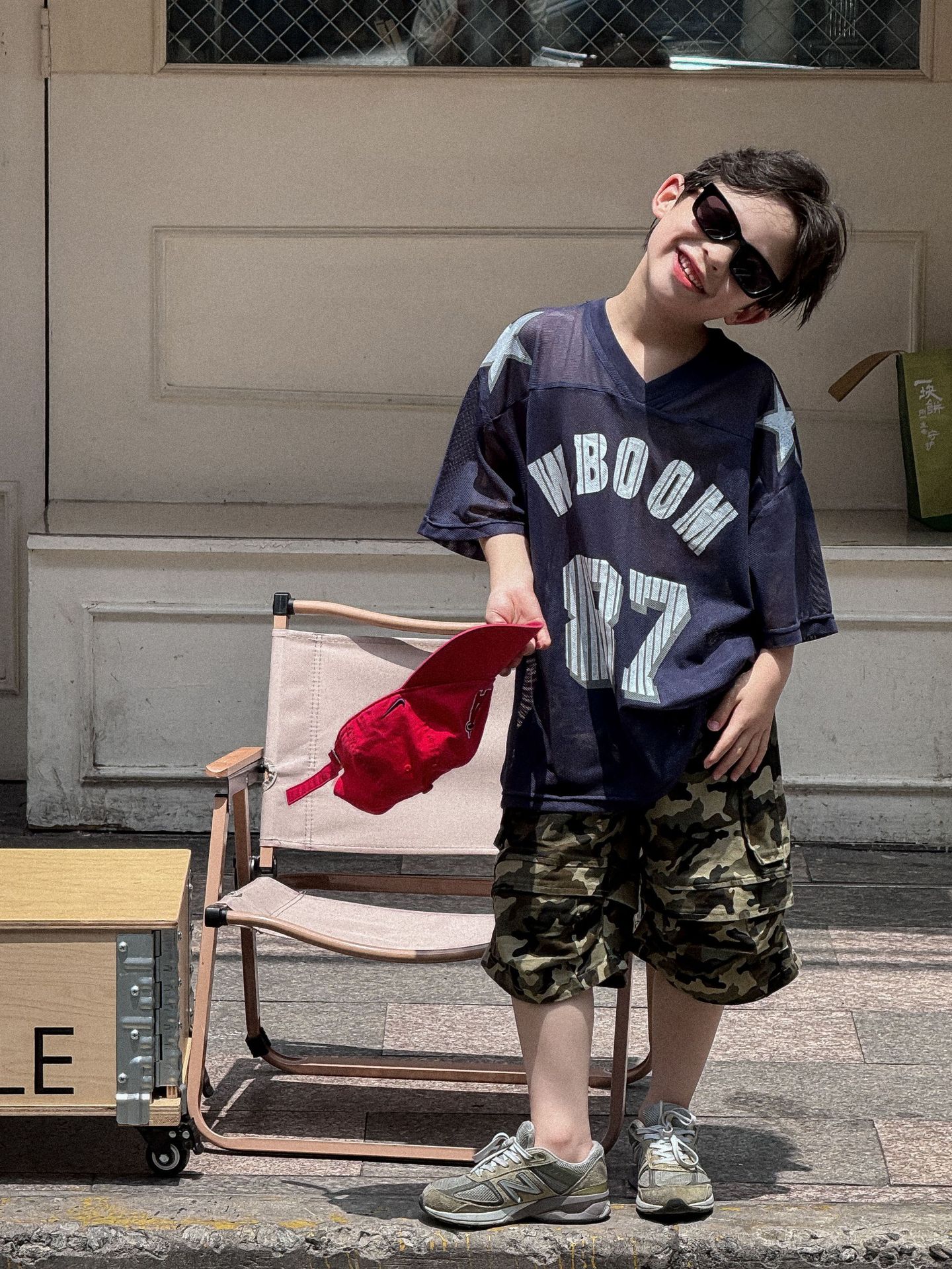 Lan Yu 25 여름 한국 아동복 중소 어린이 소년 편지 인쇄 스포츠 저지 할로우 V-넥 메쉬 짧은 소매
