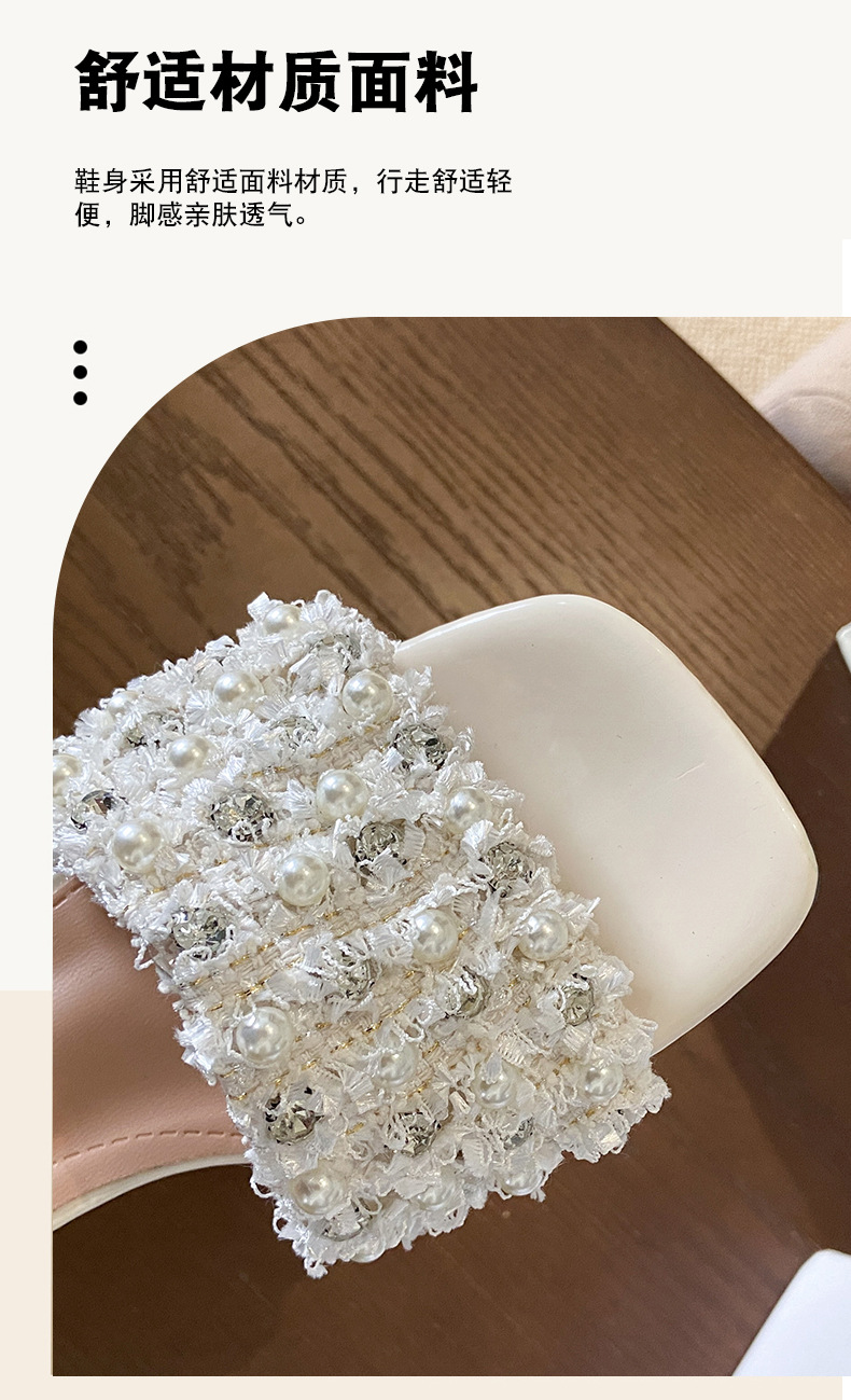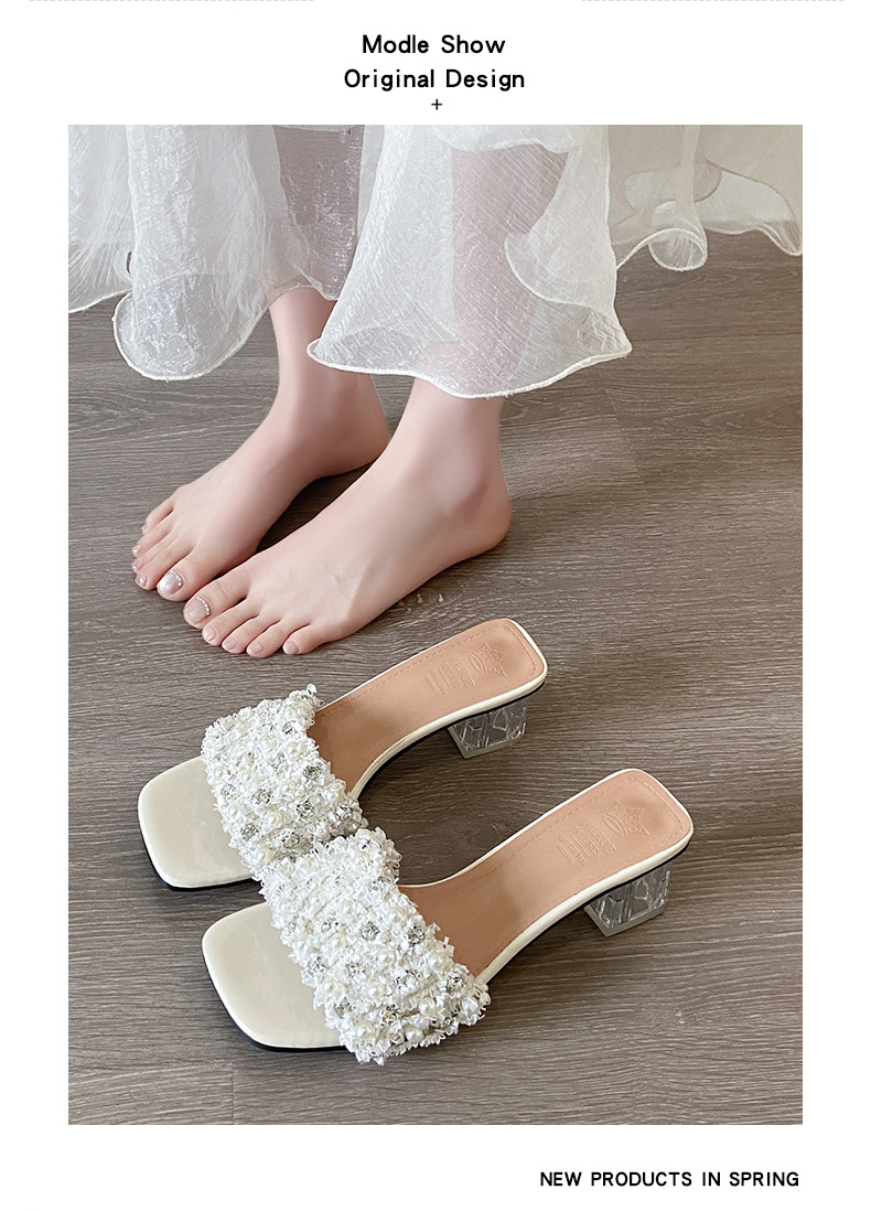 여름 2025 여성을 위한 Xiaoxiangfeng 두꺼운 굽 슬리퍼 새로운 진주 인터넷 연예인 패션 미드 힐 프렌치 샌들