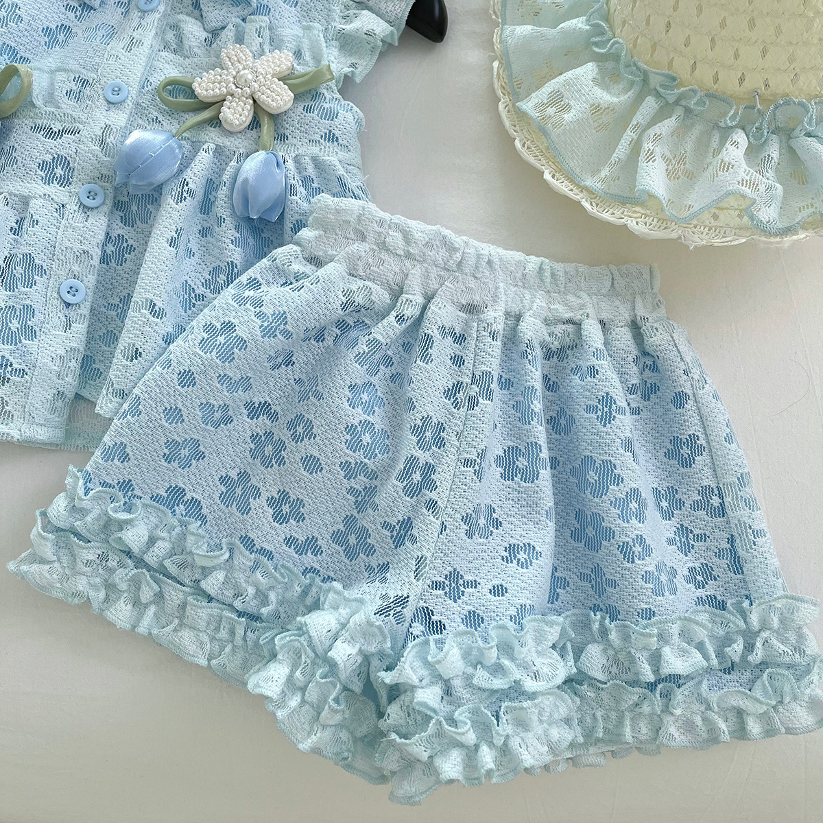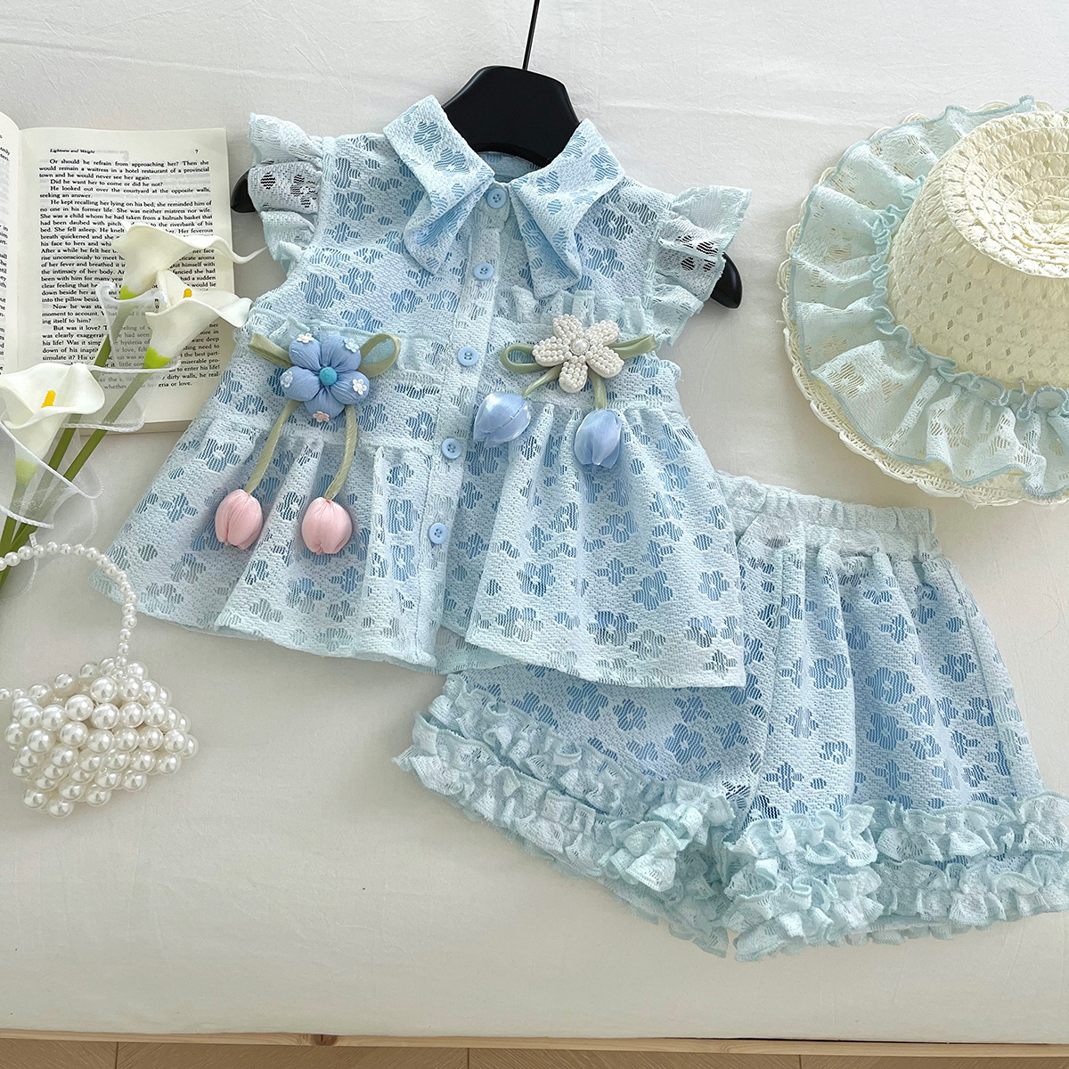 신제품 아동복 한국식 여아 패션 꽃조끼 상의 꽃봉오리 반바지 상큼한 투피스 세트 모자 포함