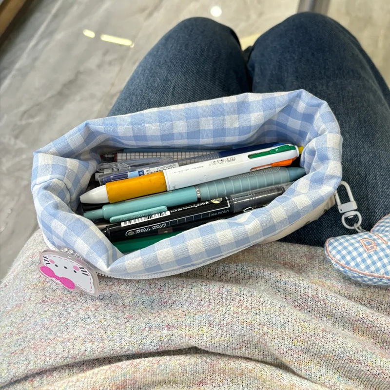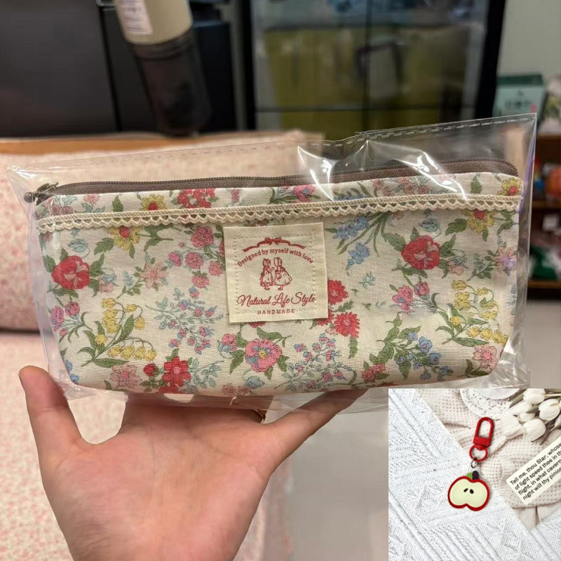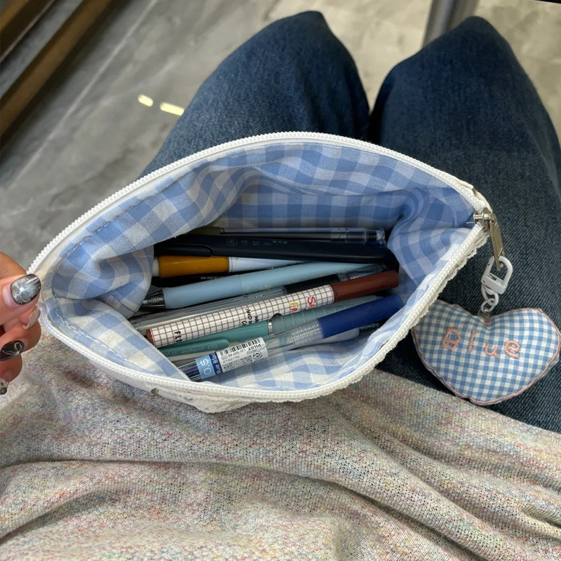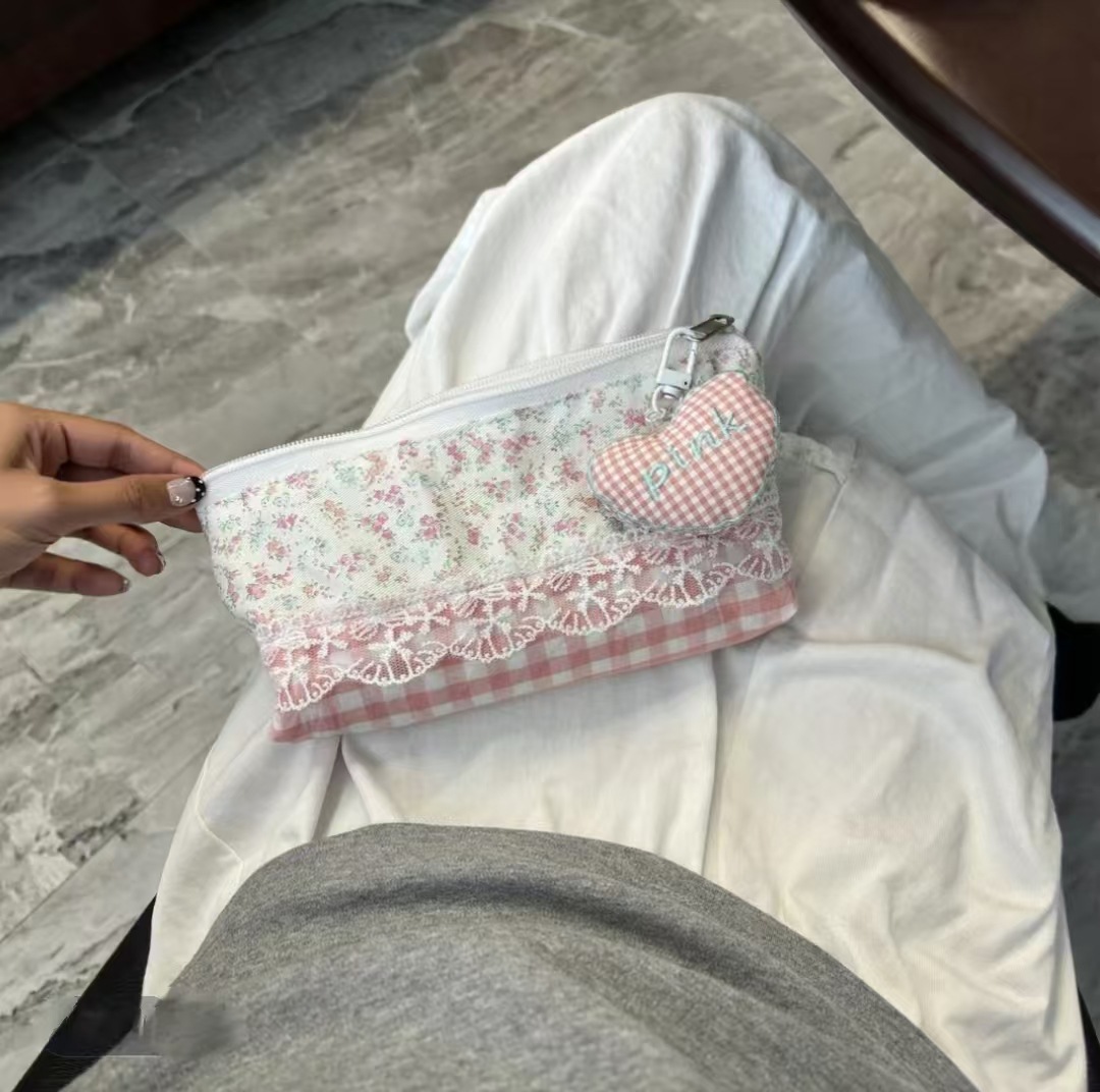 • 체크무늬 꽃무늬 레이스 스티치 필통 + 펜던트