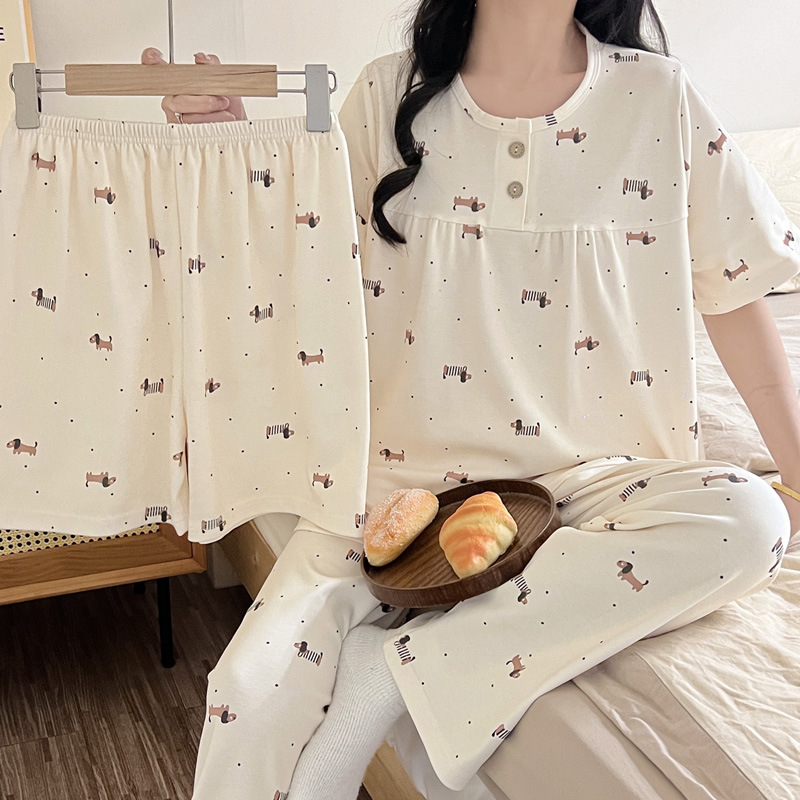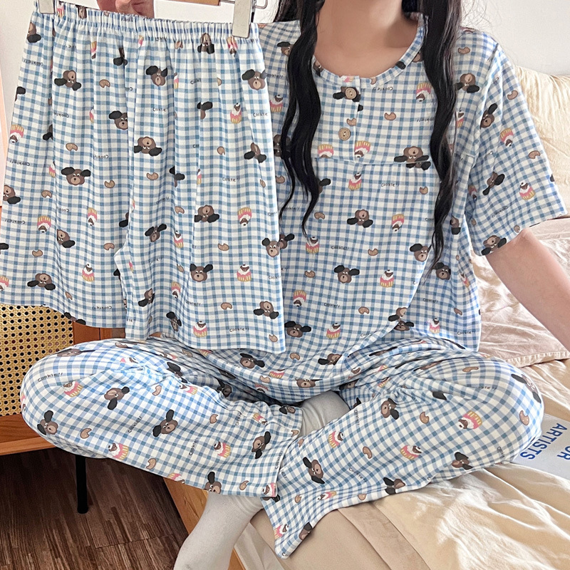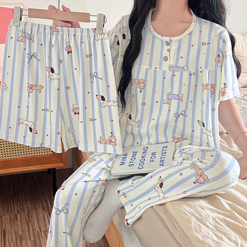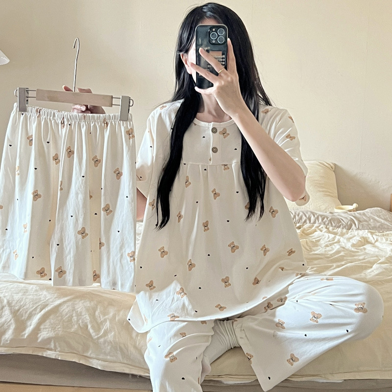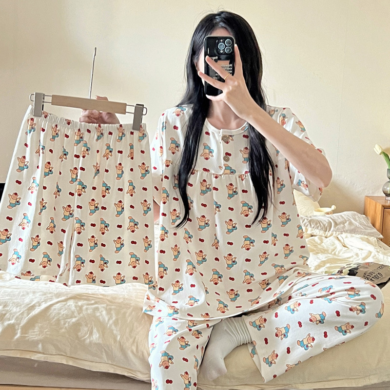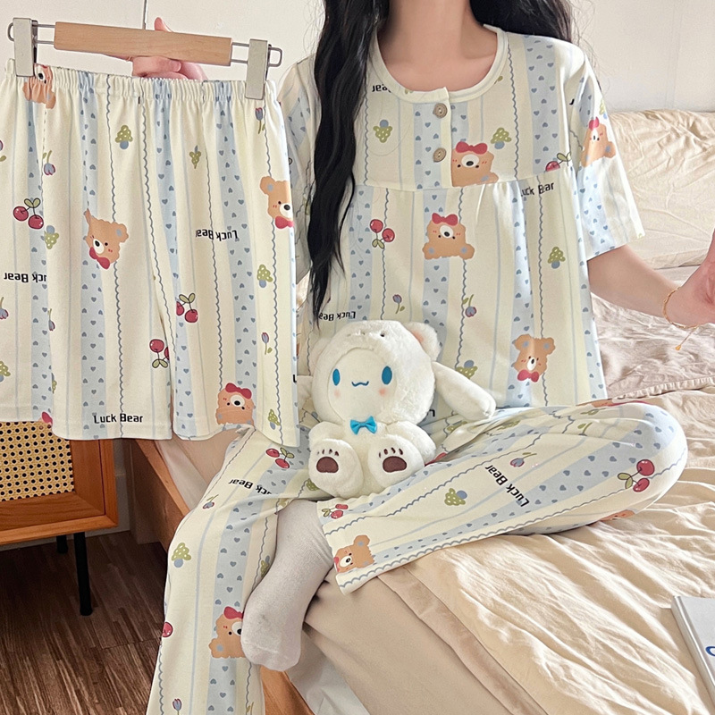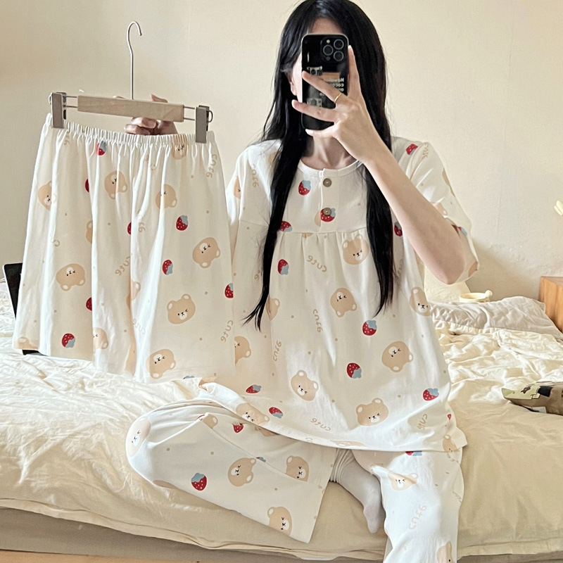 여성용 잠옷 여름 새 모조 면화 반팔 반바지와 바지 3 피스 세트 만화 달콤한 홈웨어는 정장 외부에 착용 가능스토어 가기