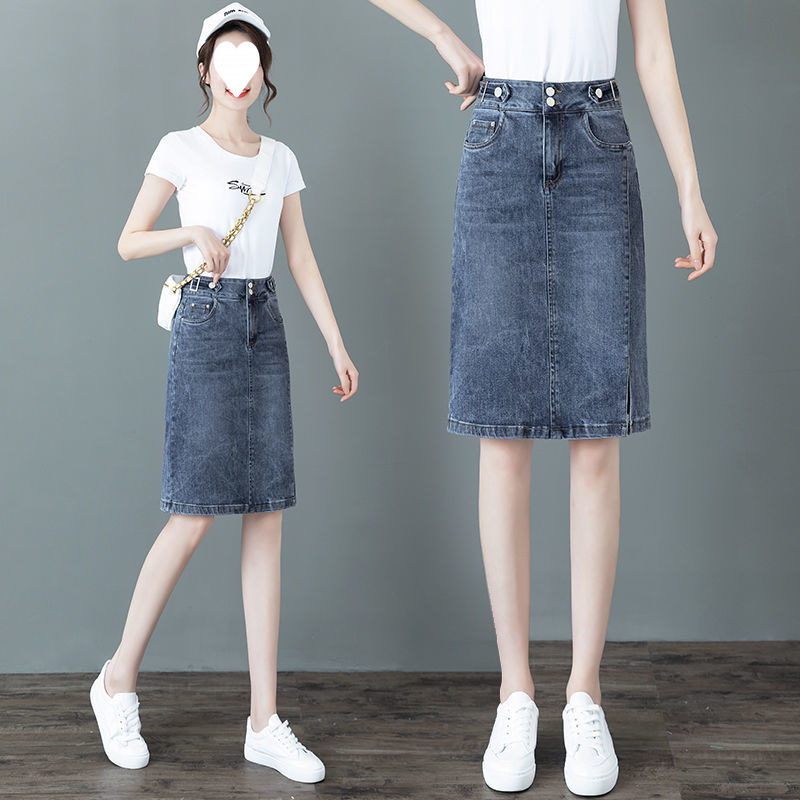2021 새로운 슬림 데님 스커트 여성용 다용도 하이 웨이스트 중간 길이 A 라인 스커트스토어 가기